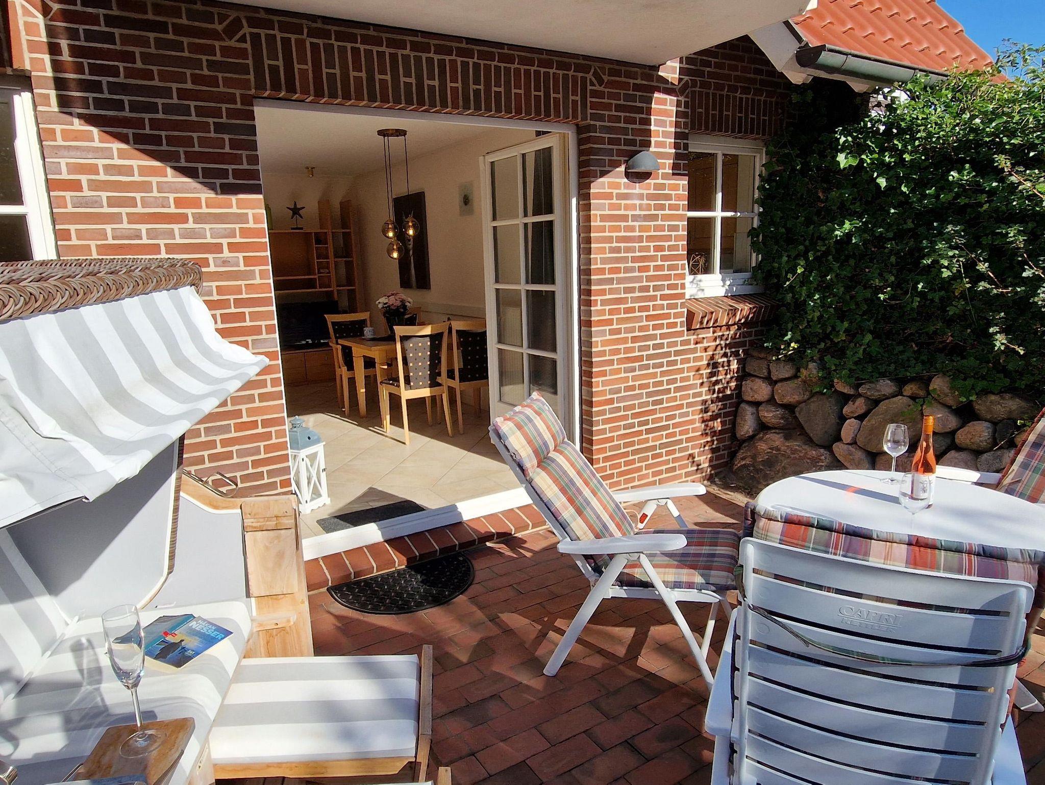 • Terrasse mit Gartenmöbeln und Strandkorb