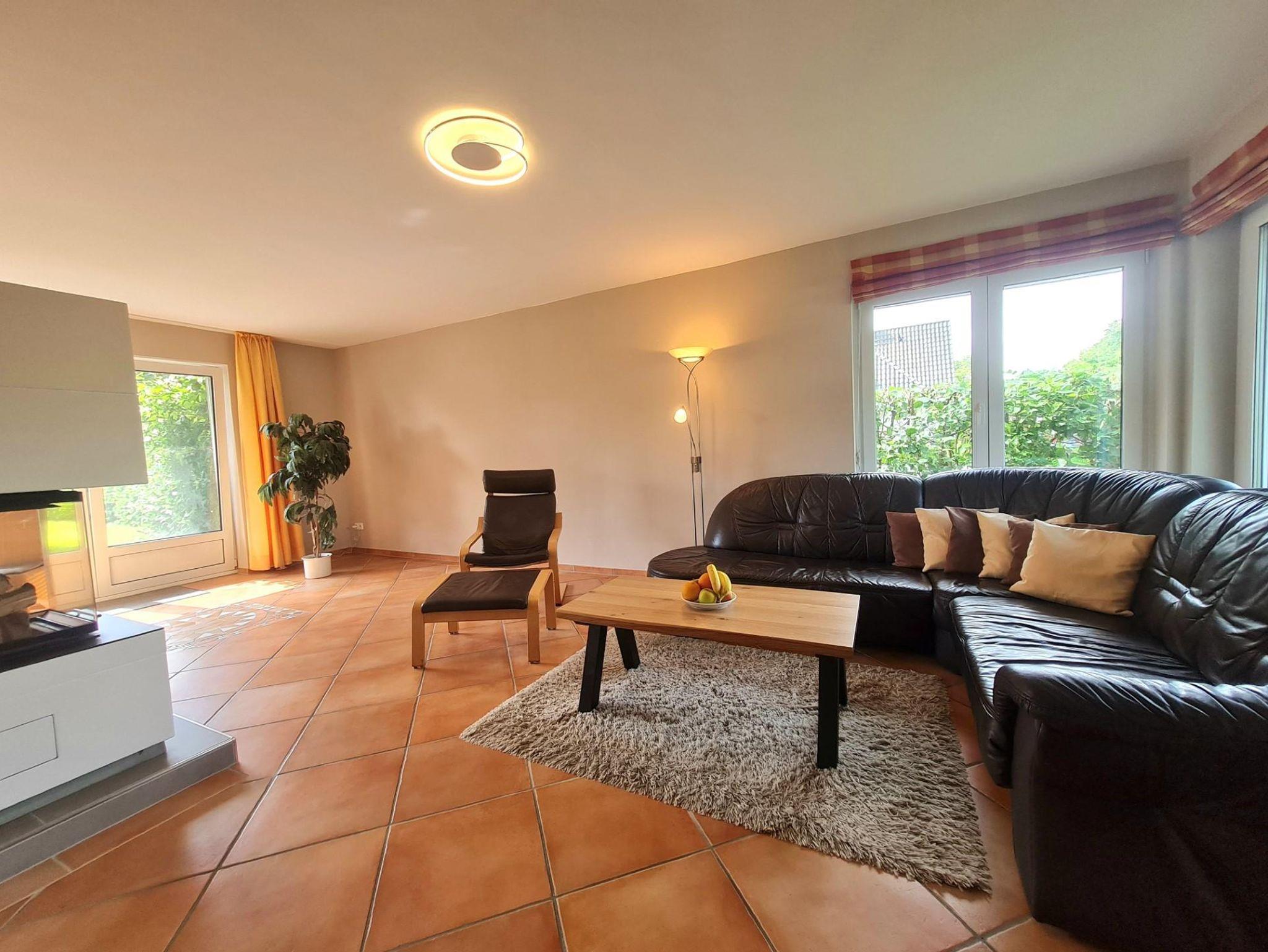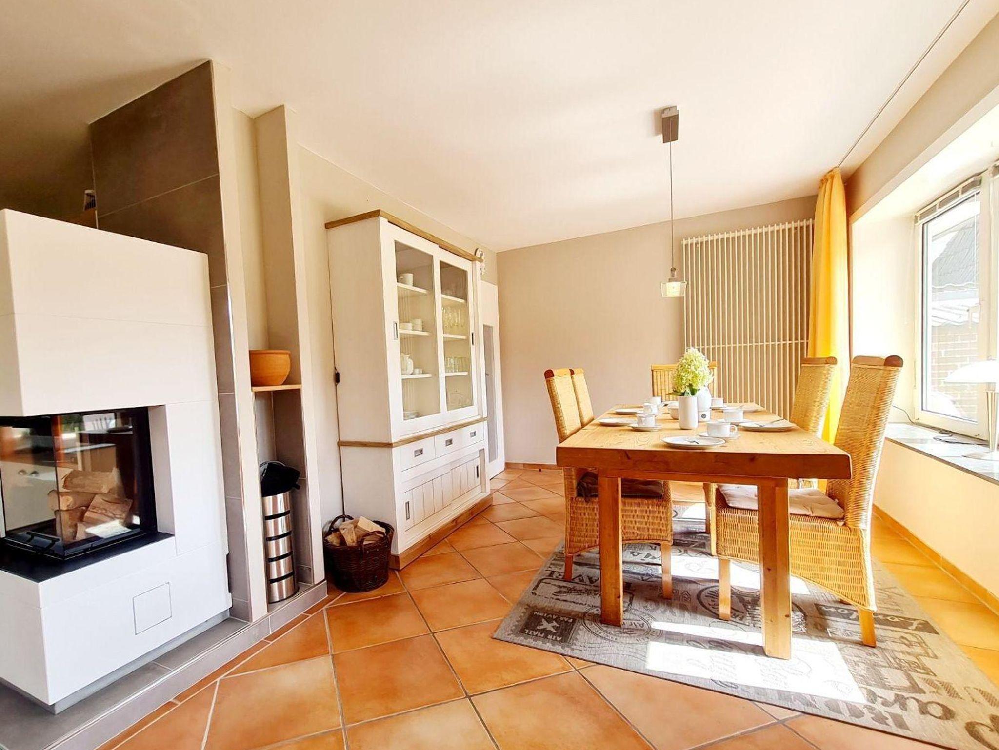 Kommen Sie an - ein großes Wohnzimmer mit Kamin, Essecke mit großem Tisch, SAT-TV, Spiel- und Leseschrank, HIFI-Anlage,