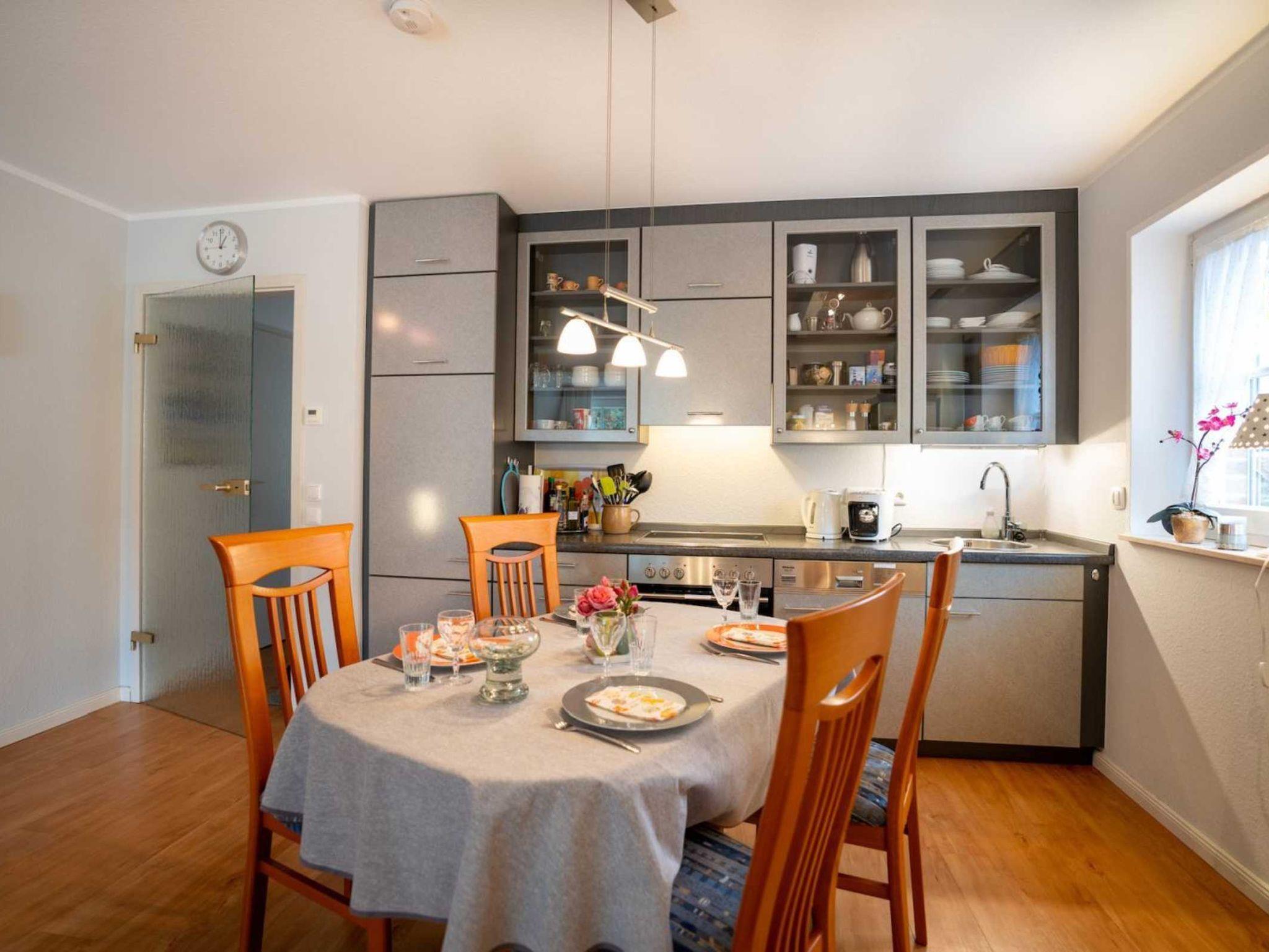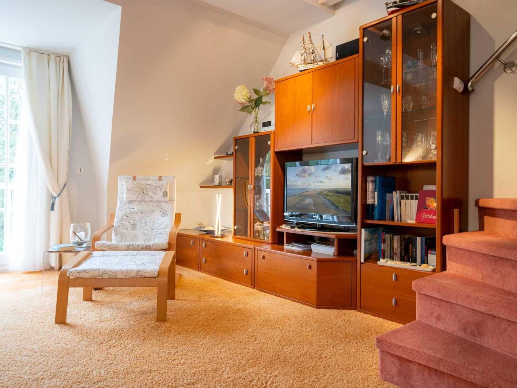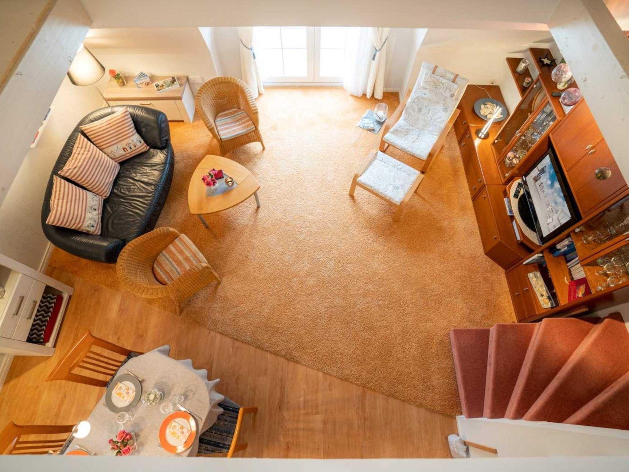 Wohn- und Esszimmer mit Sofa (2er), 2 Sesseln, Relaxstuhl, SMART-TV (Sat), Internetradio mit USB, Esstisch für 4 Personen und direktem Zugang zum möblierten Balkon nach Südwesten. Offene Küche mit Ceranfeld-Herd, Backofen, Kühlschrank mit Gefrierfach, Geschirrspüler und Kapsel-Kaffeemaschine Tchibo Cafissimo. Keine Mikrowelle.