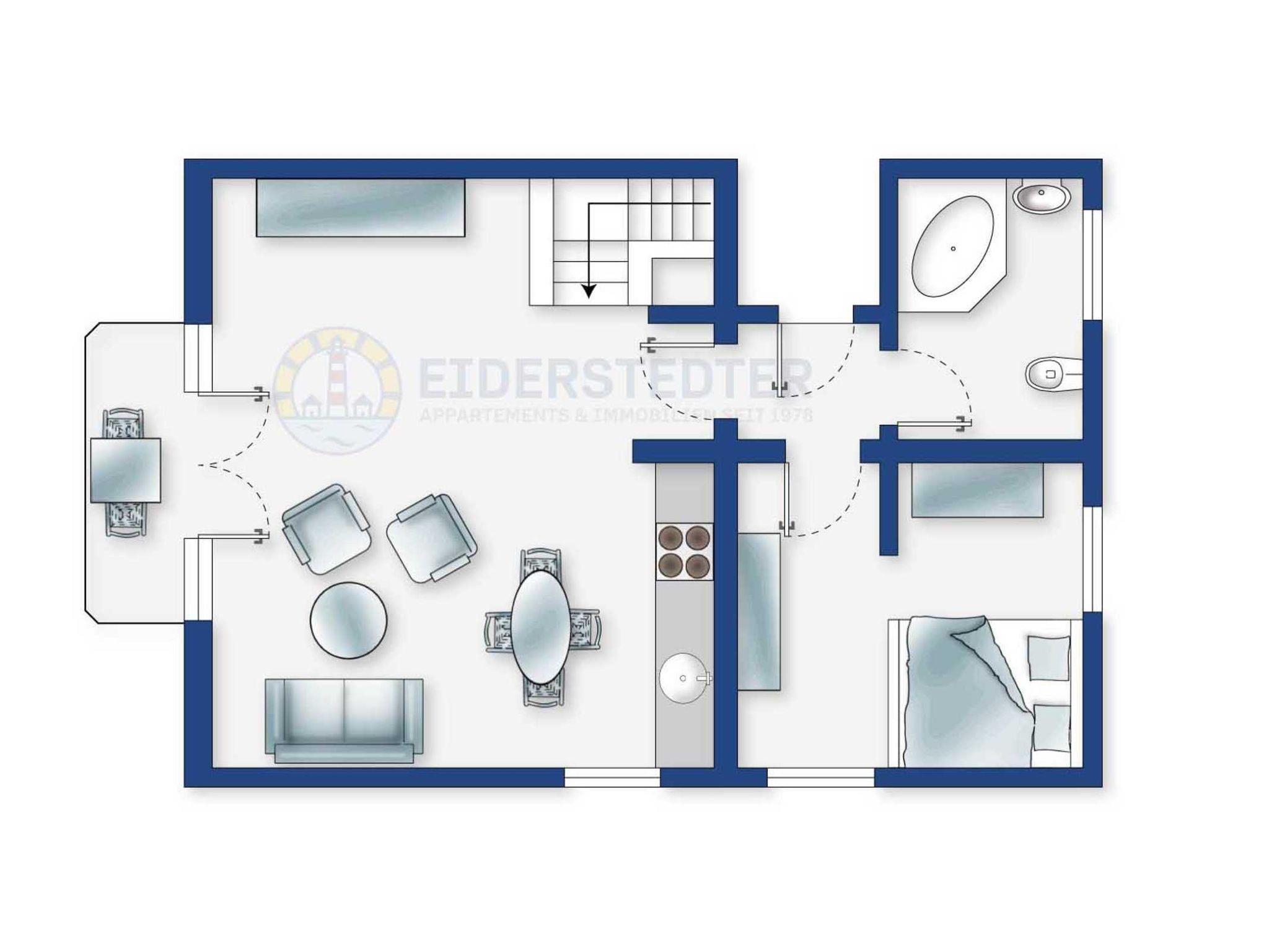 Komfortable 3-Zimmer-Ferienwohnung mit ca. 60 qm auf 2 Ebenen (OG, DG) für bis zu 4 Personen. In strandnaher, ruhiger Lage im Ortsteil Böhl in Sankt Peter-Ording. Direkt hinter dem Böhler Leuchtturm, nur wenige Gehminuten durch den Wald bis zum Deich. Von Ihrem Südwestbalkon aus haben Sie einen schönen Blick auf den gepflegten Garten und hören sogar das Meeresrauschen. Eine Bäckerei, ein Restaurant und der Golfplatz befinden sich in der Nachbarschaft.