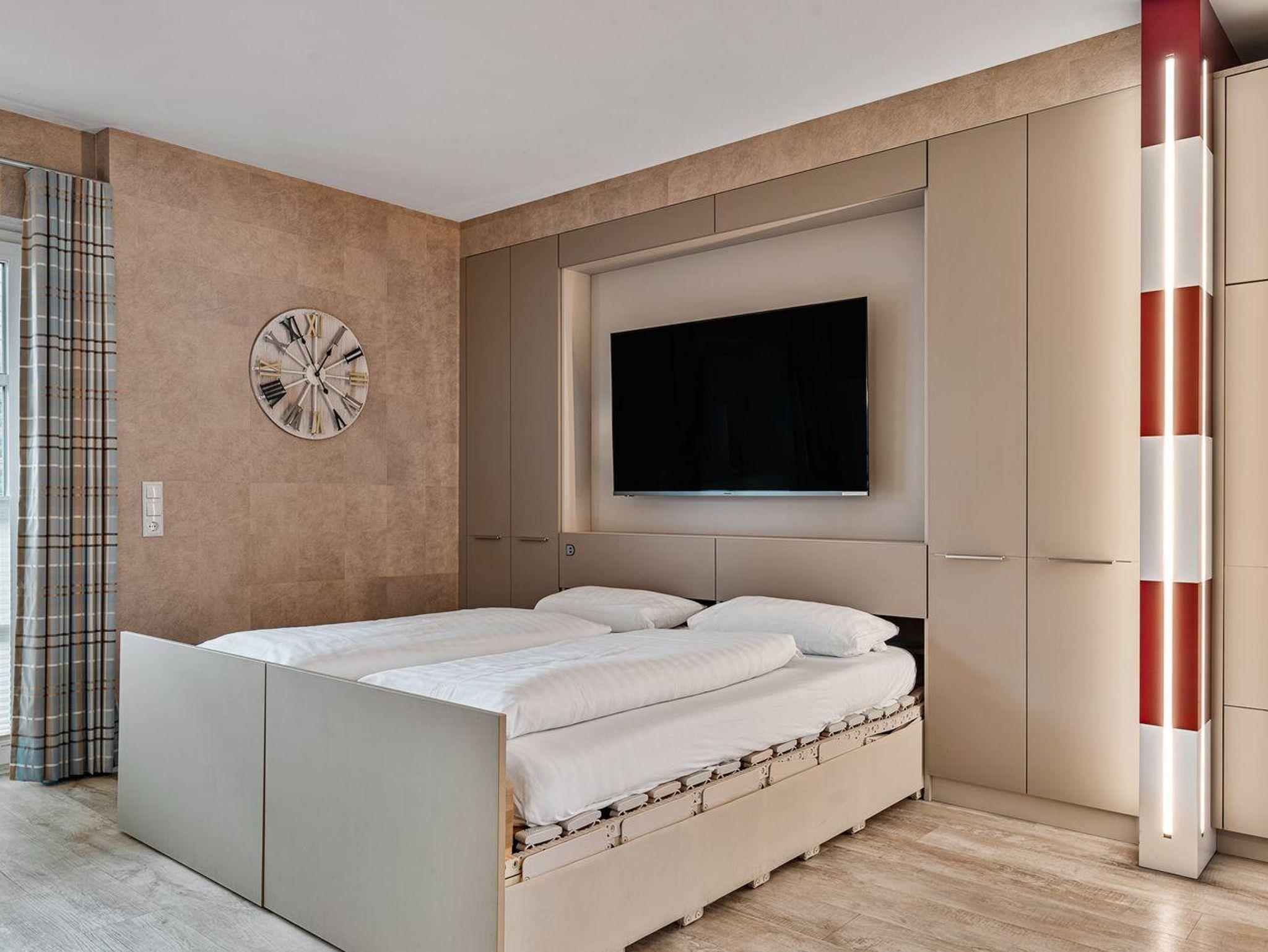 Der einladende Wohnbereich überzeugt mit einer gemütlichen Essecke und einem hochwertigen Ledersofa mit elektrischer Relaxfunktion – ideal für entspannte Abende zu zweit. Ein clever integriertes Belitec-Schrankbett verwandelt den Raum bei Bedarf in ein behagliches Schlafzimmer. Tagsüber lässt sich das Bett dezent im Schrank verstauen, wodurch ein großzügiges Wohnambiente entsteht.