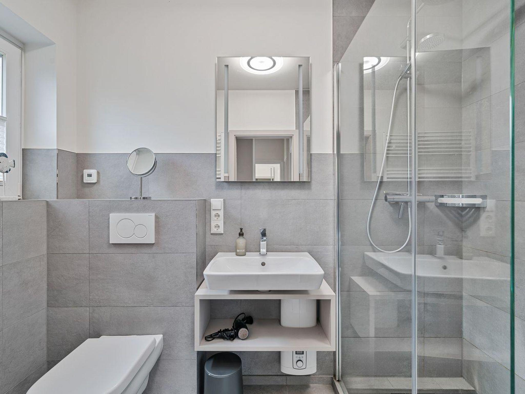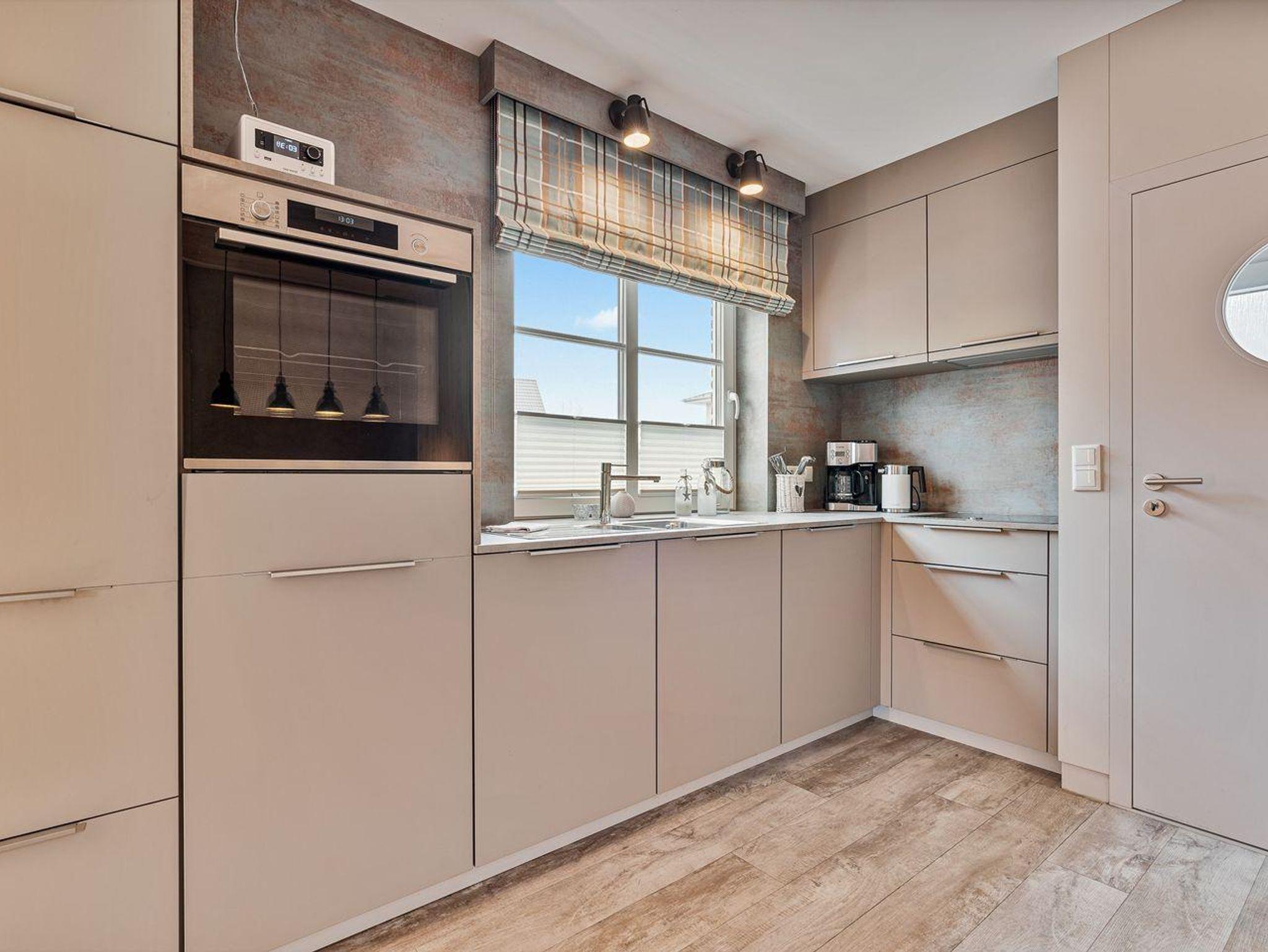 Die offene, moderne Einbauküche lässt keine Wünsche offen: Ausgestattet mit Backofen, Geschirrspüler, Kühlschrank mit Gefrierfach und Kaffeemaschine bietet sie alles, was man zum Kochen und Genießen braucht. Ein kleiner Flur führt Sie in das stilvoll gestaltete Duschbad mit WC.