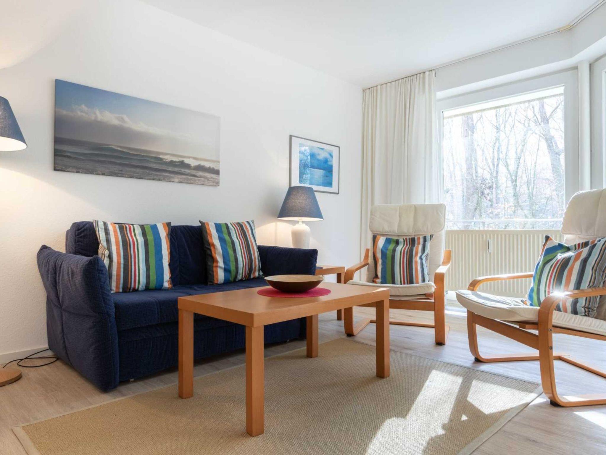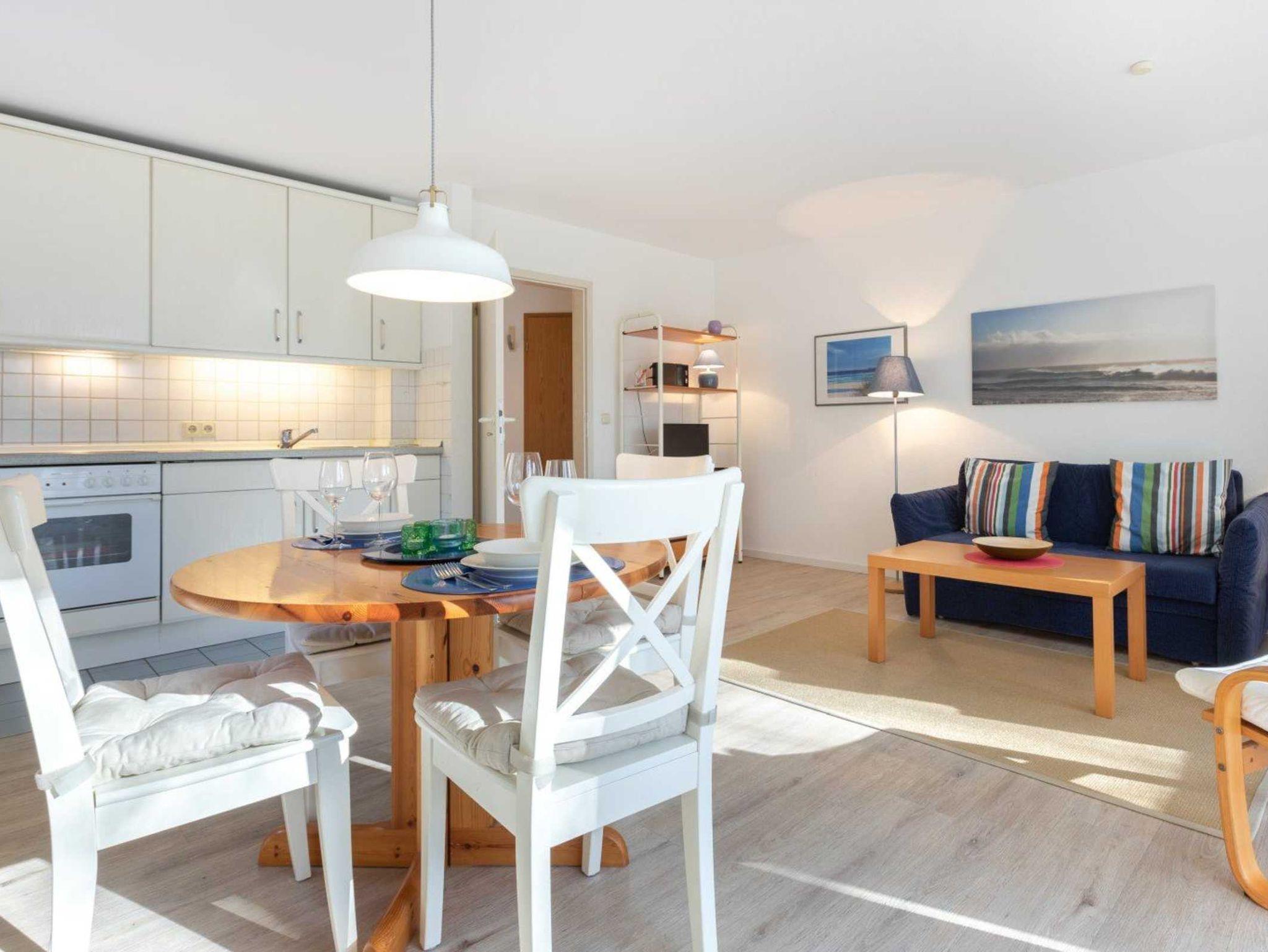 Wohnzimmer mit Sofa (2er), 2 Sesseln, TV (Kabel) und Esstisch mit 4 Stühlen. Direkter Zugang zum möblierten Balkon nach Süden mit Blick auf den Wald. Offene Küche mit Backofen und Kühlschrank mit Gefrierfach.