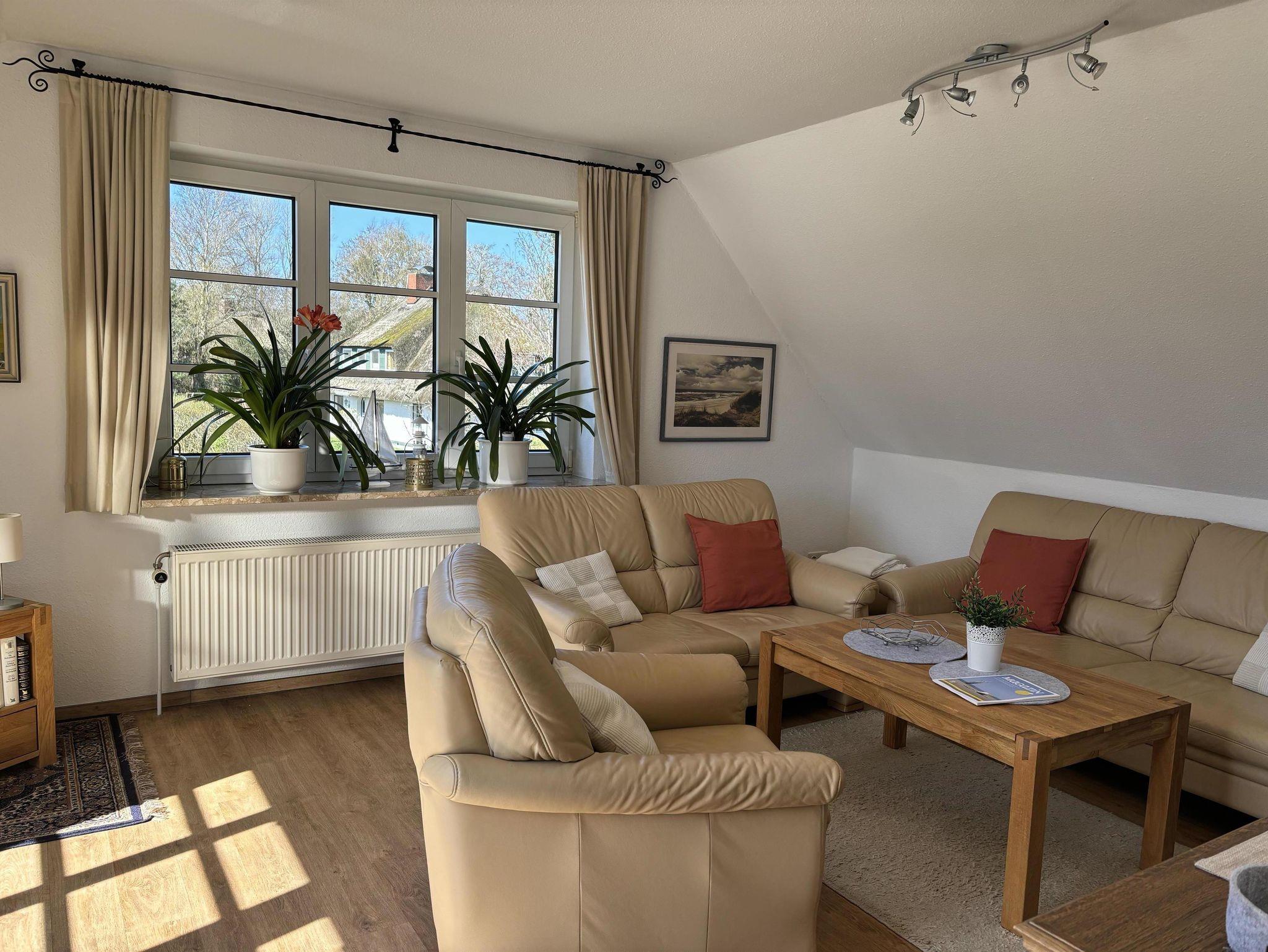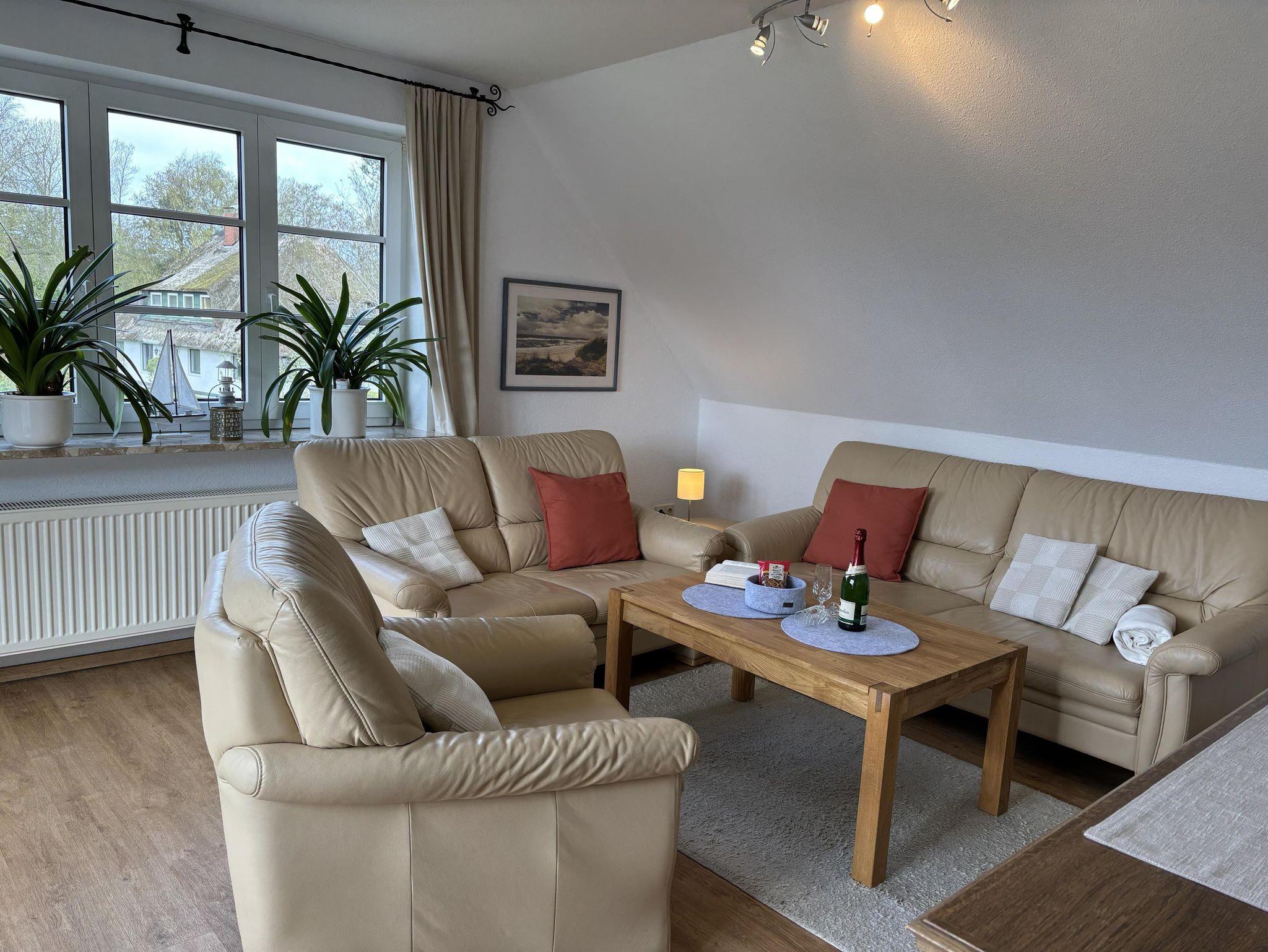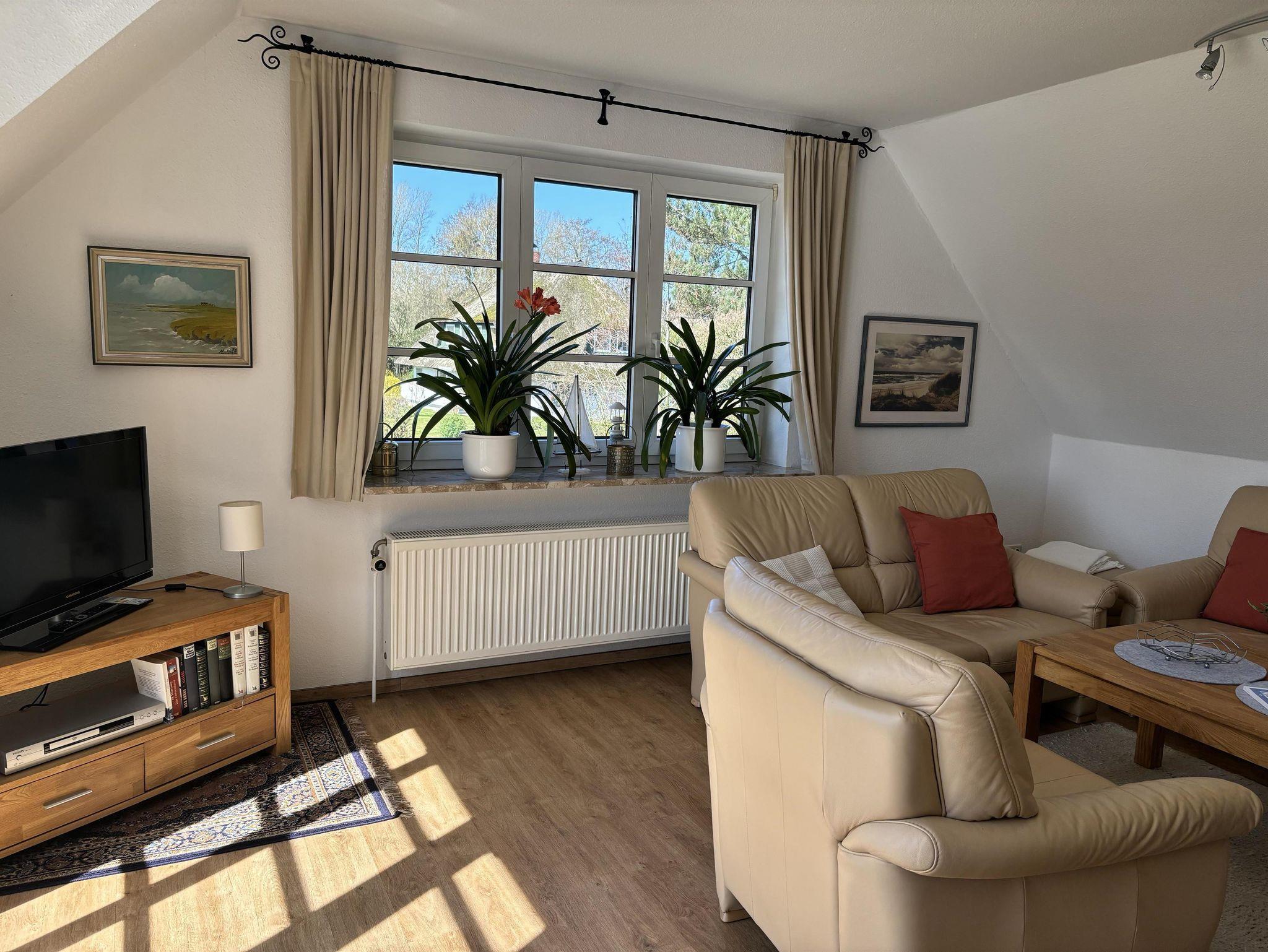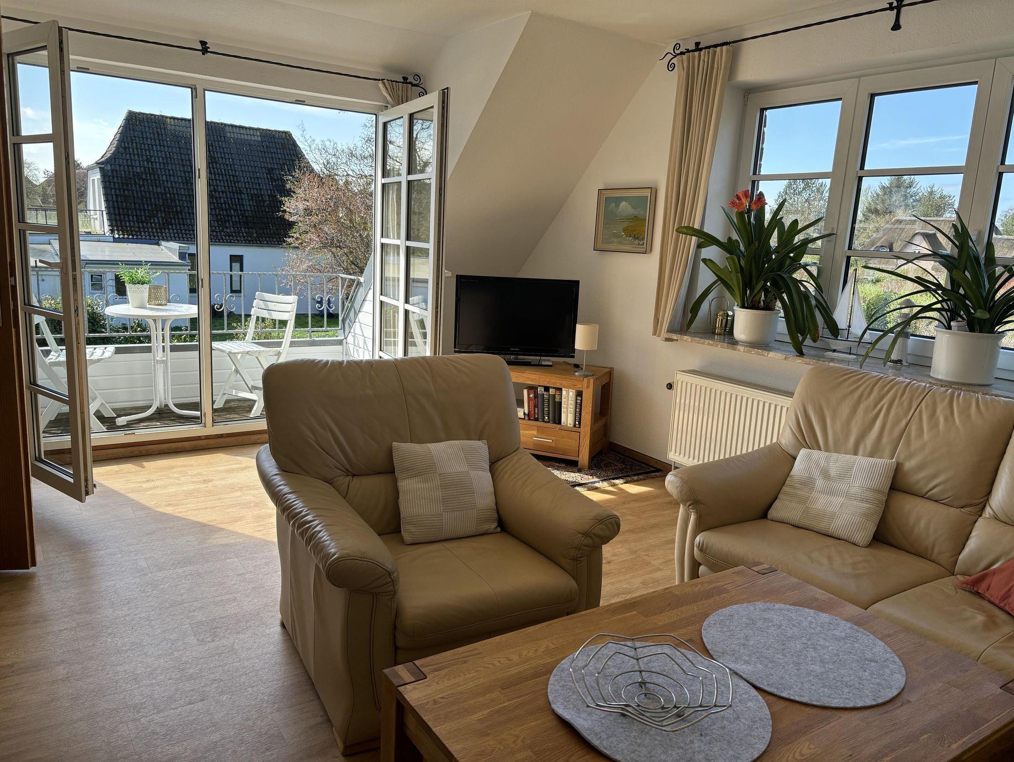 Heller und geräumiger Wohnbereich mit Sitzgruppe, TV und direktem Zugang zum Südbalkon.