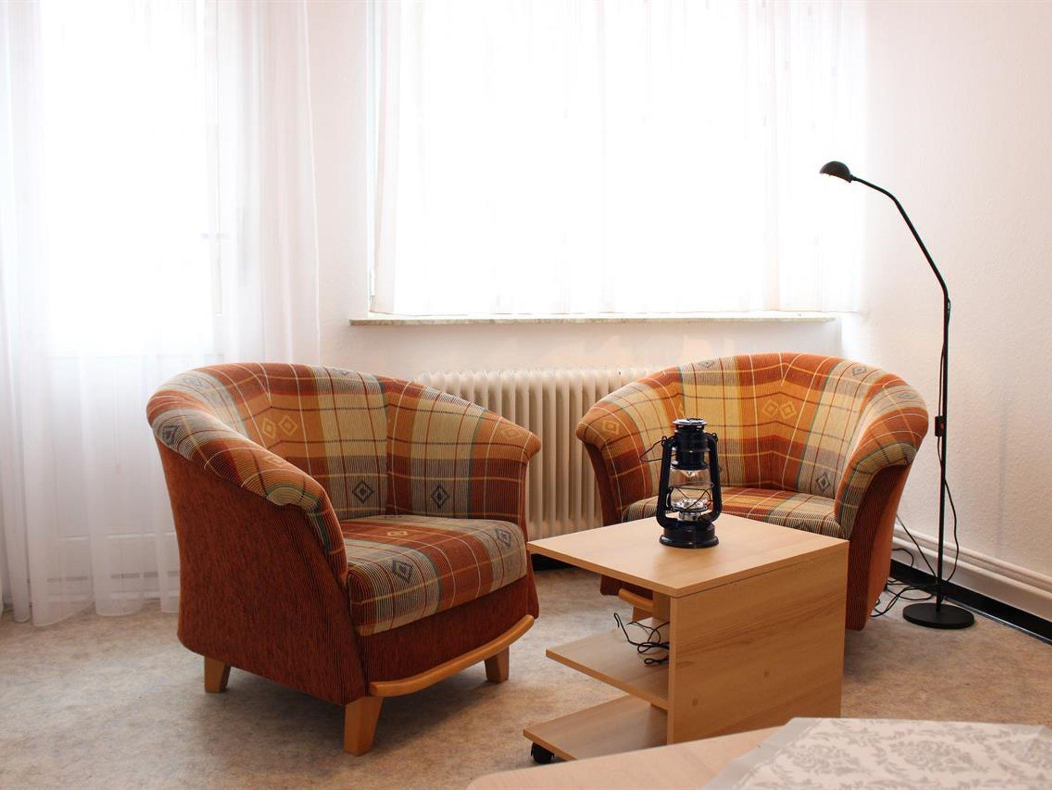 Das Wohnzimmer dient zugleich als Schlafraum und ist mit einer komfortablen Doppelschlafcouch, zwei Sesseln und einem Sat-Farb-TV ausgestattet. Im separaten Schlafzimmer finden Sie ein Doppelbett und einen Schlafsessel. Das moderne Badezimmer verfügt über eine Dusche und WC.