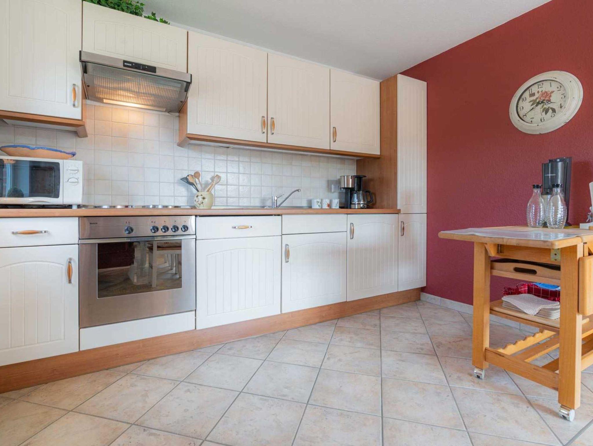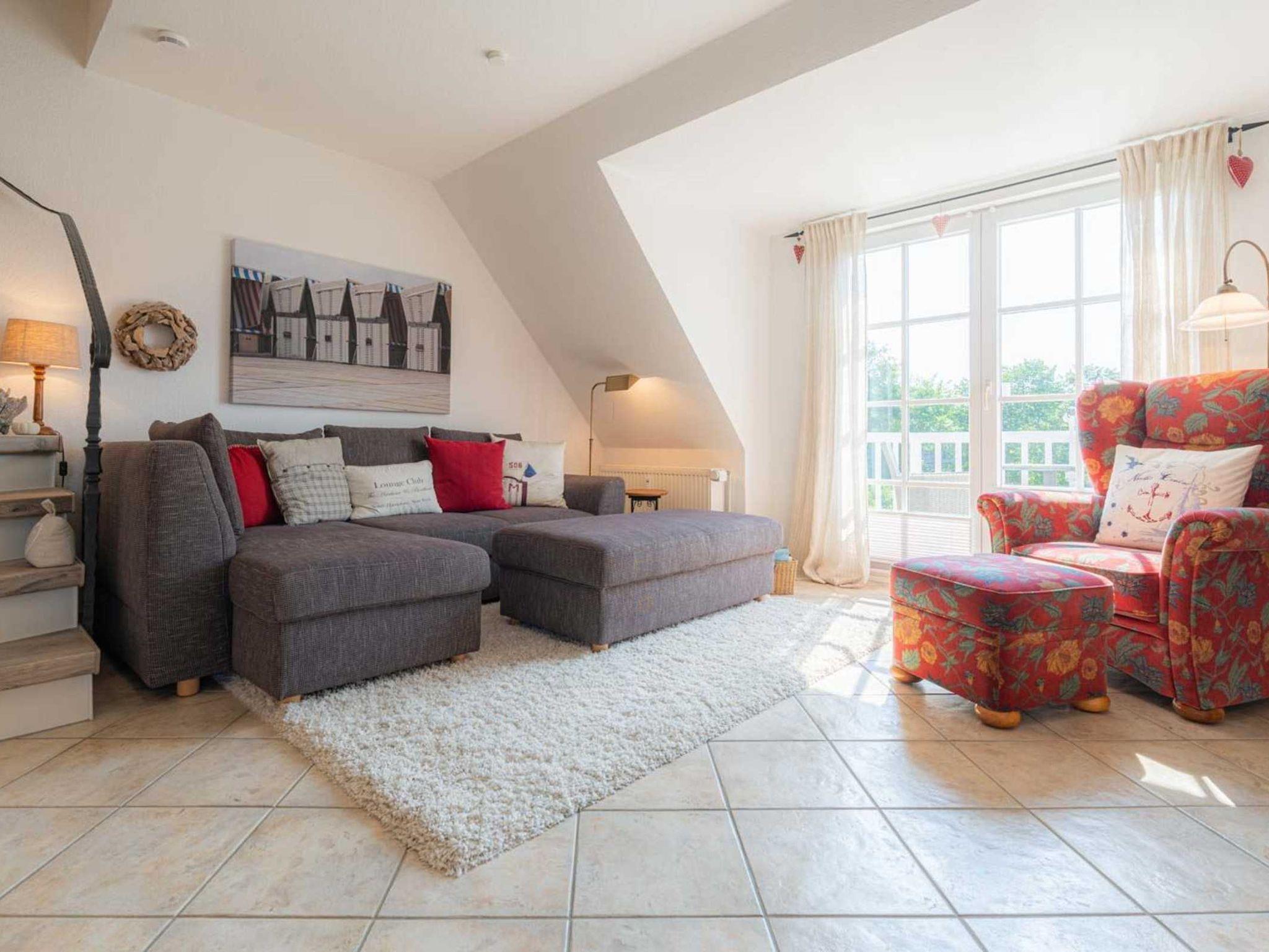 Wohnzimmer mit Wohnlandschaft, Ohrensessel mit Fußhocker, TV (Sat) mit Soundbar und Blueray-Player, Esstisch mit Sofa und 3 Stühlen. Direkter Zugang zum möblierten Balkon nach Süden. Offene Küche mit Induktionsherd, Backofen, Mikrowelle, Geschirrspüler und Kühlschrank mit Gefrierfach.