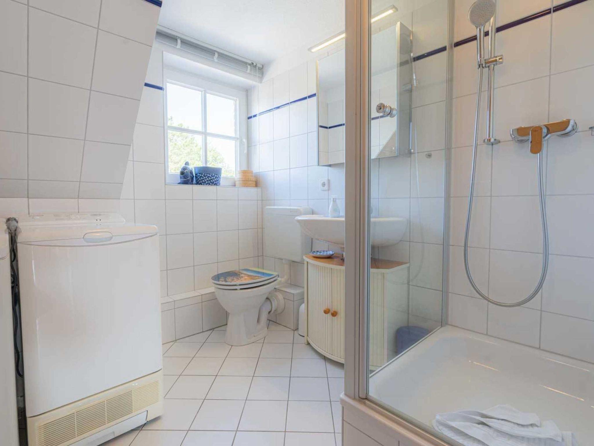 Badezimmer (Duschbad) mit Dusche (80x70cm, Eintritt 30cm), Handtuchwärmer, WC, Waschmaschine, Trockner, Föhn und Tageslicht.