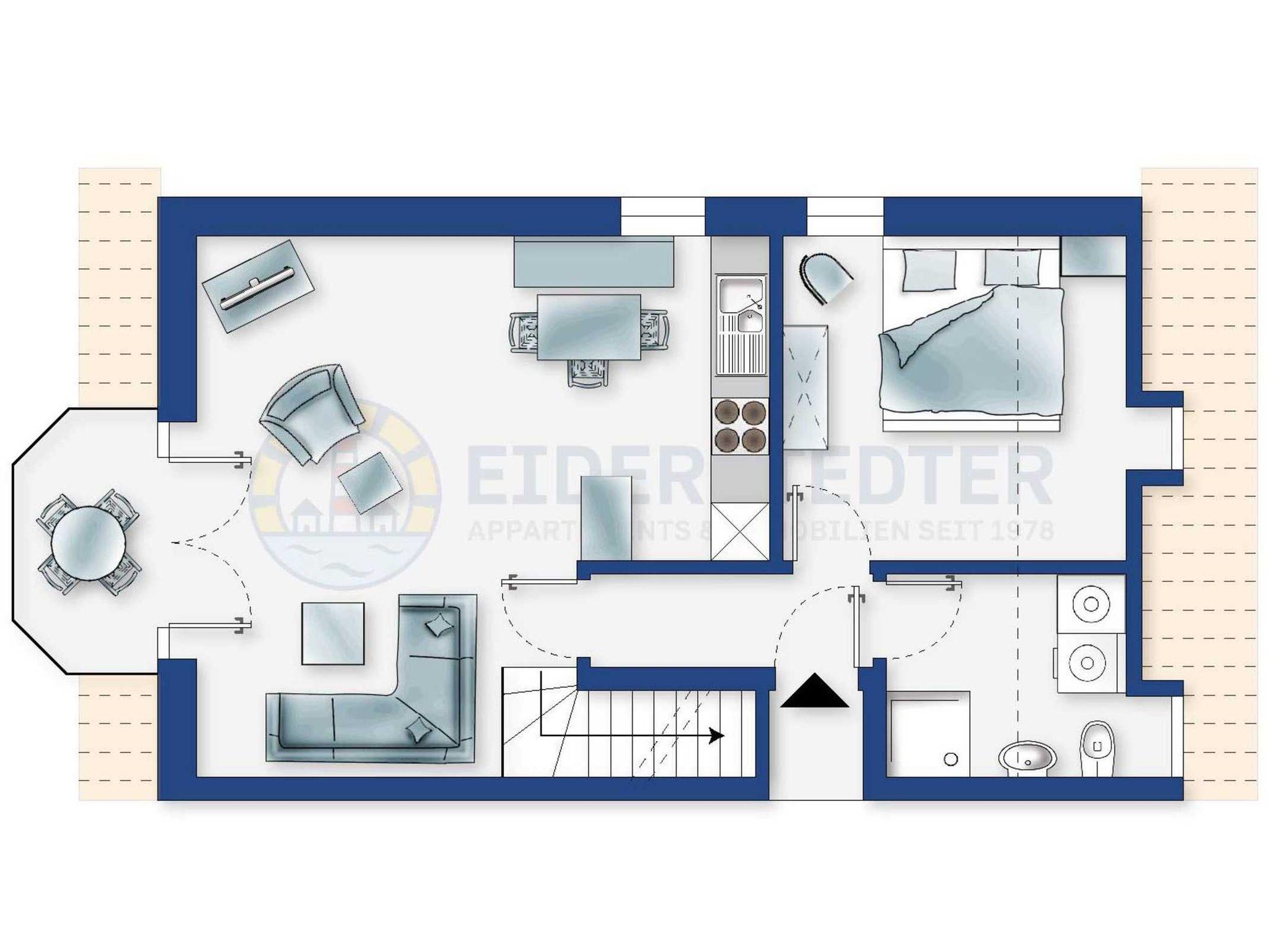 Komfortable 3-Zimmer-Ferienwohung Müller mit ca. 67 m² auf 2 Ebenen (OG, DG) für bis zu 3 Personen. In ruhiger Lage im Ortsteil Böhl in St. Peter-Ording. Das bekannte Böhler Leuchtfeuer mit seinem herrlichen Weitblick über das Meer erreichen Sie in ca. 10 Gehminuten. Eine Bäckerei befindet sich ca. 5 Gehminuten entfernt.