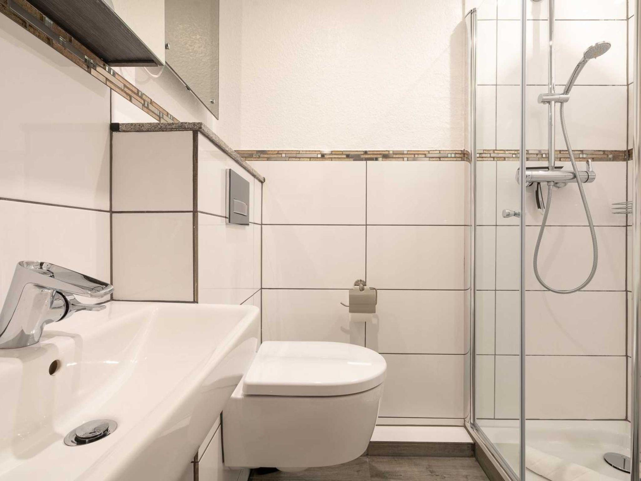 Modernes Badezimmer (Duschbad) mit Dusche, WC, und Föhn.