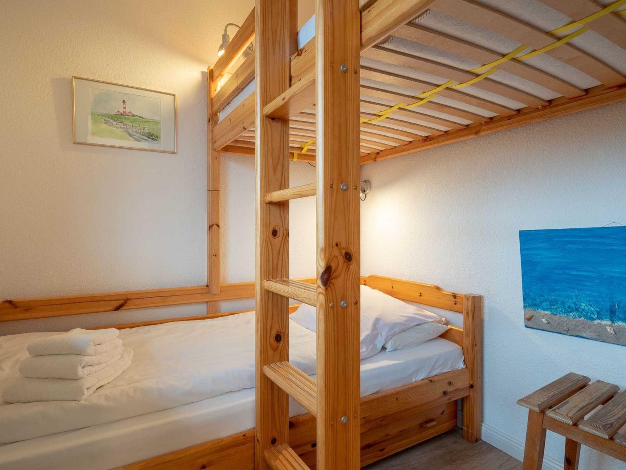 2. Schlafzimmer mit 2 Etagen-Einzelbetten (je 90x190cm), kleiner Spielecke und Blick ins Grüne.