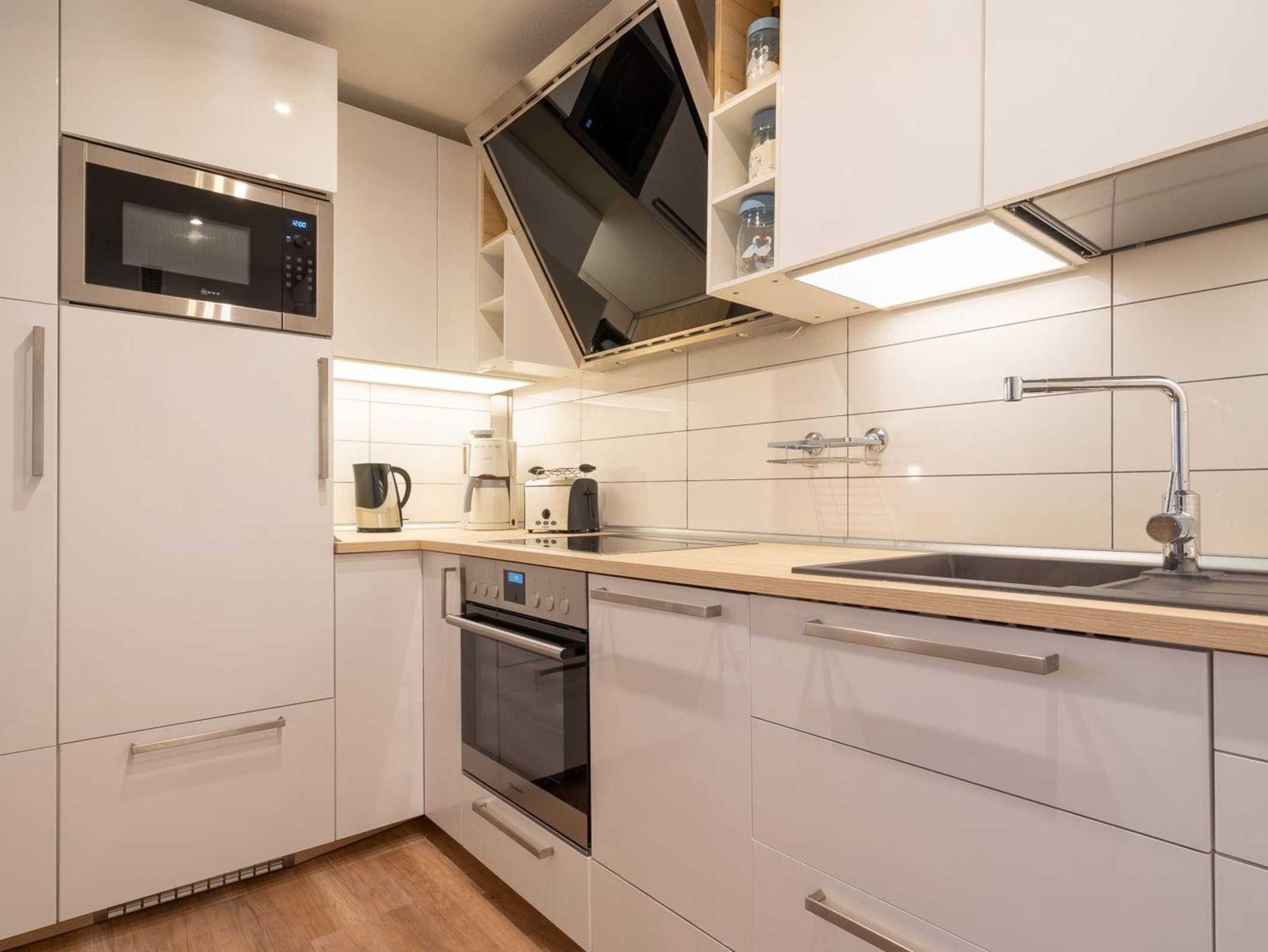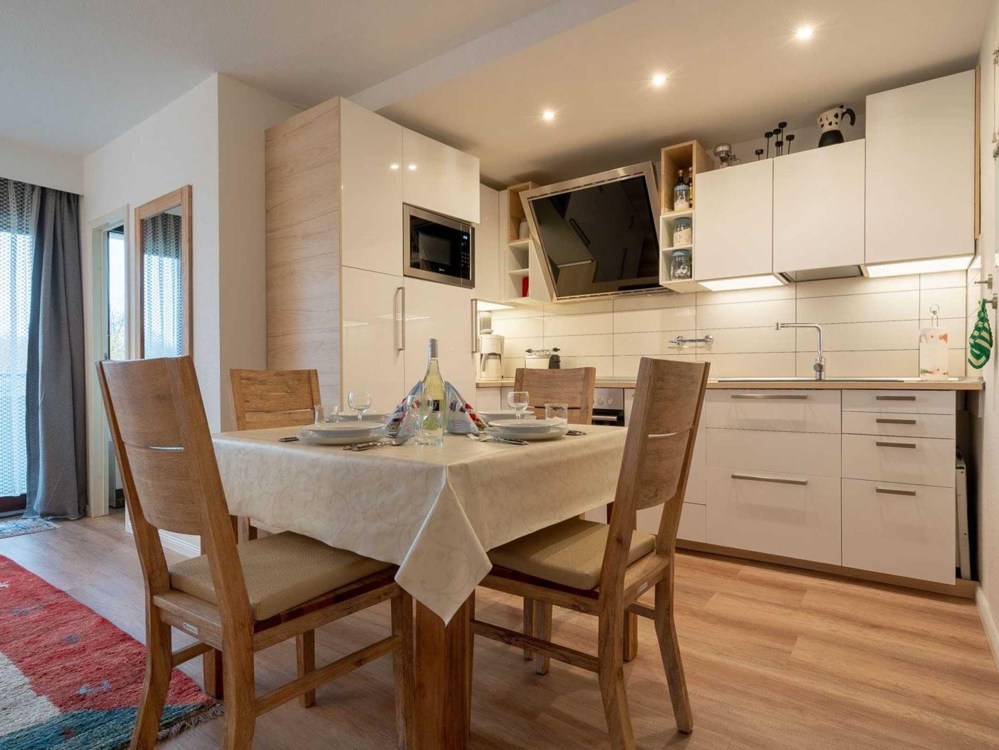 Wohnzimmer mit Sofa für 2-3 Personen, gemütlichem Sitzsack, großem TV (Kabel), Telefon und Esstisch mit 4 Stühlen. Direkter Zugang zum möblierten Balkon nach Westen mit schönem Ausblick ins Grüne. Offene Küche mit Backofen, Mikrowelle, Geschirrspüler und Kühlschrank mit Gefrierfach.