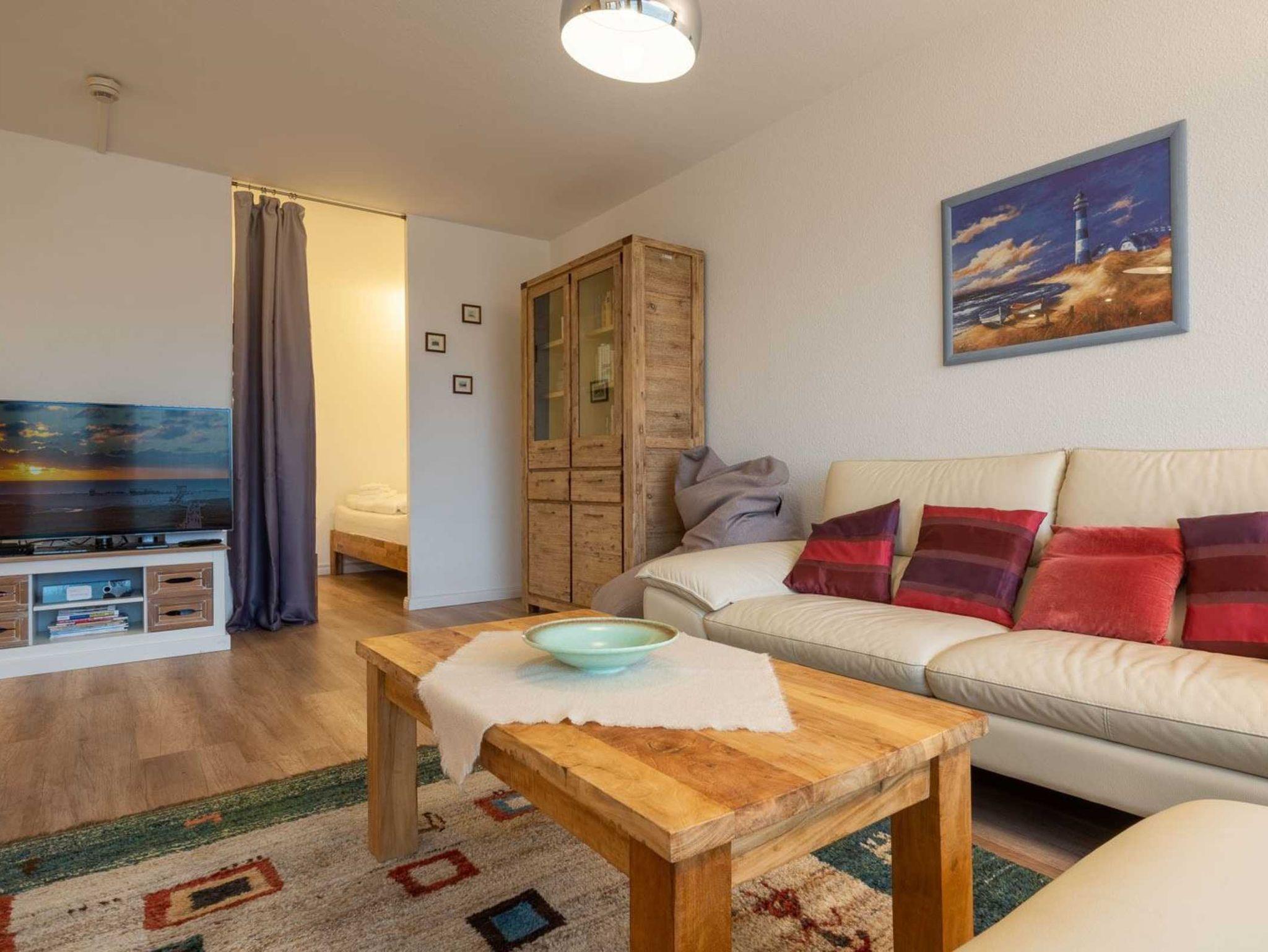Komfortable 2 1/2-Zimmer-Ferienwohnung Regina im Haus Atlantic mit ca. 47 qm auf 1 Ebene (1. OG, mit Fahrstuhl) für bis zu 4 Personen (Wohlfühlbelegung: max. 3 Erwachsene). In strandnaher Lage im Ortsteil Bad in St. Peter-Ording. Mit schönem Ausblick ins Grüne und auf den Tennisplatz.