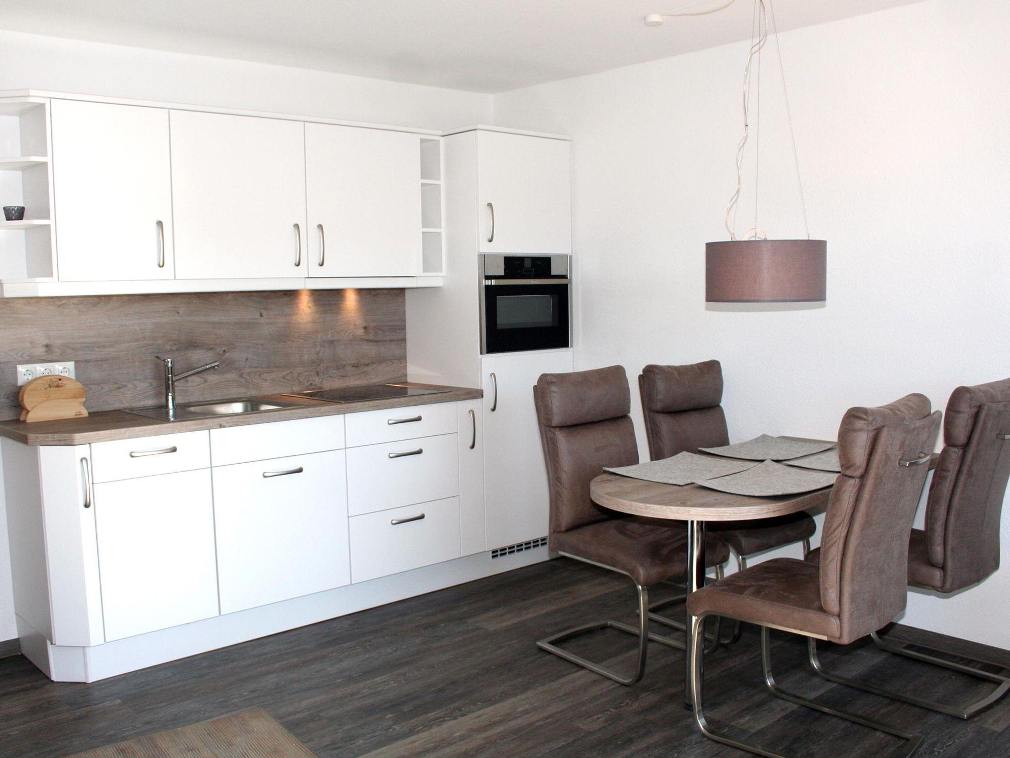 Wohnzimmer: Schlafcouch, Couchtisch, 2 Sessel, Stehlampe, Nachtspeicherofen, TV-Schrank, Kabel-TV, Radio, Esstisch, 4 Stühle, Küchenzeile, Geschirrspüler, 4 Plattenherd, kombinierter Backofen mit Mikrowelle, Dunstabzugshaube, Kühlschrank mit Gefrierfach, Kaffeemaschine, Wasserkocher, Toaster, Geschirr, Kochtöpfe