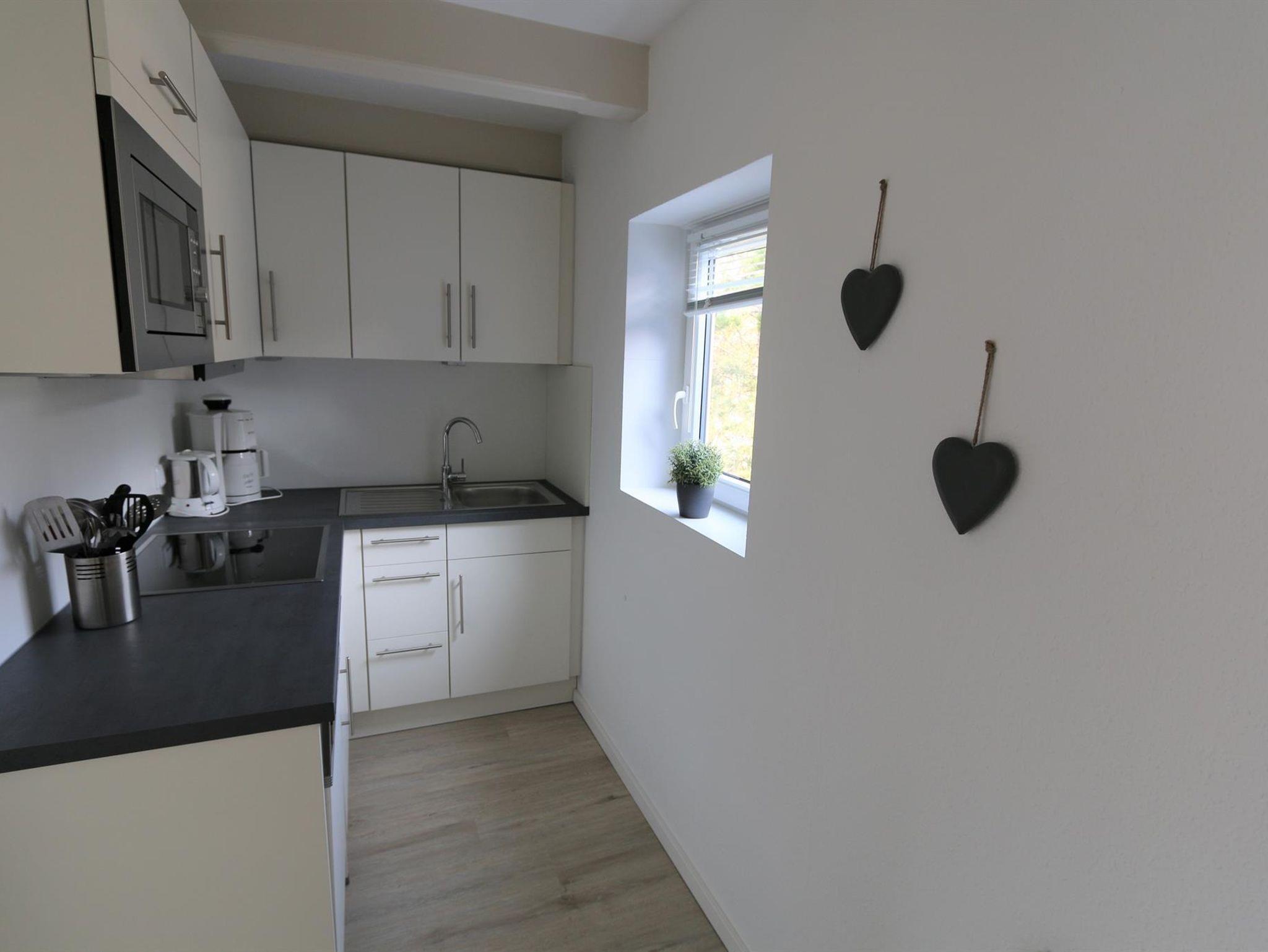 mit zwei Einzelbetten, Flur, Duschbad, sowie einen kombinierten Wohn-Schlafraum (Doppelbett als Schrankbett) mit Küchenzeile.