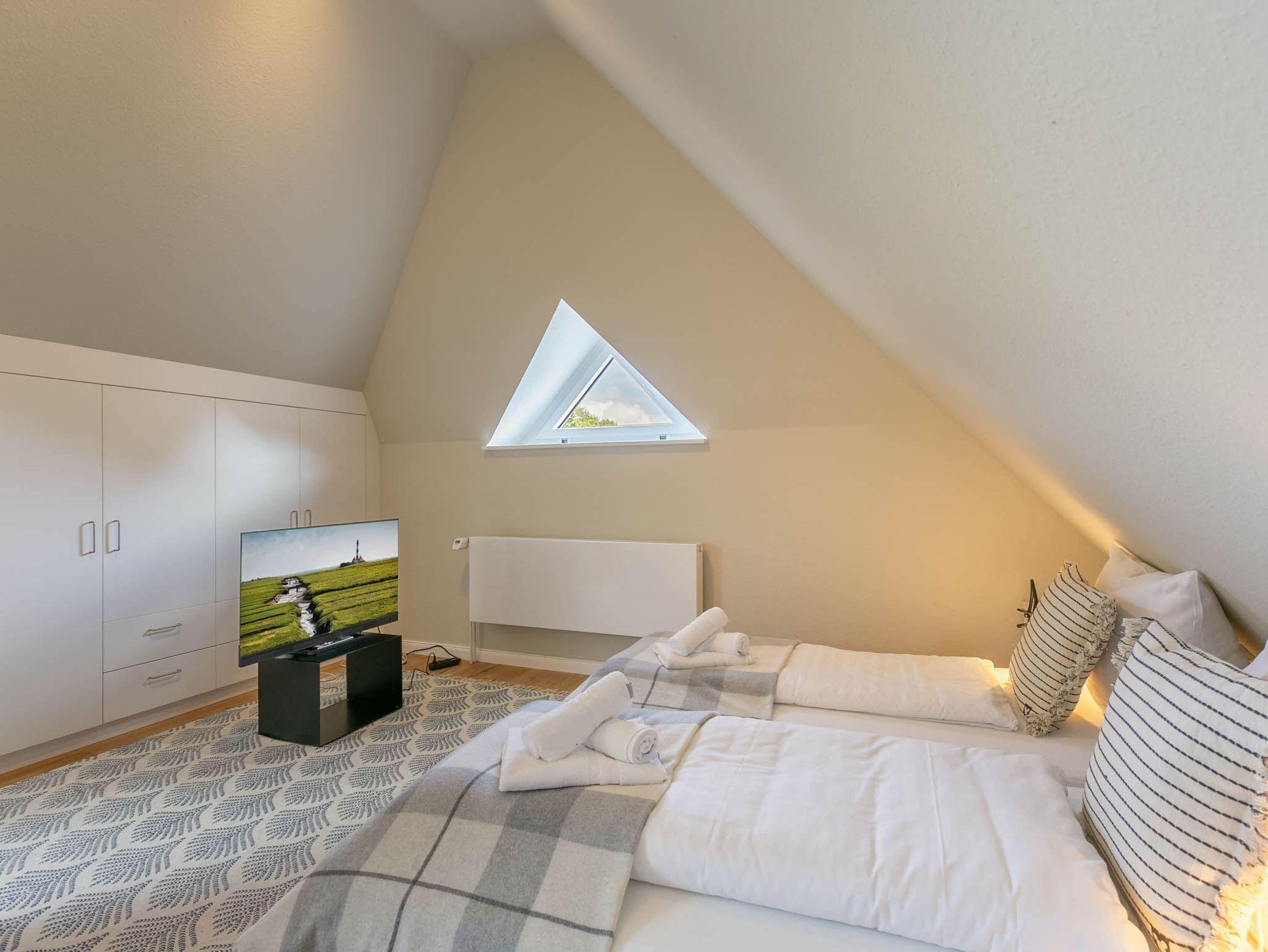 2. Schlafzimmer mit 2 Einzelbetten (je 90x200cm), (Schlaf-) Sofa (90x200cm), Einbauschrank, SMART-TV (nur Streaming) und Schreibtisch.