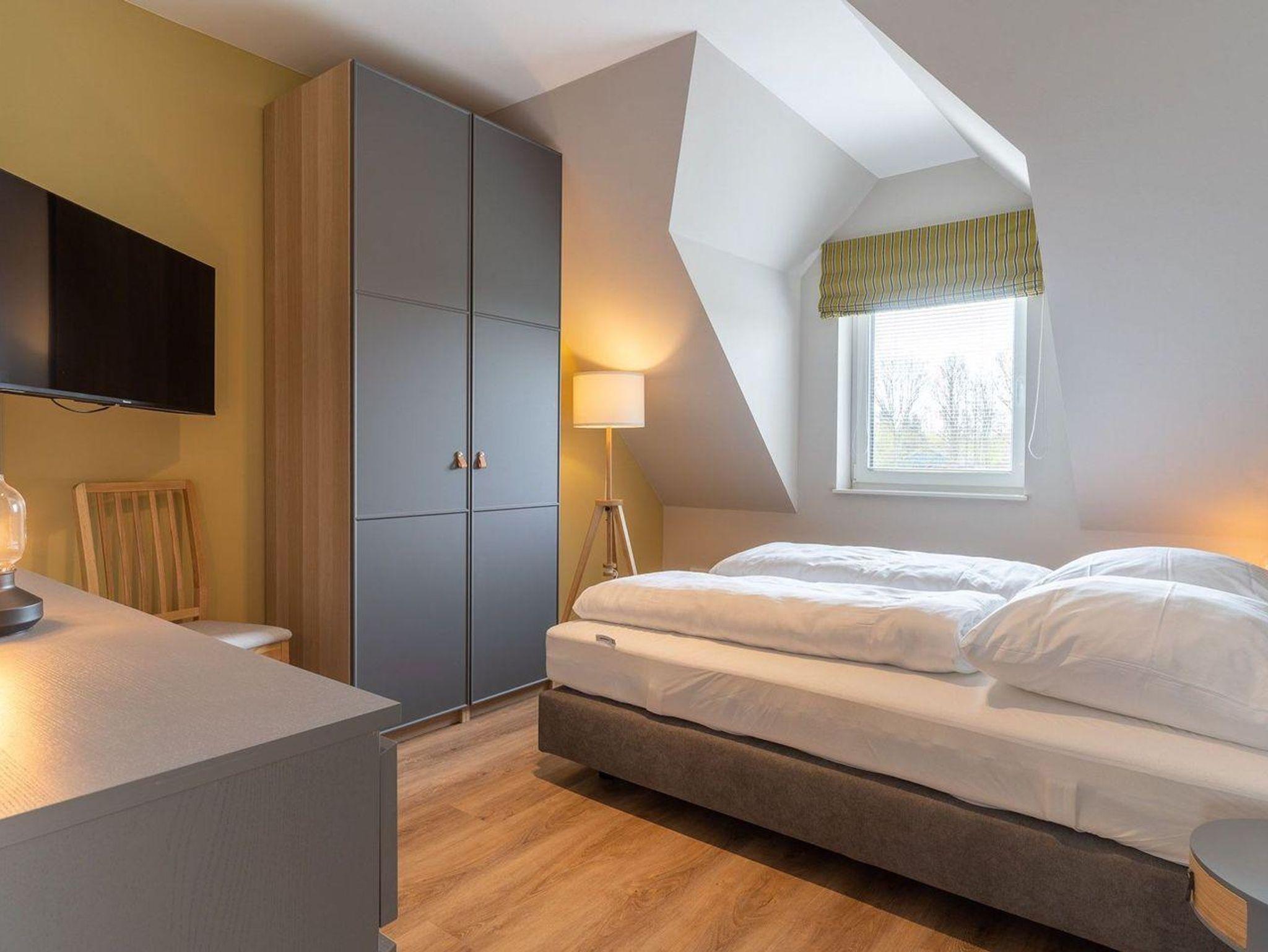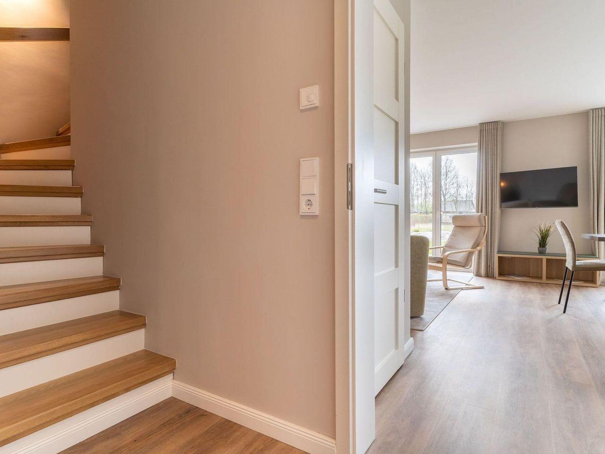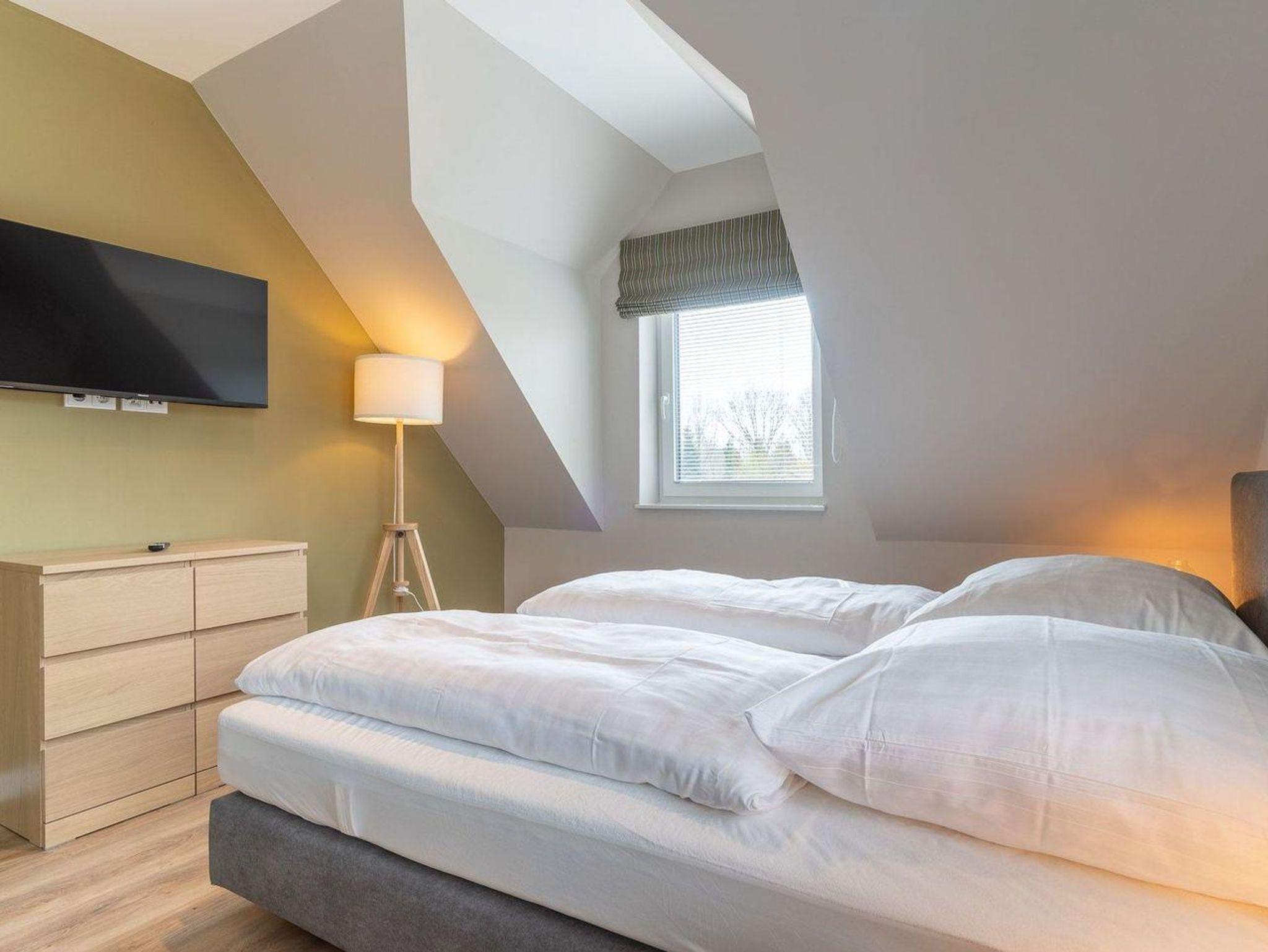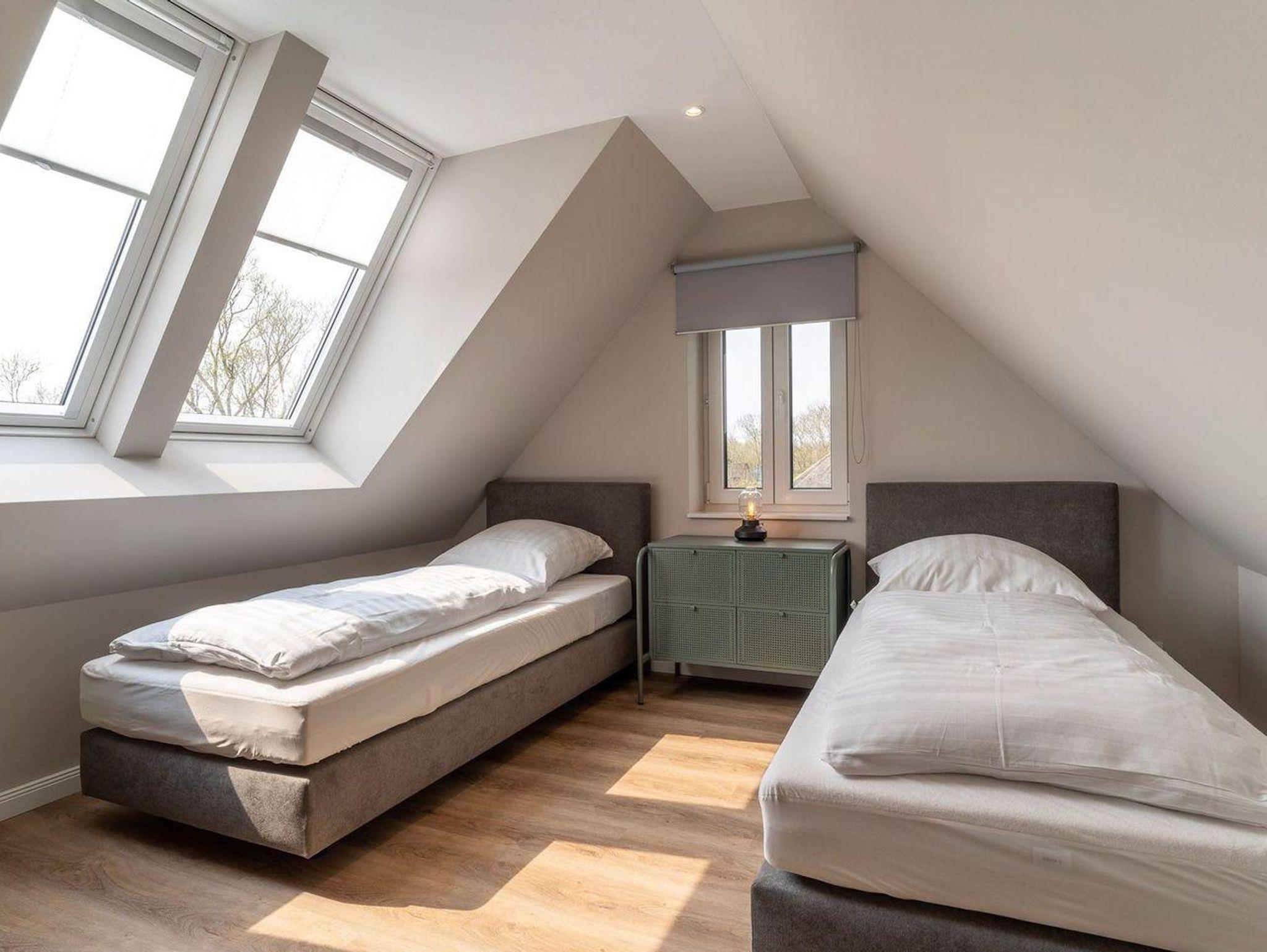 Besonderes Highlight im Wohnbereich ist die gemütliche Sitzbank direkt im Fenster, die ganz sicher zu einem Ihrer Lieblingsplätze im Haus wird, um ein gutes Buch zu lesen oder den ersten Kaffee am Morgen zu genießen. Die Küche verfügt über hochwertige Elektrogeräte und bietet genügend Platz zum gemeinsamen Kochen. Vom Flur mit Garderobe, welche ausreichend Platz für Jacken und Schuhe bietet, gelangen Sie in ein Duschbad, sowie in den Schlafraum mit einem Einzelbett. Über eine Holztreppe gelangt man in das Obergeschoss. Drei Schlafzimmer mit je einem Boxspring-Doppelbett (180x200 m) sind ausgestattet mit TV und großen Kleiderschränken. Ein zweites vollausgestattetes Badezimmer im OG, mit einer Dusche, einer Eckbadewanne und zwei einzelnen Waschbecken runden das hochwertige Hauskonzept ab und lassen keine Wünsche offen. Über eine weitere Holztreppe geht es vom Flur ins Dachgeschoss. In dem großzügigen Dachgeschoss stehen Ihnen noch zwei weitere Einzelbetten zur Verfügung.