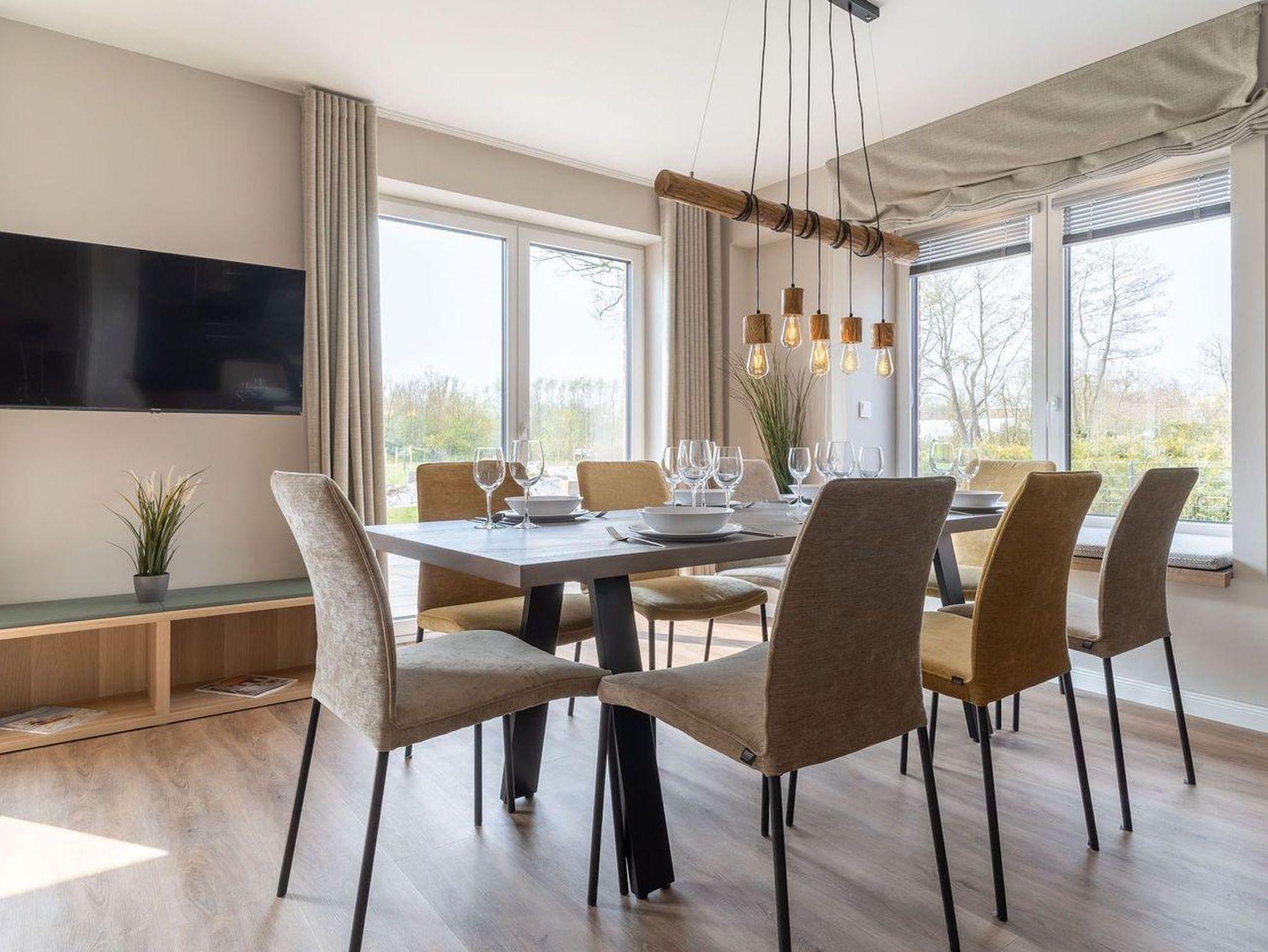 Im Erdgeschoss befindet sich der lichtdurchflutete Wohnraum mit TV, einer großen offenen Küche sowie einem stilvollen Essbereich.