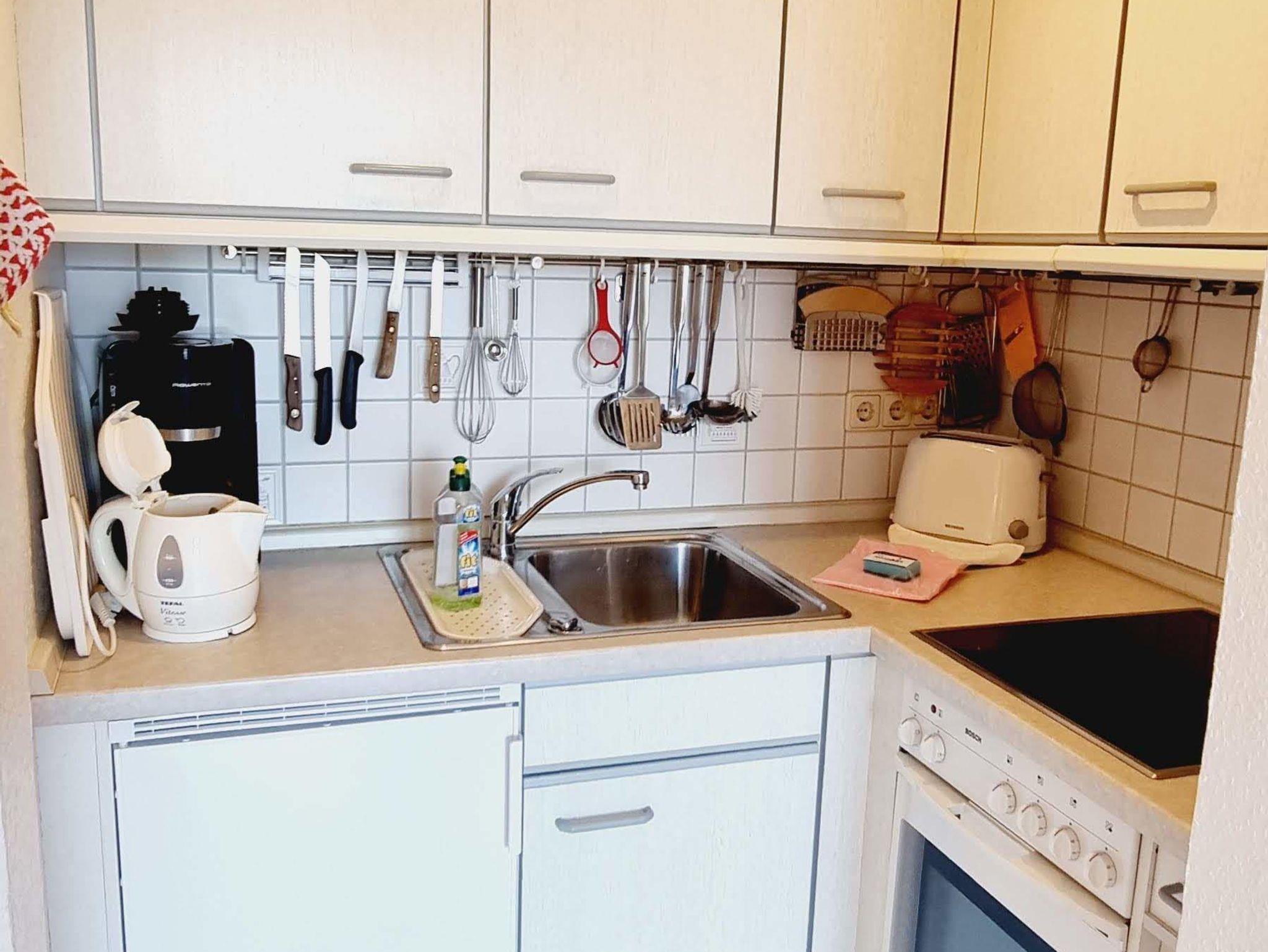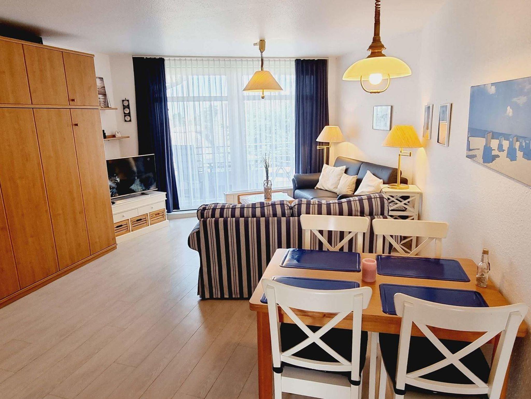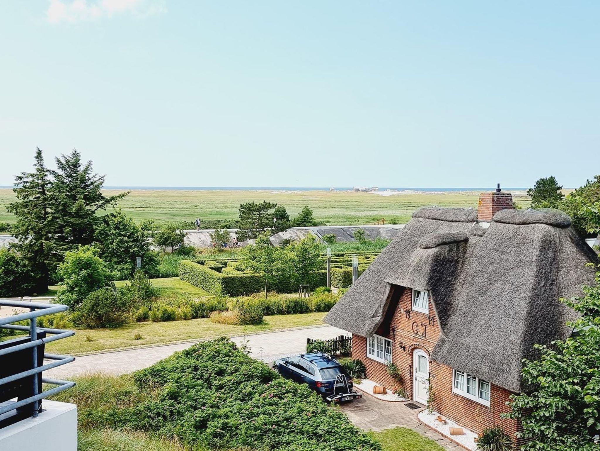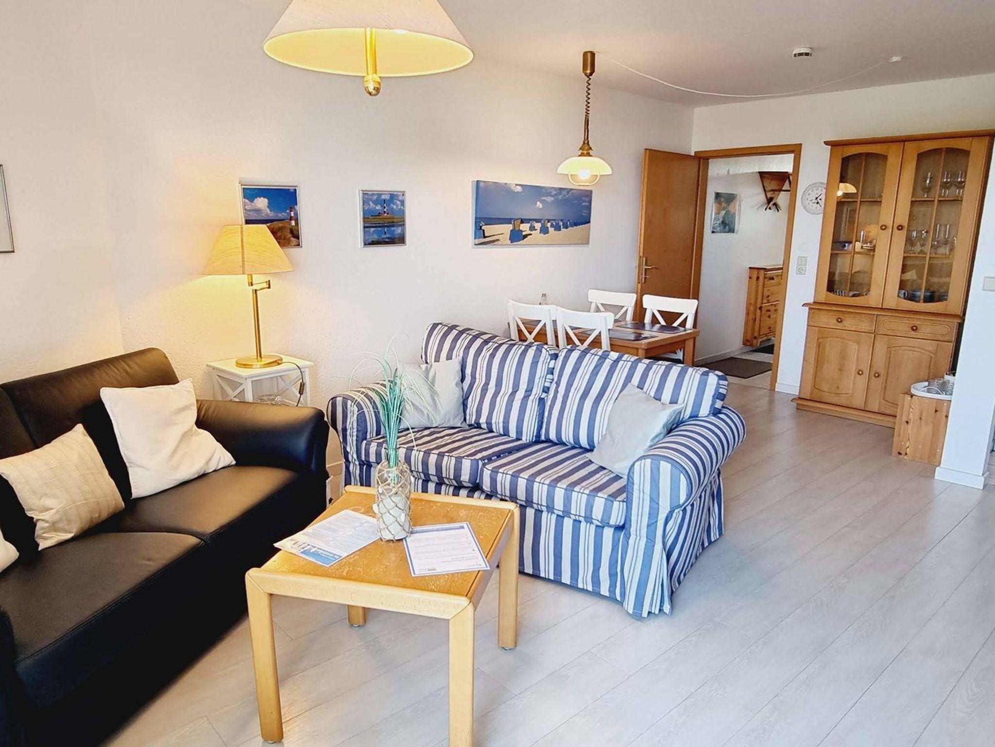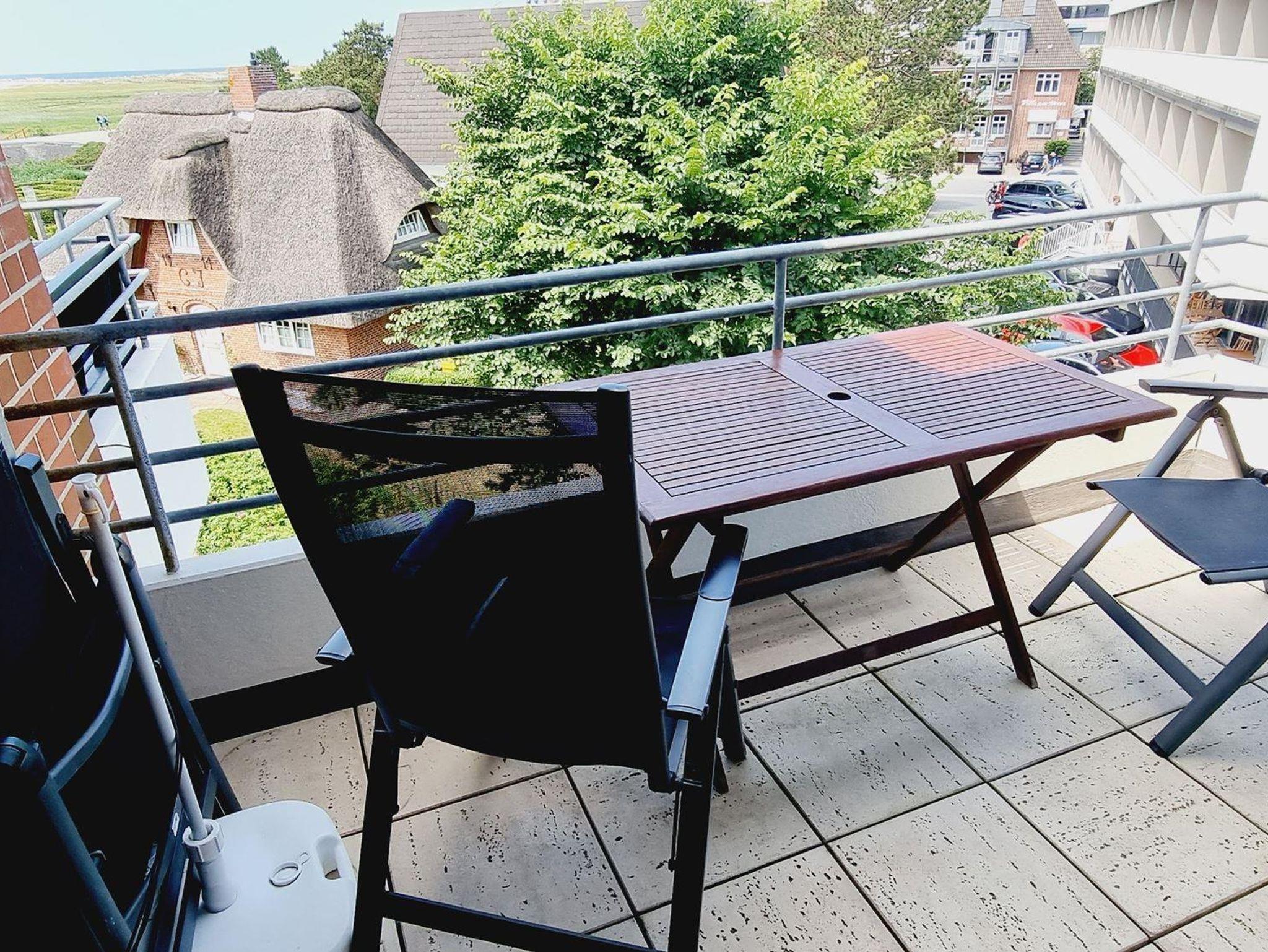 • Wohnzimmer mit Sitzecke, TV (Kabel), Esstisch mit 4 Stühlen. Direkter Zugang zum möblierten Balkon nach Westen mit Blick über ein schönes Reetdachhaus und die Deichpromenade bis zu den Pfahlbauten am Strand. Halboffene Küche , Herd mit 4 Ceran-Kochstellen und Backofen, Kühlschrank mit Gefrierfach.
