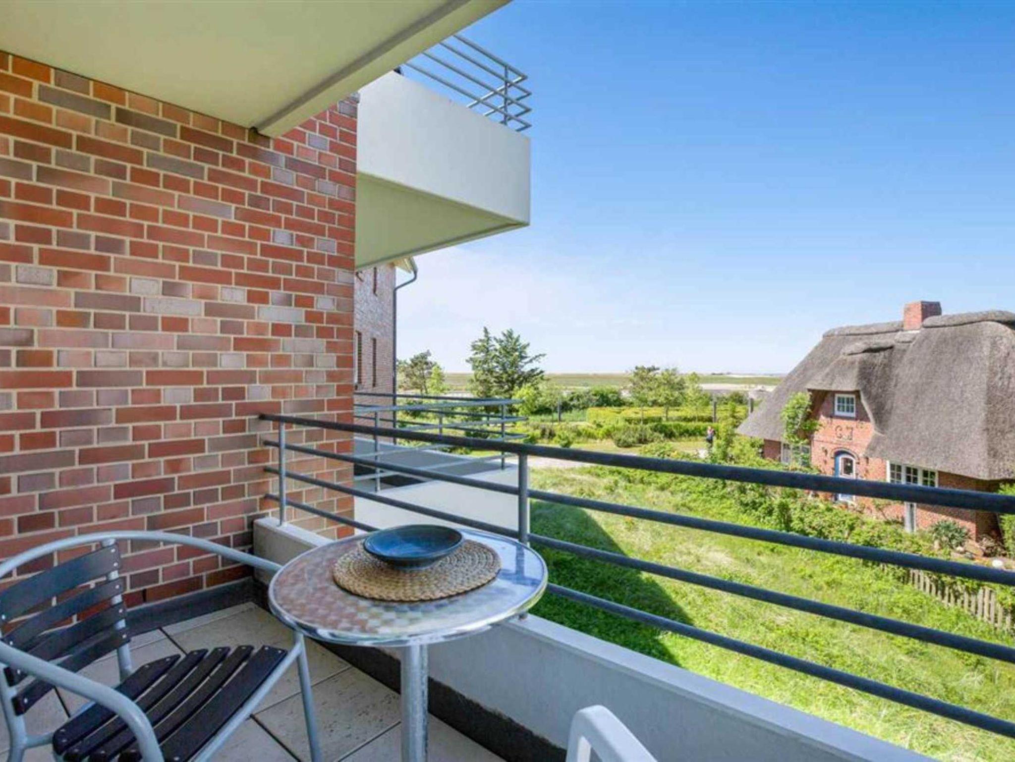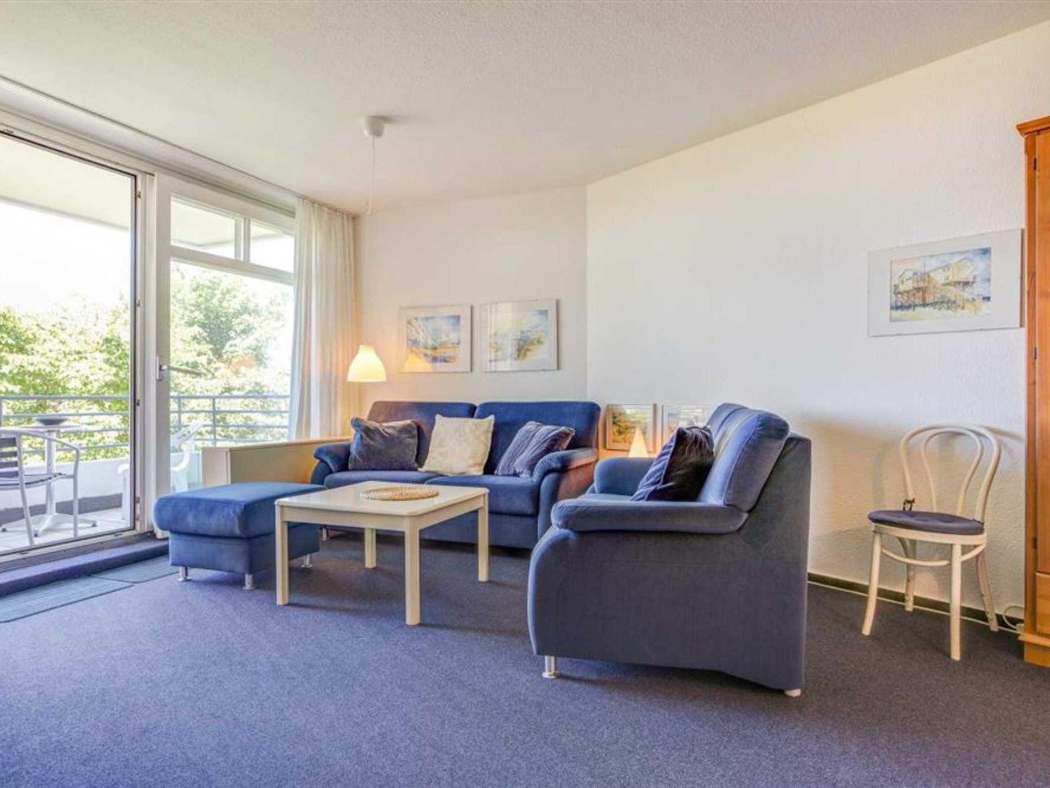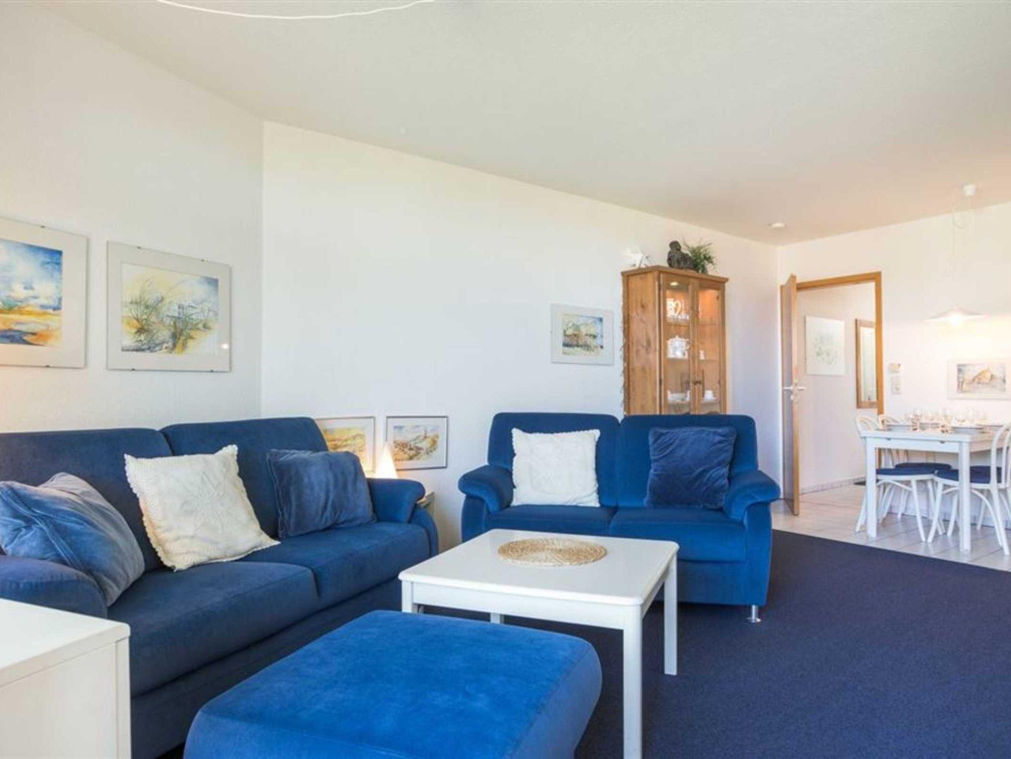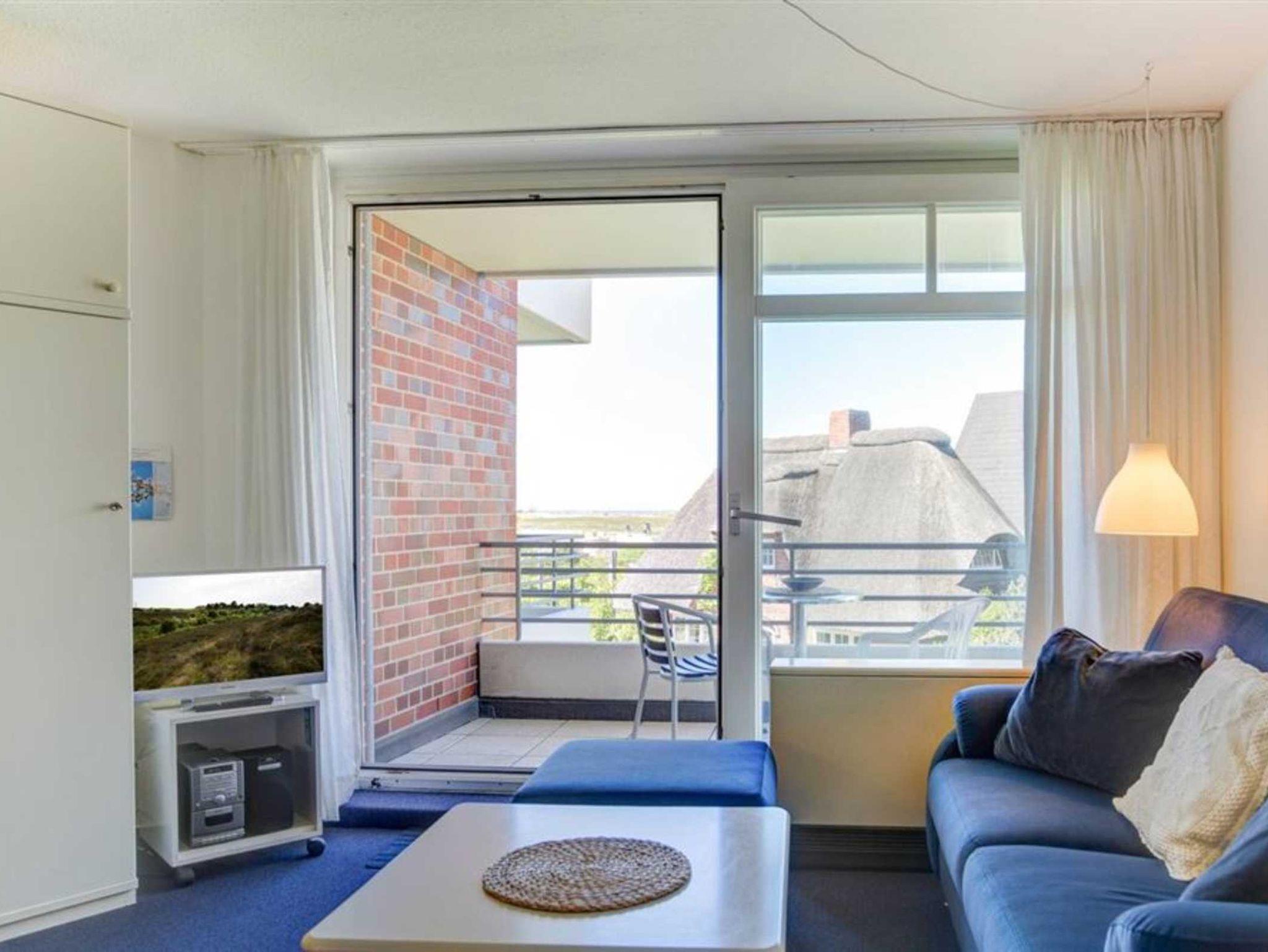 Wohnzimmer mit 2 Sofas (2er), ausklappbarem Schrank-Doppelbett (2x 80x200cm), TV (Kabel), Hifi-Anlage und Esstisch mit 4 Stühlen. Direkter Zugang zum möblierten Balkon nach Westen mit phänomenalem Ausblick über ein schönes Reetdachhaus und die Deichpromenade bis zu den Pfahlbauten am Strand. Halboffene Küche mit Herd mit 2 Ceran-Kochstellen, Kühlschrank mit Gefrierfach und Geschirrspüler.