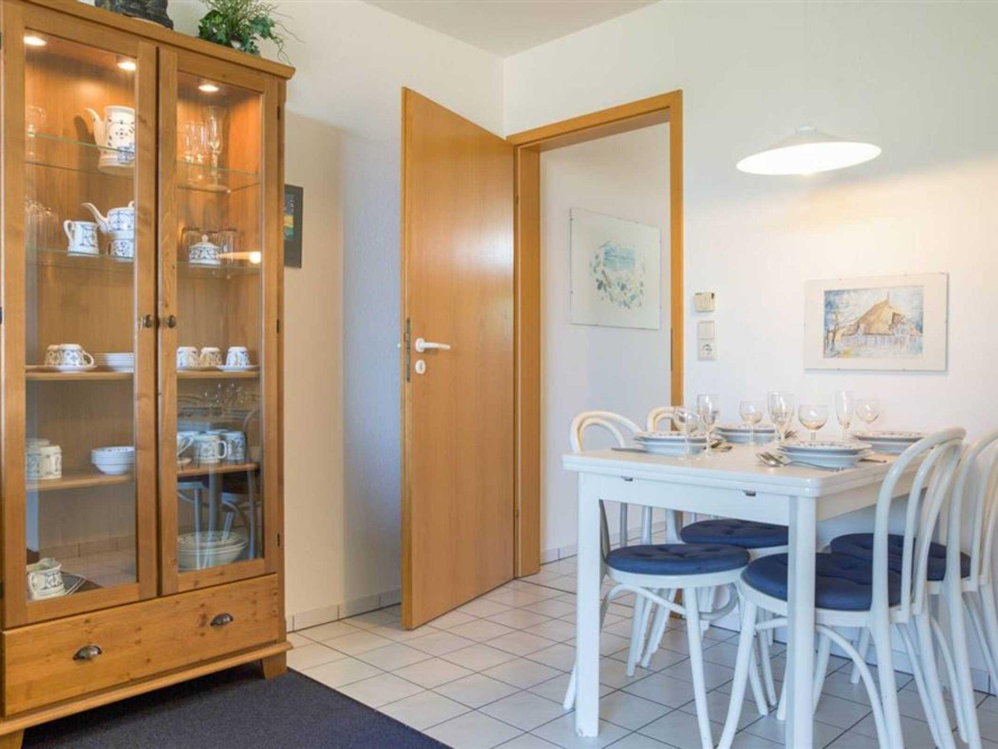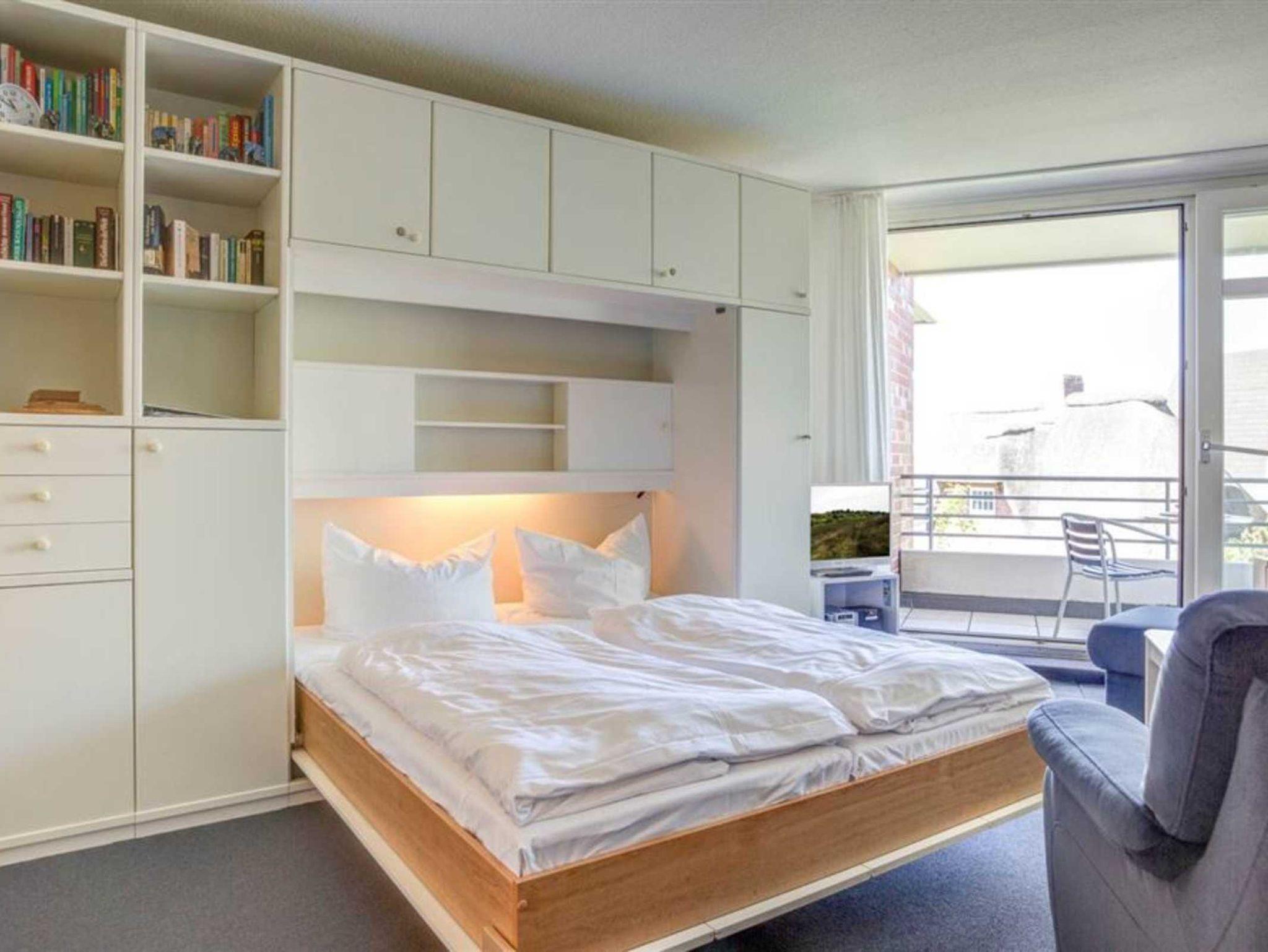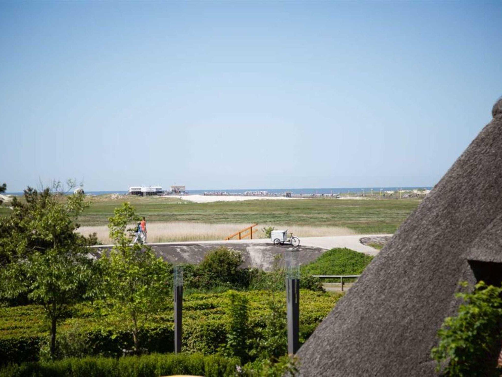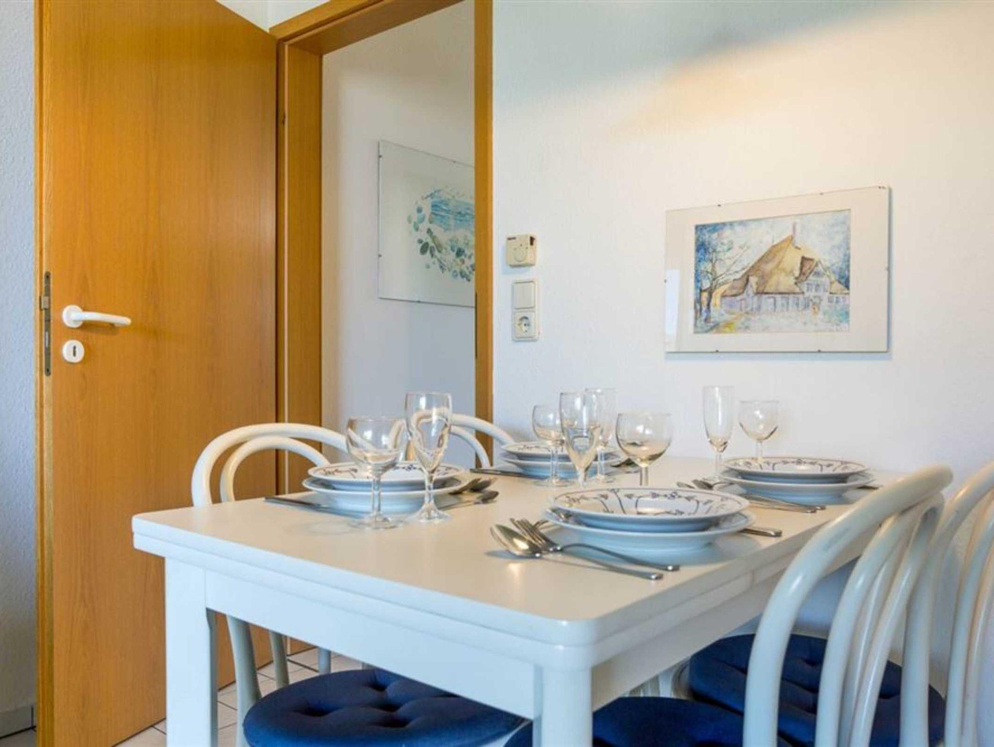 Wohnzimmer mit 2 Sofas (2er), ausklappbarem Schrank-Doppelbett (2x 80x200cm), TV (Kabel), Hifi-Anlage und Esstisch mit 4 Stühlen. Direkter Zugang zum möblierten Balkon nach Westen mit phänomenalem Ausblick über ein schönes Reetdachhaus und die Deichpromenade bis zu den Pfahlbauten am Strand. Halboffene Küche mit Herd mit 2 Ceran-Kochstellen, Kühlschrank mit Gefrierfach und Geschirrspüler.