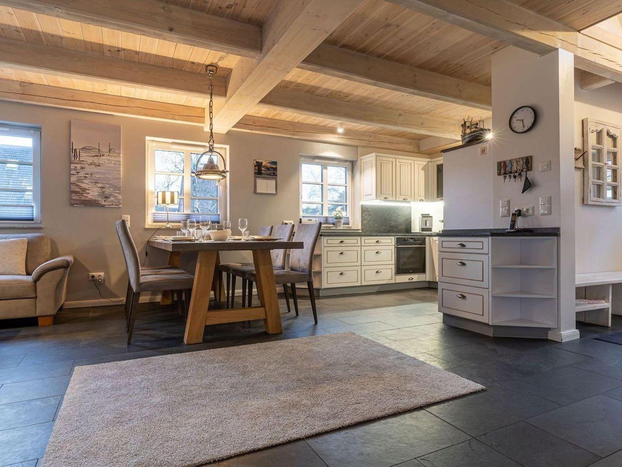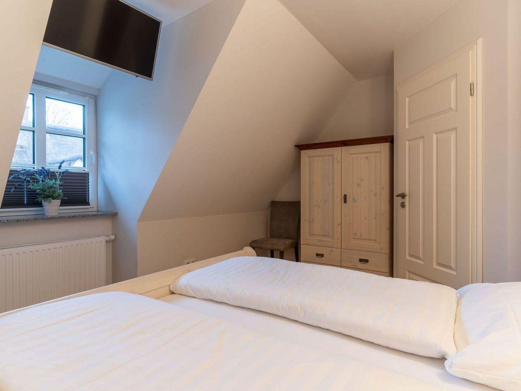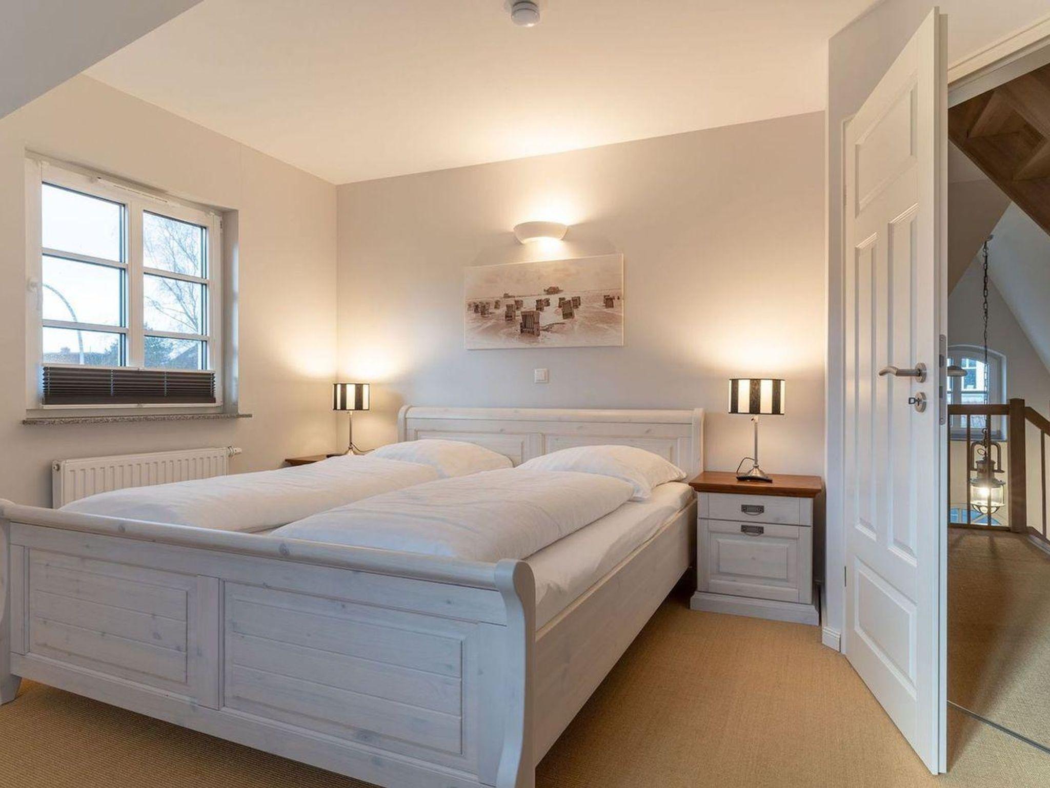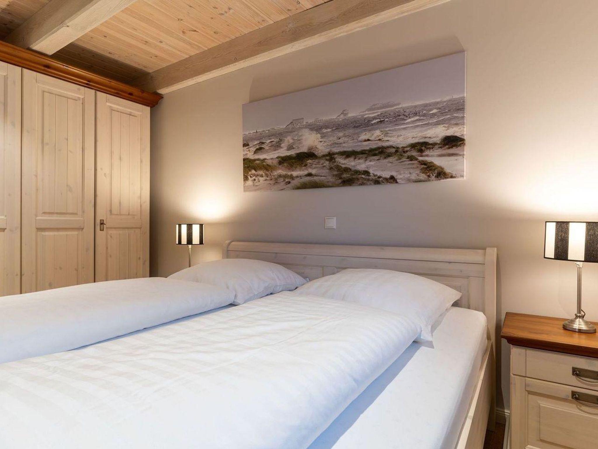 Die wunderschöne Haushälfte unter Reet verfügt über ca. 130 m² und bietet Platz für 1-6 Personen.Im Erdgeschoss befindet sich der lichtdurchflutete Wohnraum mit TV, Kamin, einer offenen Küche sowie einem stilvollen Essbereich.Die Küche ist ausgestattet mit Backofen und Geschirrspüler, sowie einem Esperto-Caffè-Automat, Toaster, Wasserkocher und den üblichen Küchenutensilien.An den Wohnbereich schließen sich ein Flur, ein Duschbad und ein Doppelschlafzimmer an.Das Erdgeschoss ist rollstuhlfreundlich.Über eine Holztreppe gelangt man in das Obergeschoss. Die beiden Schlafzimmer, jeweils mit einem Doppelbett sorgen für ruhevolle Erholung.Im ersten Stock befindet sich ausserdem ein weiteres Duschbad sowie eine Sauna.