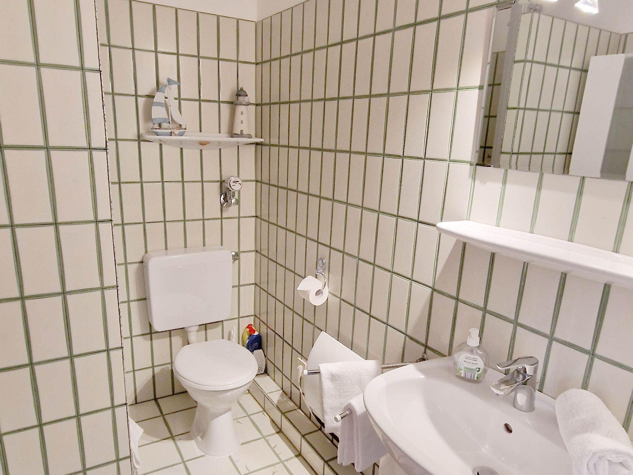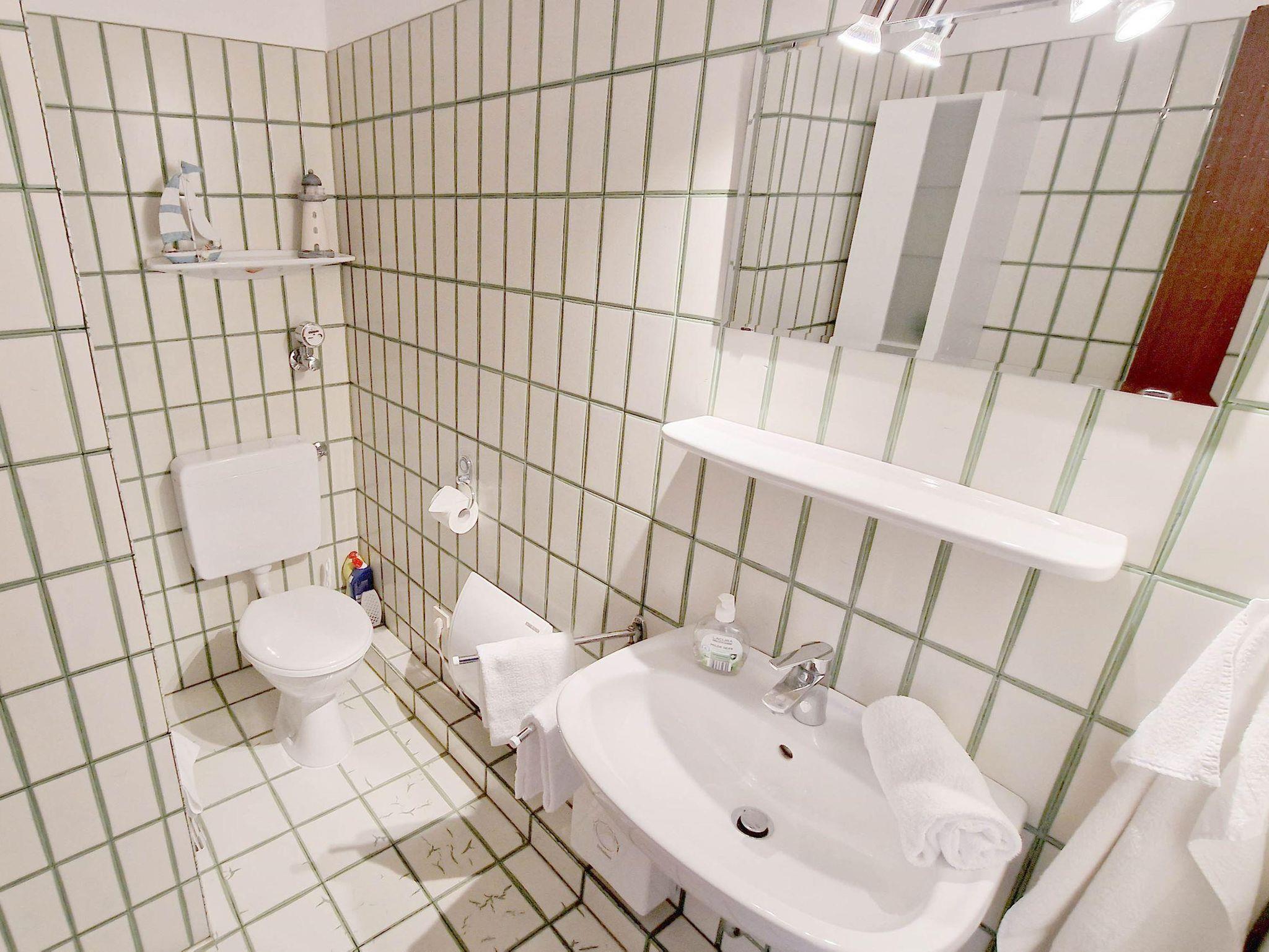 Bad:Dusche, Waschbecken, WC, Schrank, Duschkabine, Hocker