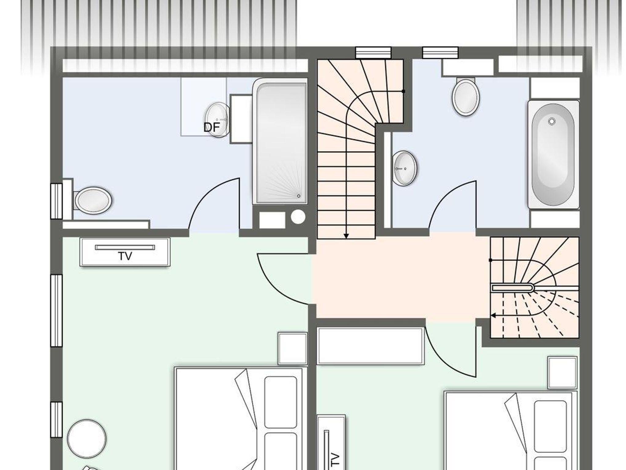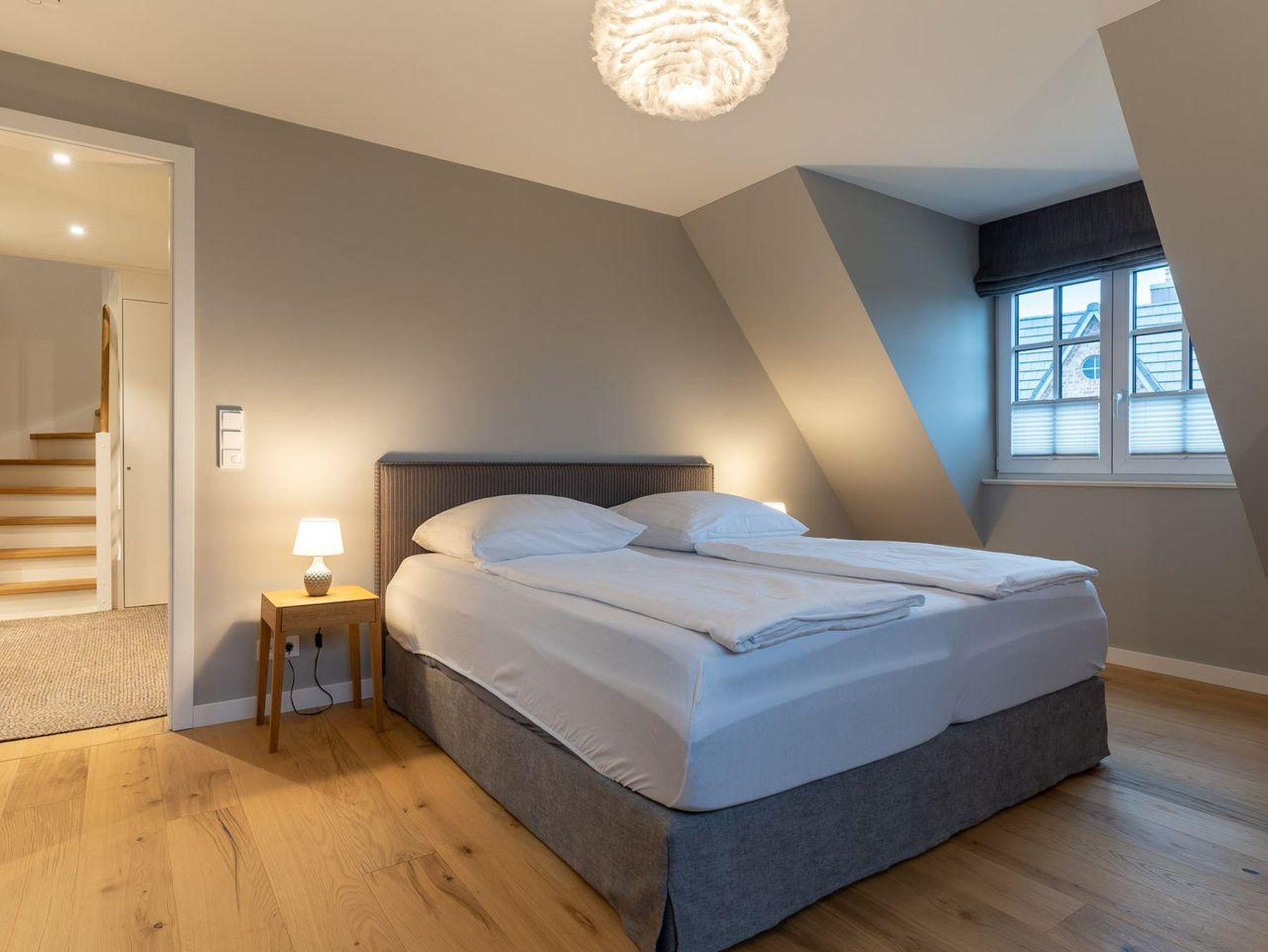 Über eine Holztreppe gelangt man in das Obergeschoss. Die beiden Schlafräume verfügen über komfortable Doppelbetten und Kleiderschränke gewähren Ihnen hinreichend Ablageflächen. Ein Doppelschlafzimmer verfügt über ein eigenes Duschbad.