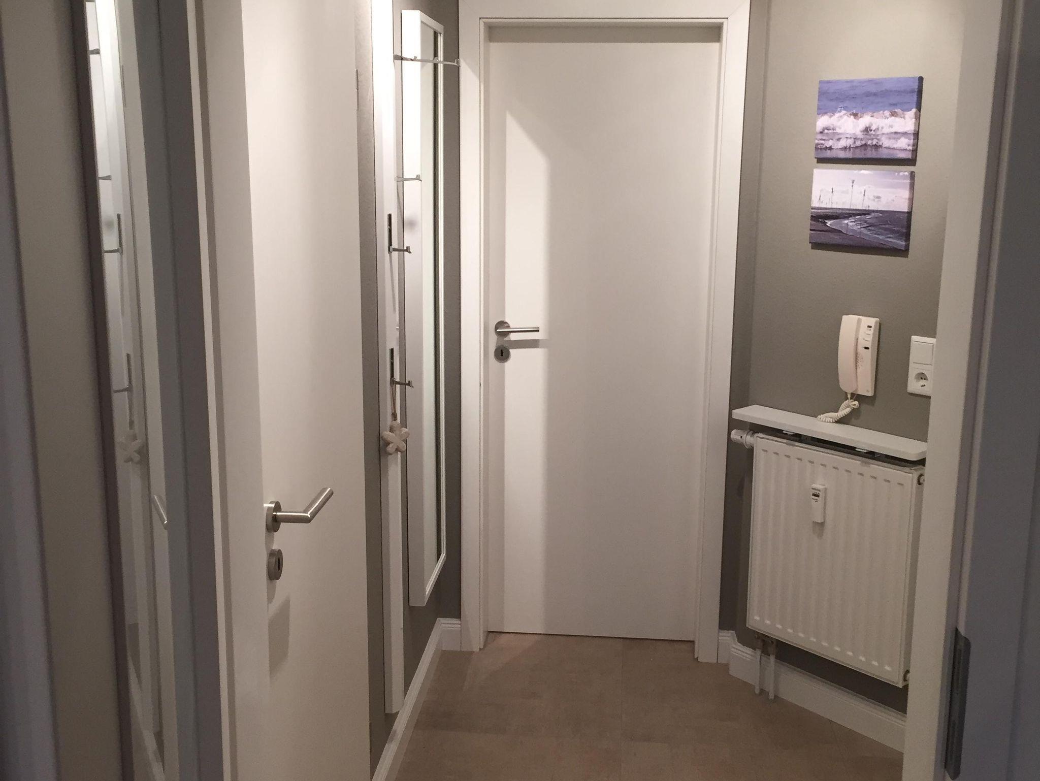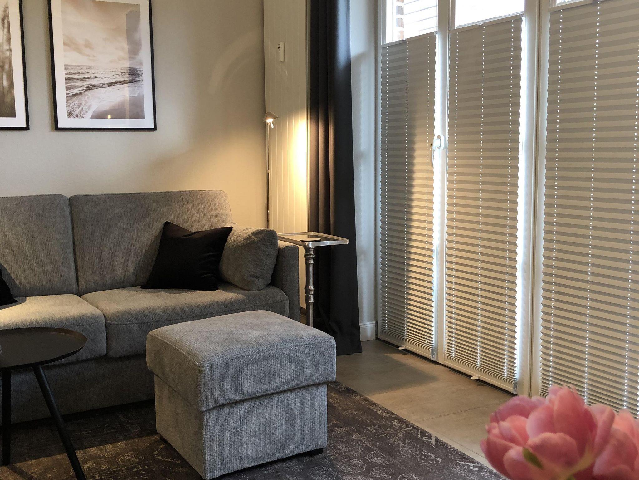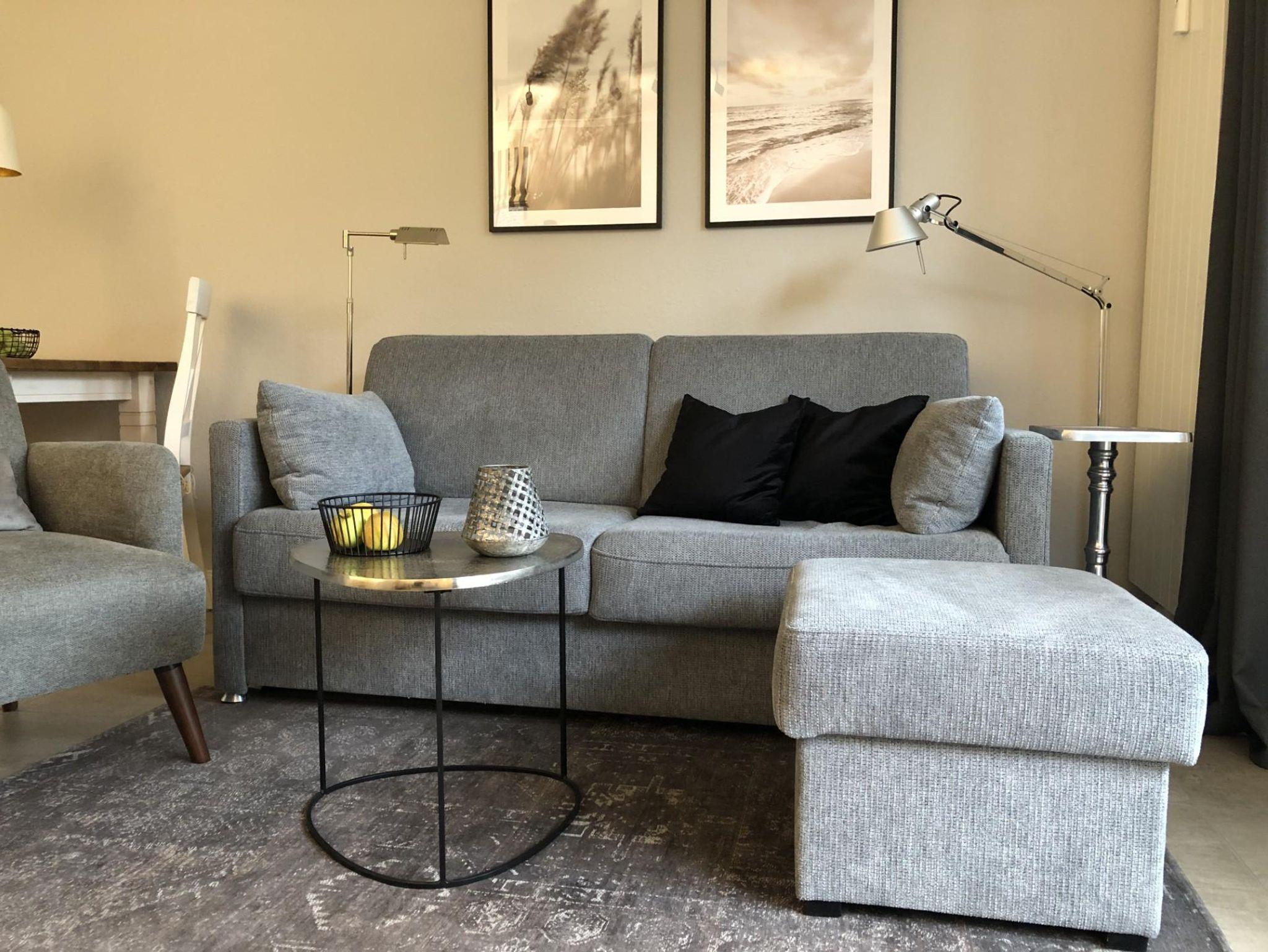 Zu unserem sehr komfortablen und hochwertig ausgestatteten Urlaubsdomizil für max. 2 Personen gehören ein lichtdurchflutetes Wohnzimmer (Blu-Ray, Stereoanlage mit Bluetooth-Funktion, FlachbildTV, kostenfreies WLAN, Reiseführer, Gesellschaftsspiele), Essplatz und Küchenzeile (Cerankochfeld, Backofen, Gefrierfach, Spülmaschine, 2 Kaffeemaschinen). Von hieraus blicken Sie auf die sonnige Terrasse mit Strandkorb über eine großzügige Rasenfläche bis hin zu einem kleinen Wäldchen.