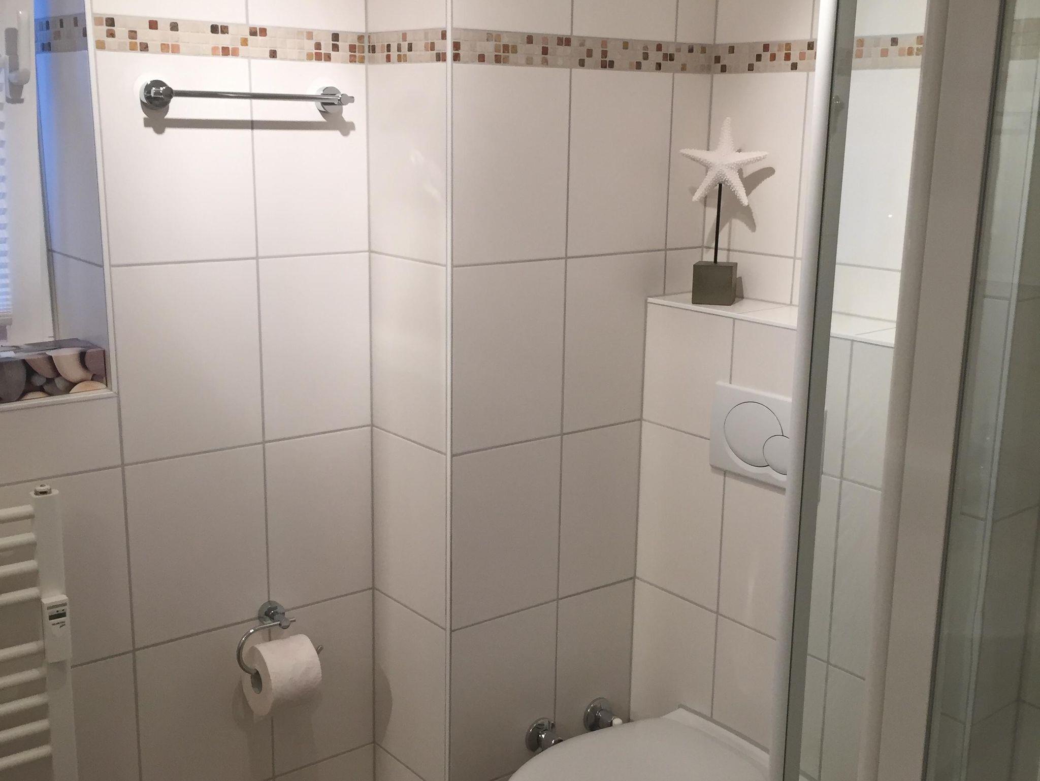 Tageslichtbad: Handtuchwärmer, Dusche, Föhn, Vergrößerungsspiegel.