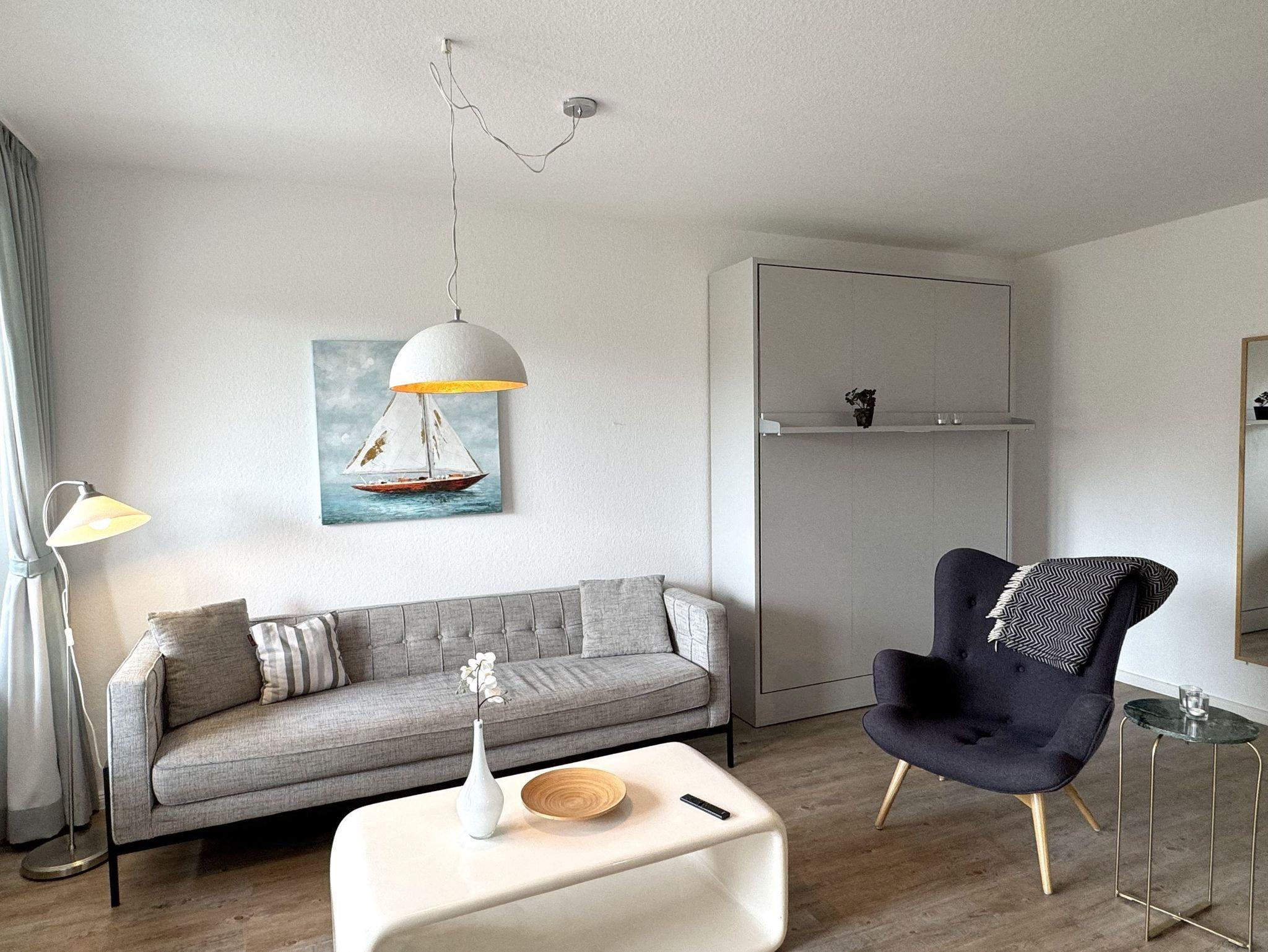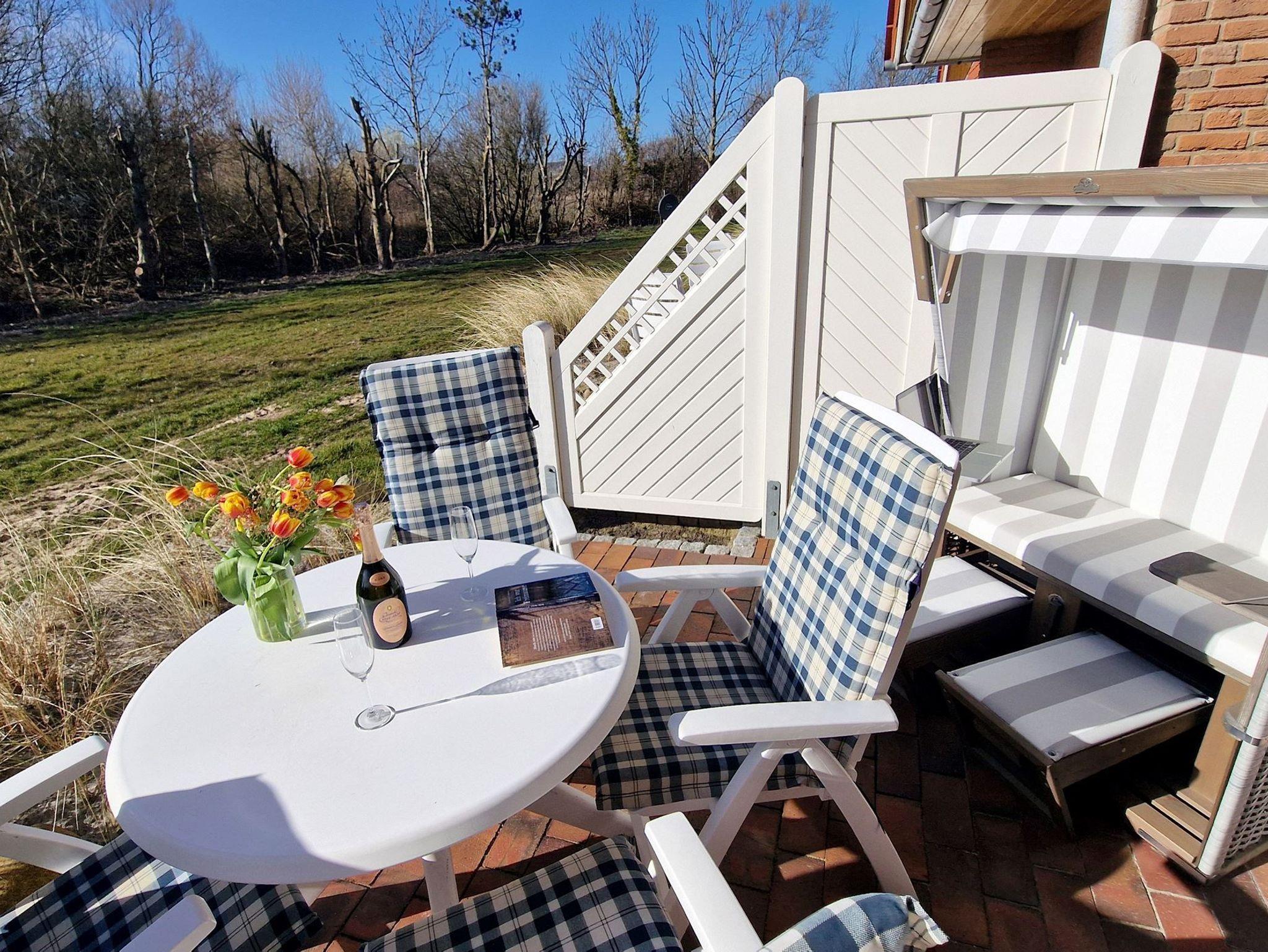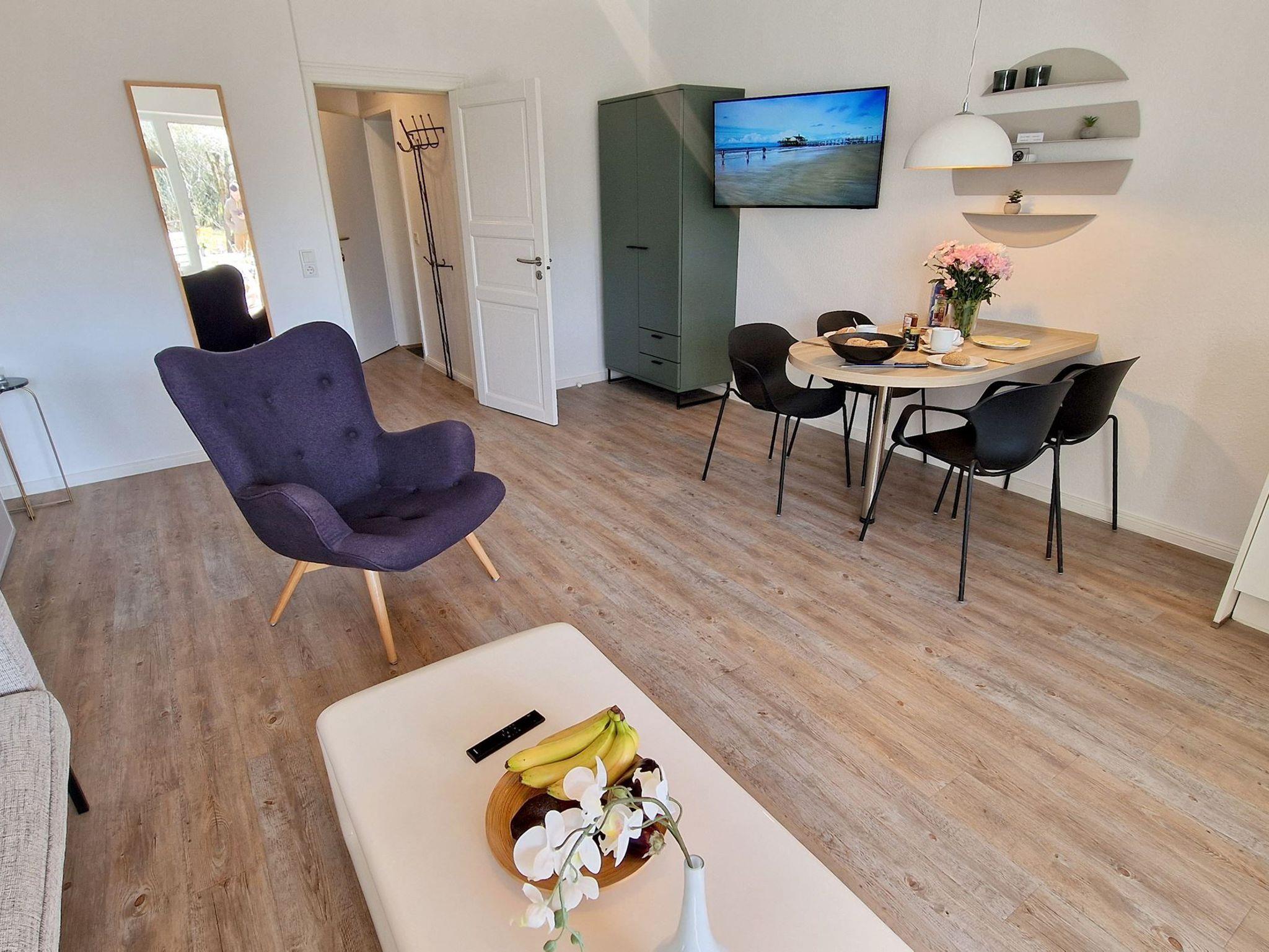 Sie teilt sich wie folgt auf: Eingangsdiele mit Garderobe, Schlafzimmer mit 2 Einzelbetten, Duschbad mit WC. Der großzügige Wohnraum mit direktem Zugang zur Terrasse und Garten überzeugt mit seiner gemütlichen Sitzecke mit direktem Blick nach draußen, moderne, weiße Küche, Essecke und als weitere Schlafmöglichkeit 1 Doppelschrankbett. Die Fußböden der Ferienwohnung sind aus Designerparkett oder Fliesen, Allergikergeeignet.