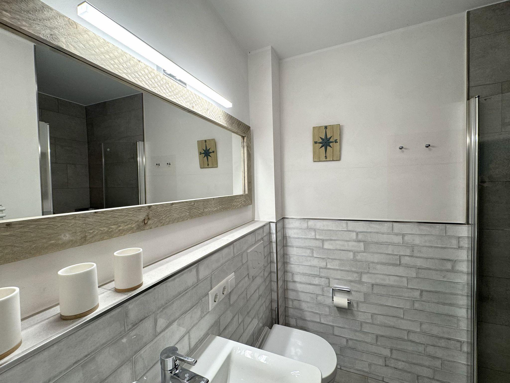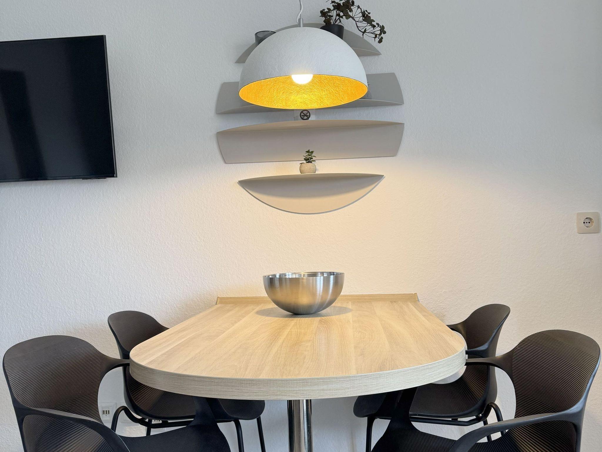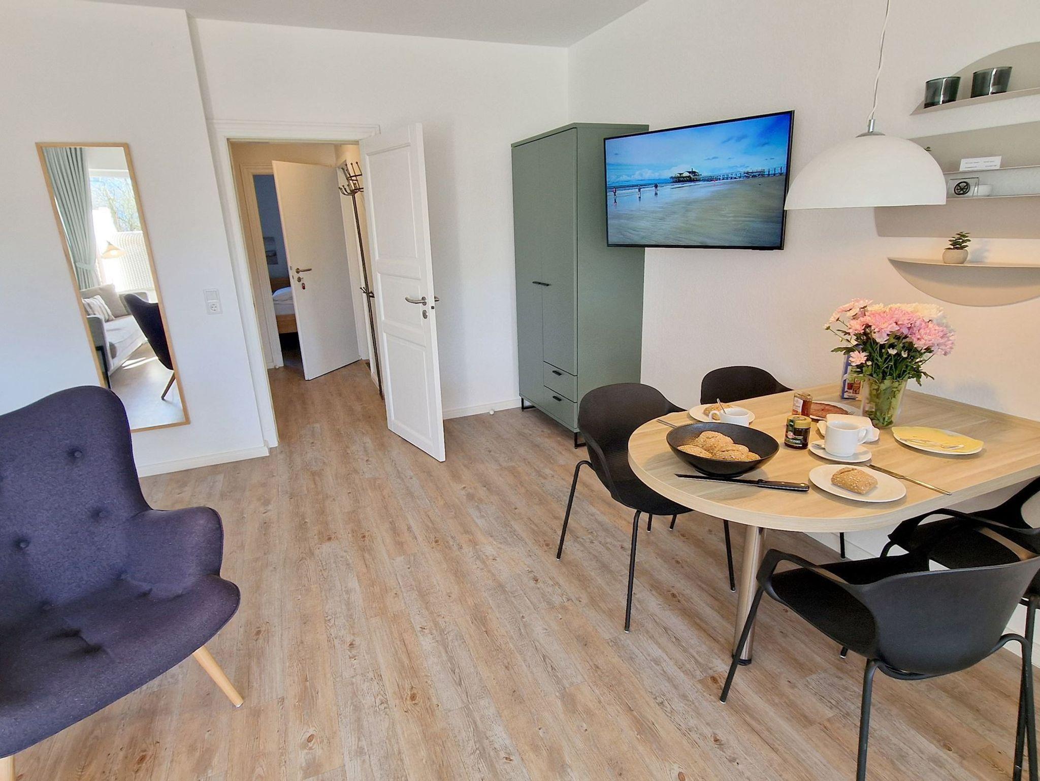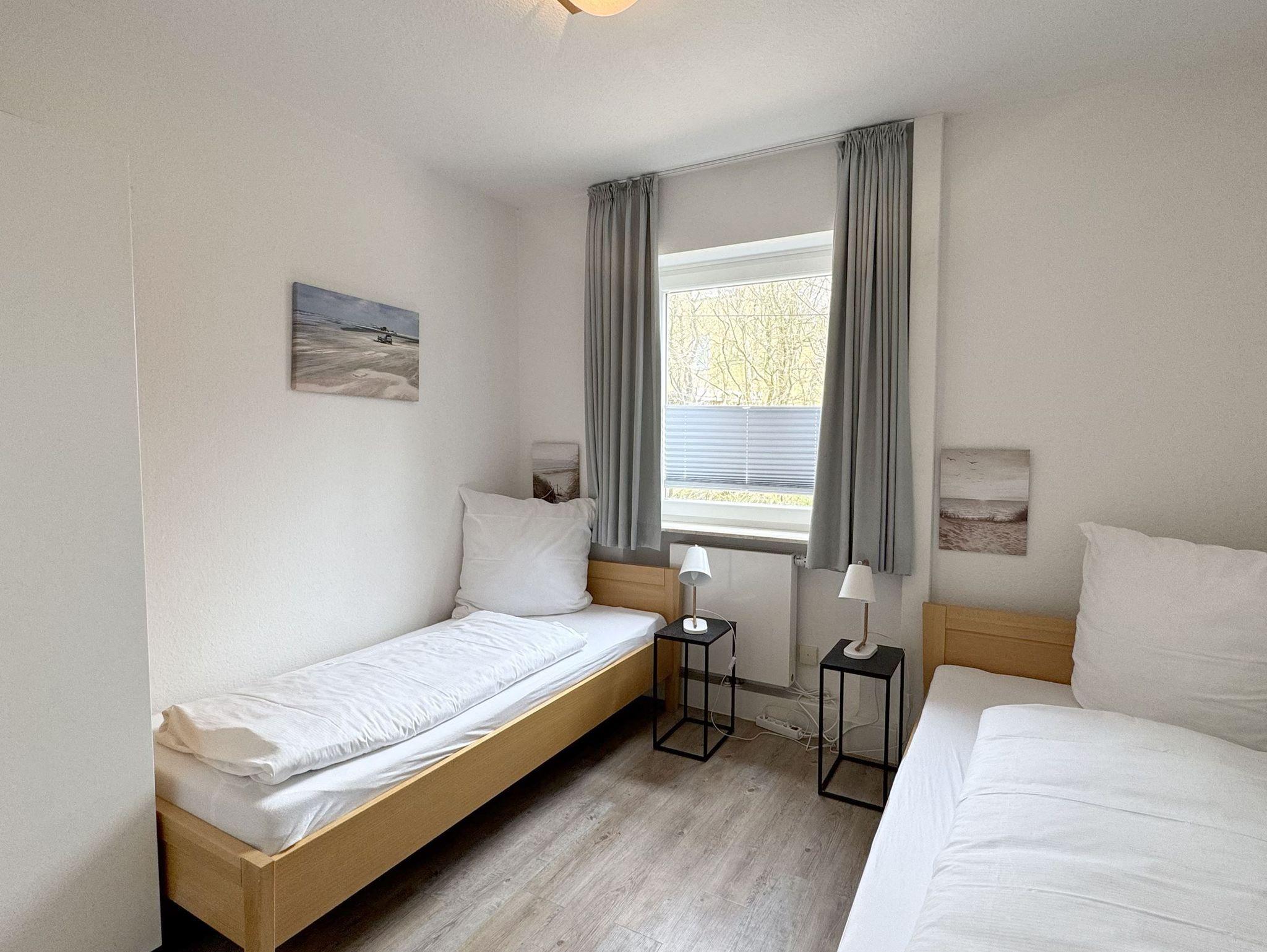 Sie teilt sich wie folgt auf: Eingangsdiele mit Garderobe, Schlafzimmer mit 2 Einzelbetten, Duschbad mit WC. Der großzügige Wohnraum mit direktem Zugang zur Terrasse und Garten überzeugt mit seiner gemütlichen Sitzecke mit direktem Blick nach draußen, moderne, weiße Küche, Essecke und als weitere Schlafmöglichkeit 1 Doppelschrankbett. Die Fußböden der Ferienwohnung sind aus Designerparkett oder Fliesen, Allergikergeeignet.