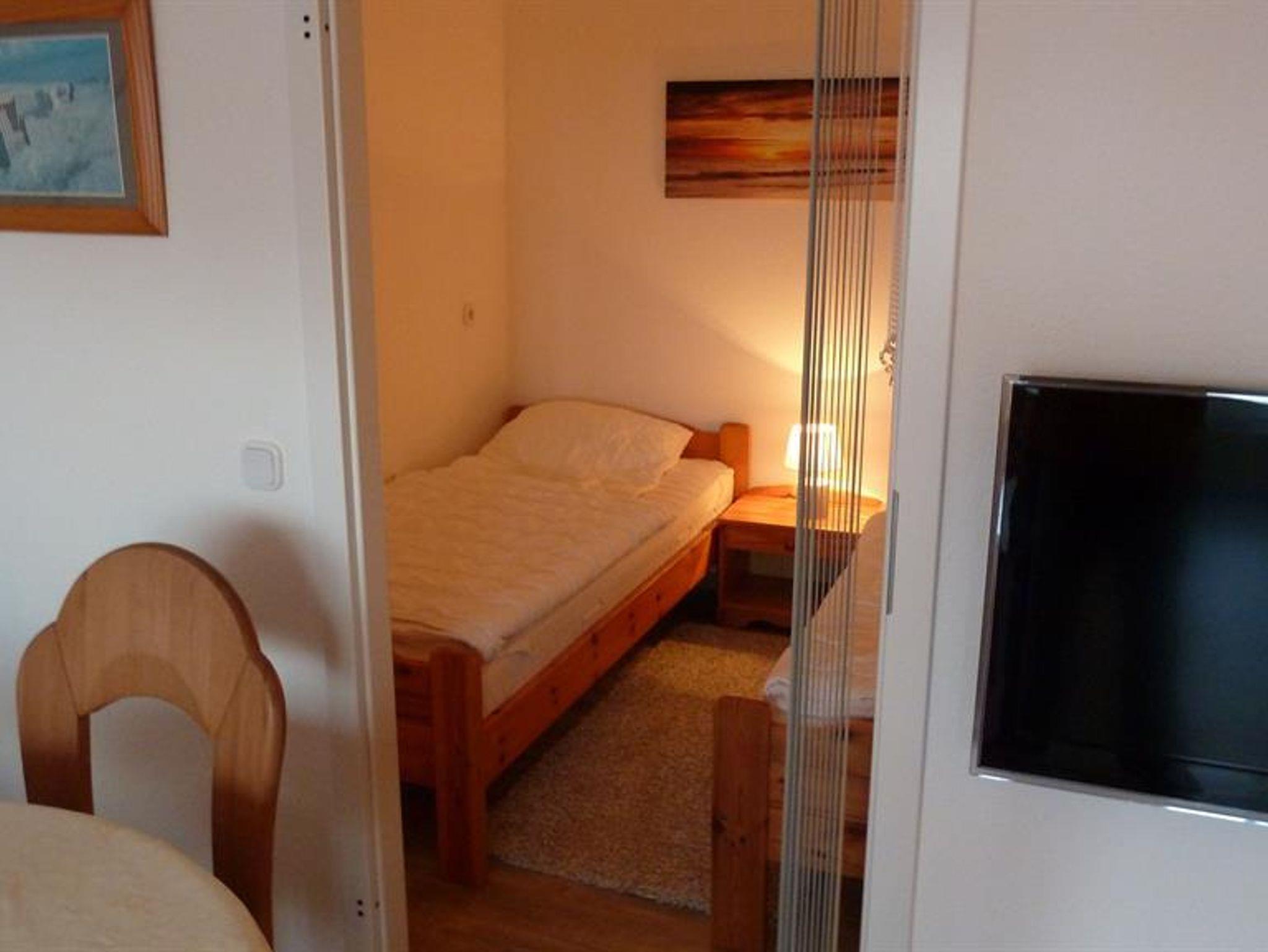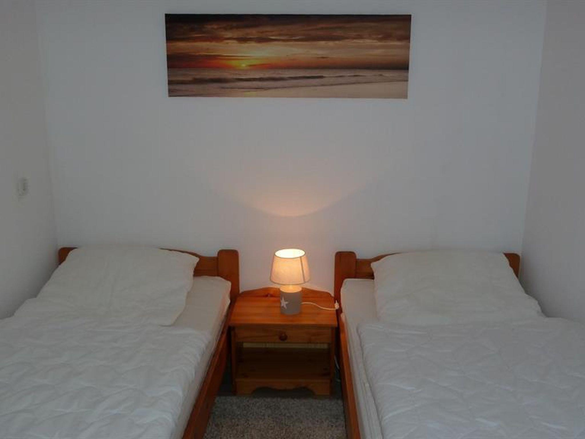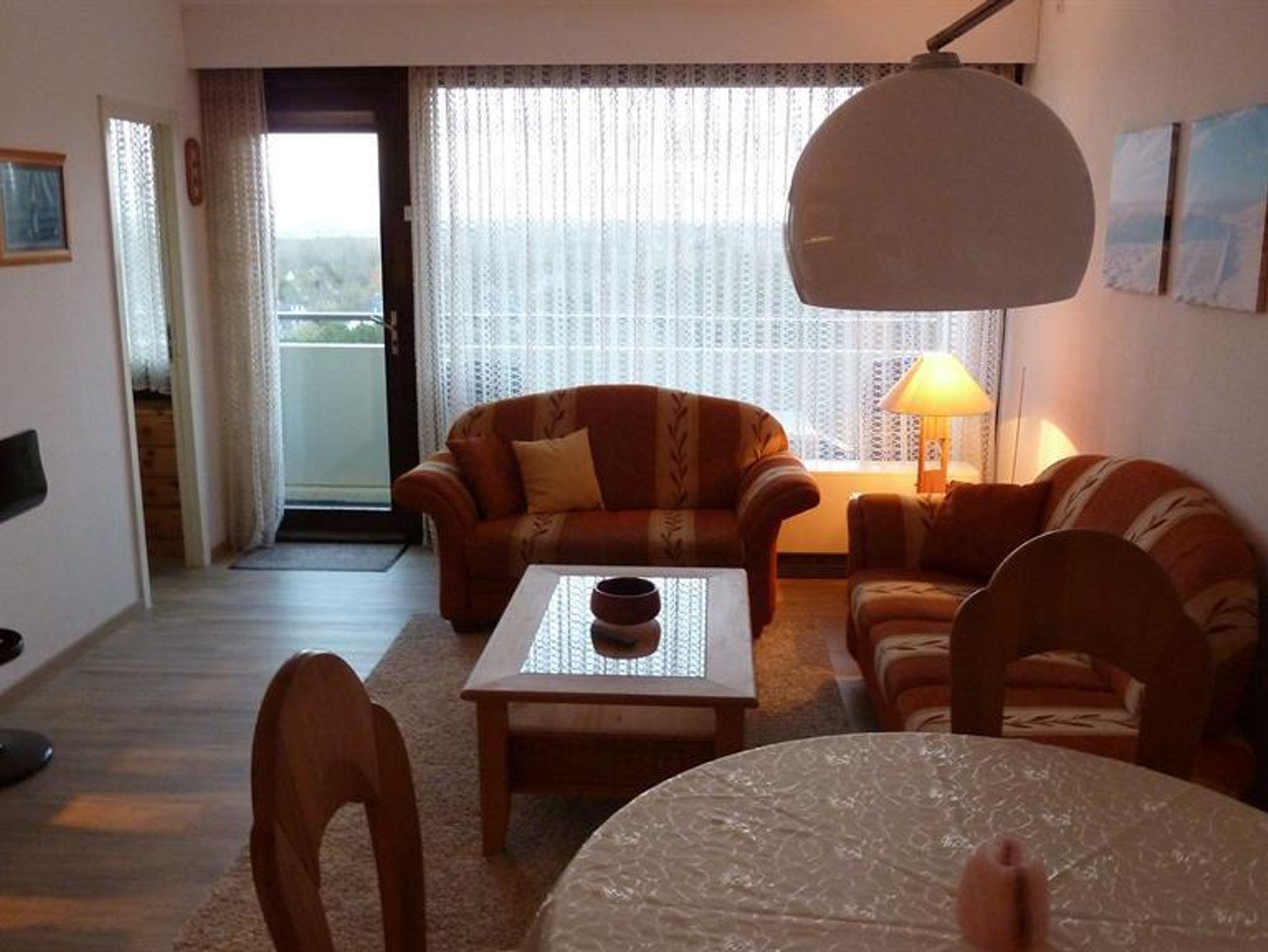 Die Ferienwohnung mit Meerblick besteht aus einem geräumigen Wohnraum (48 qm) mit raumhoher Isolierglas-Panoramascheibe und Balkontür. Der Wohnraum ist u. a. ausgestattet mit einer Eckgarnitur (1 Dreisitzer, 1 Zweisitzer), einem Couchtisch, Esstisch mit vier Stühlen, Wohnwand mit Stereoradio und Farbfernsehgerät (Kabelanschluss) sowie einer Essbar für vier Personen mit Durchreiche zur Küche in der außer dem kompletten Geschirr für sechs Personen ein Elektroherd, eine Kaffeemaschine, ein Eierkocher und ein Kühlschrank zur Verfügung stehen. Durchreiche mit Jalousette als deckenhoher Raumteiler mit Unterschrank und Regalfächern zur Küchenseite. Ein Schlafraum mit zwei Betten, der durch eine Vertikaljalousie vom Wohnraum getrennt ist. Kinderschlafzimmer (2 Bettplätze, Etagenbett). Ein Duschraum mit Waschbecken, Spiegelschrank, Duschwanne mit Duschabtrennung und WC. Flur mit Garderobenecke und geräumigen Einbauschrank. Bettwäsche und Handtücher können gegen eine Gebühr von 15,00 € pro Set und Person angemietet werden. ***Bitte die Wäsche bei Bedarf vorher bestellen, da diese nicht in der Wohnung vorhanden ist.**********
