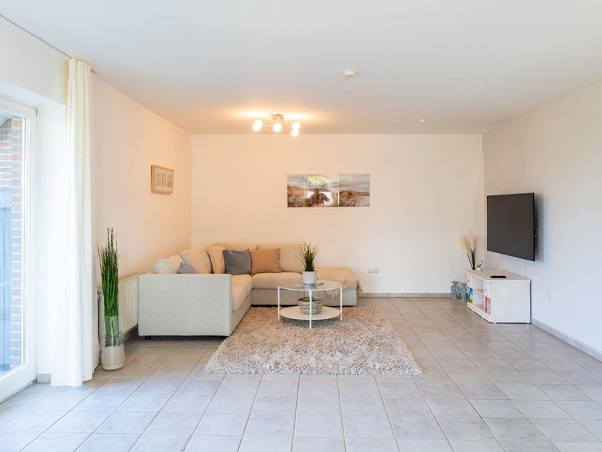 1 Wohnraum mit Sitzecke, Radio, Farb-TV, DVD-Player und vollständig eingerichteter Küchenzeile mit Backofen sowie Geschirrspülmaschine und Eßecke und Ausgang zur Terrasse mit Strandkorb.1 Schlafraum mit Einzelbetten. 1 Schlafraum mit Doppelbett, Dusche/WC und Flur. Die Wohnung ist komplett gefliest und hat Fußbodenheizung. Spiele und Bücher stehen zur Verfügung. Komfortabel und liebevoll eingerichtet. Für Allergiker geeignet.