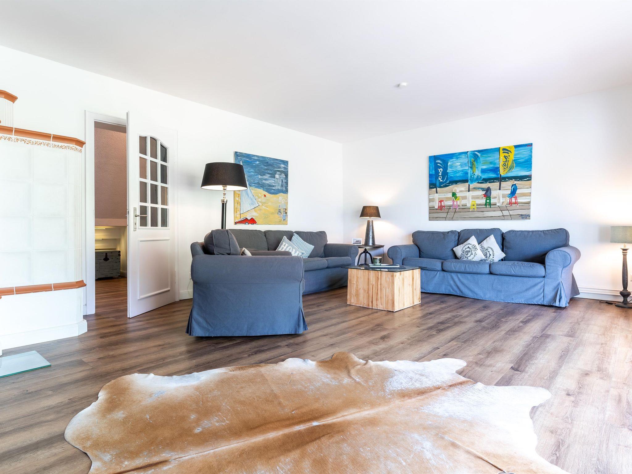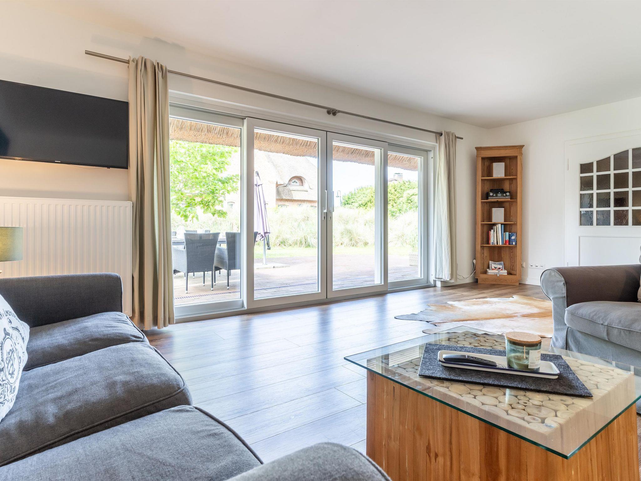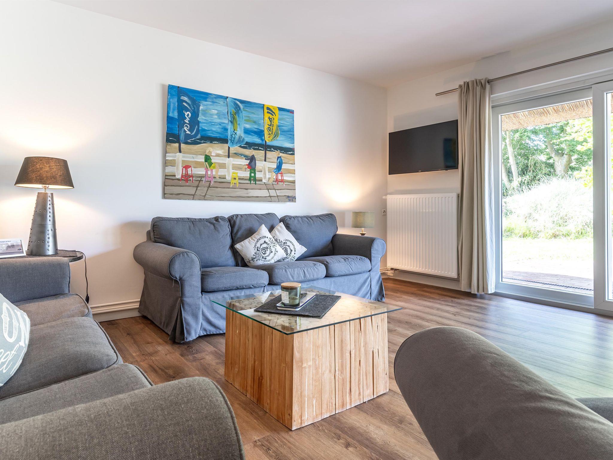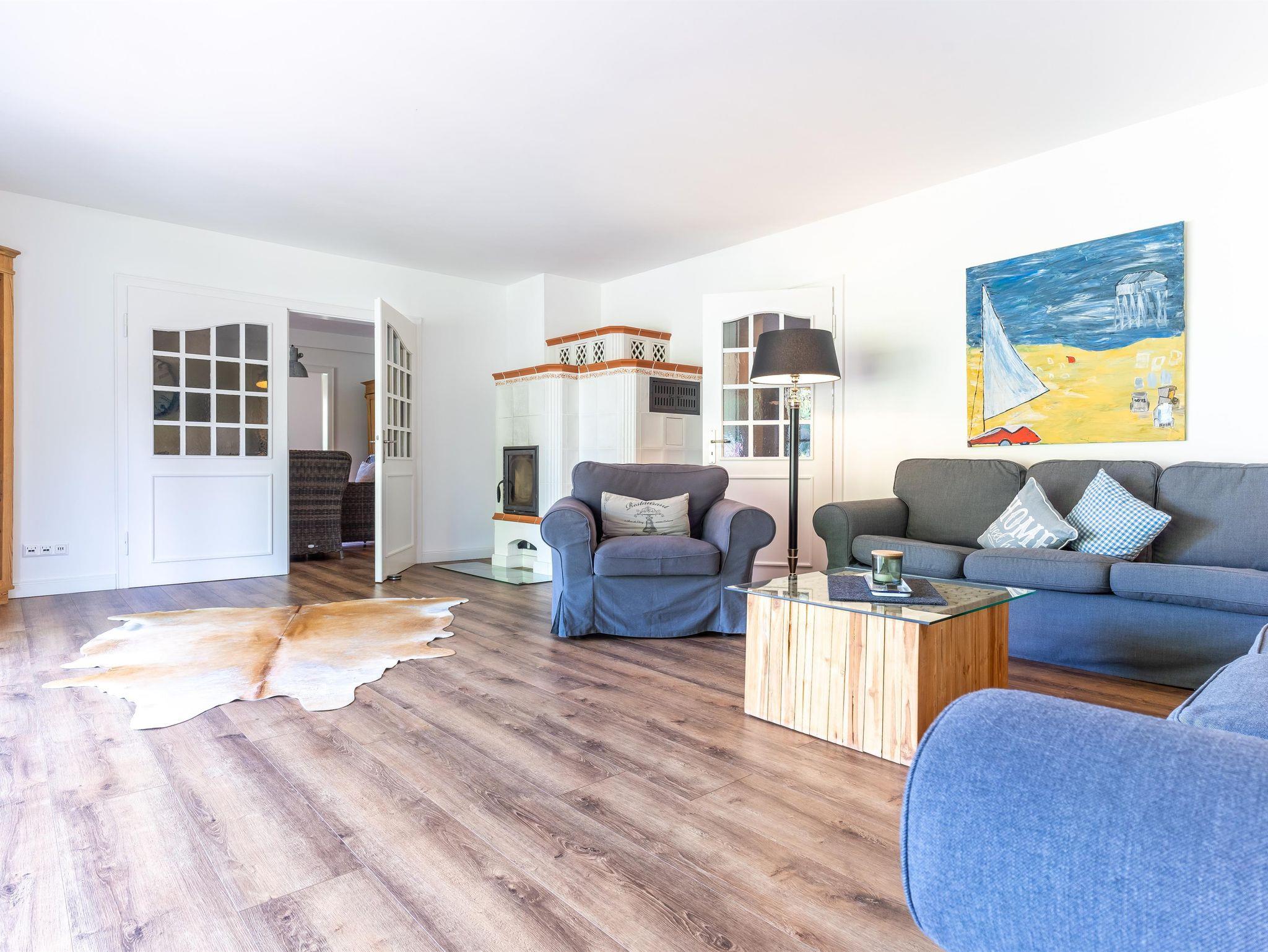Die Wohnung verfügt über eine voll eingerichtete Küche mit Geschirrspüler, Mikrowelle, Herd, Backofen, Kühlschrank und Eisschrank. Die gemütliche Wohnung bietet für 4 Personen Platz. Die Schlafzimmer sind klassisch mit einem Ehebett und zwei Einzelbetten sowie alten Bauernschränken möbliert. Selbstgemalte Bilder runden die individuelle Einrichtung ab. Das Bad hat eine Badewanne mit Duschvorrichtung. Vom großem Wohnzimmer mit aufschiebbaren Fensterelementen blickt man auf eine kleine Düne und erreicht ebenfalls die Terrasse. An kühlen Tagen kann der Kaminofen beheizt werden.