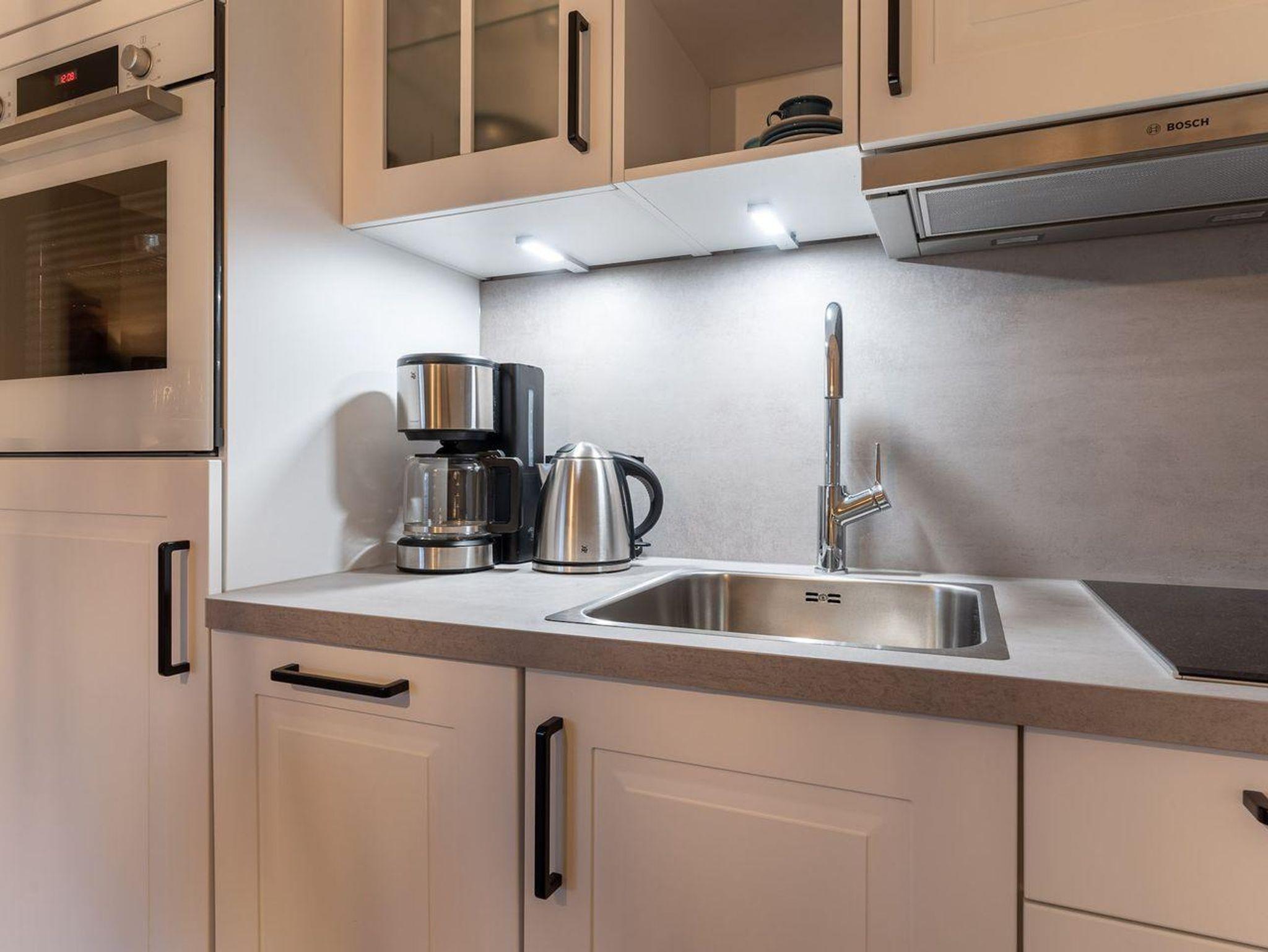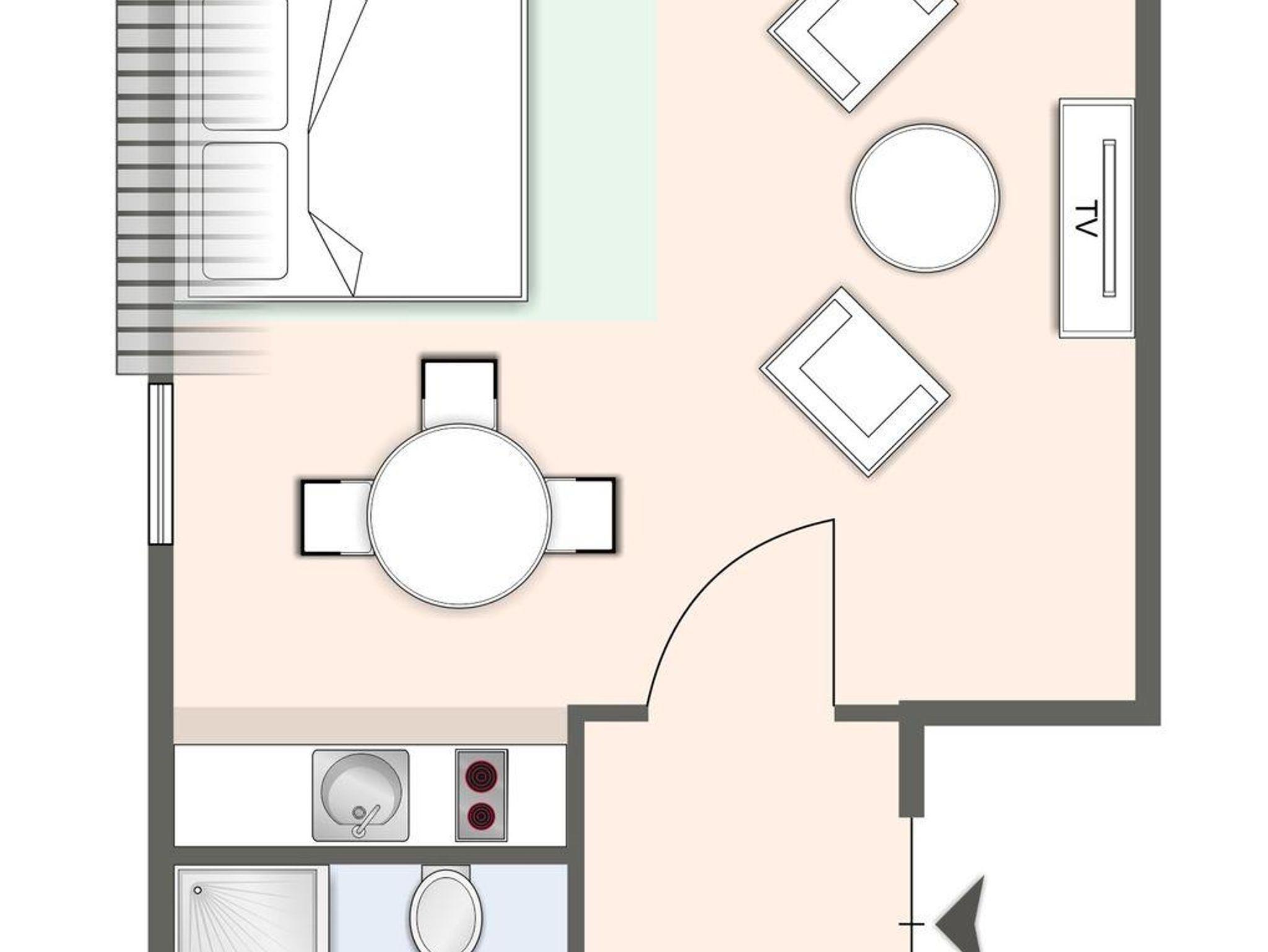 Durch einen Eingangsbereich mit Garderobe und Spiegel gelangen Sie in den zentralen Raum, den Wohn-Essbereich. Hier finden Sie eine gemütliche Sitzecke mit zwei modernen Sesseln zum Fernsehen vor, einen Esstisch mit drei Stühlen und direkt an der Wand angebracht, eine Ablagefläche und Lademöglichkeit für z.B. Ihr Handy. Eine Kochnische mit einer umfangreich ausgestatteten Pantryküche fügt sich passend ein und hat mit einem 2-Felder-Ceranfeld, Spülmaschine, Espressokocher, Kühlschrank samt Gefriermöglichkeit usw. so einiges zu bieten.