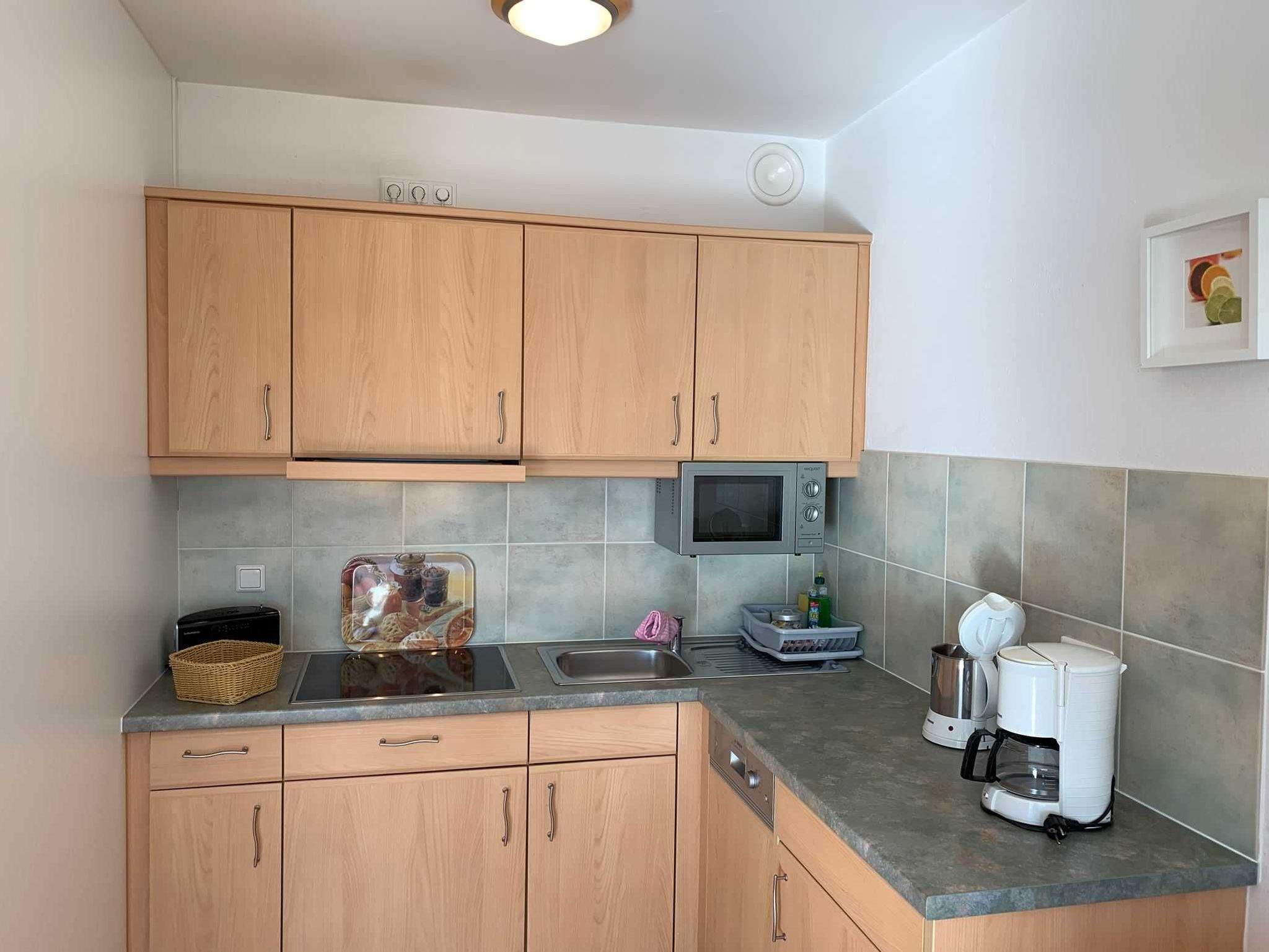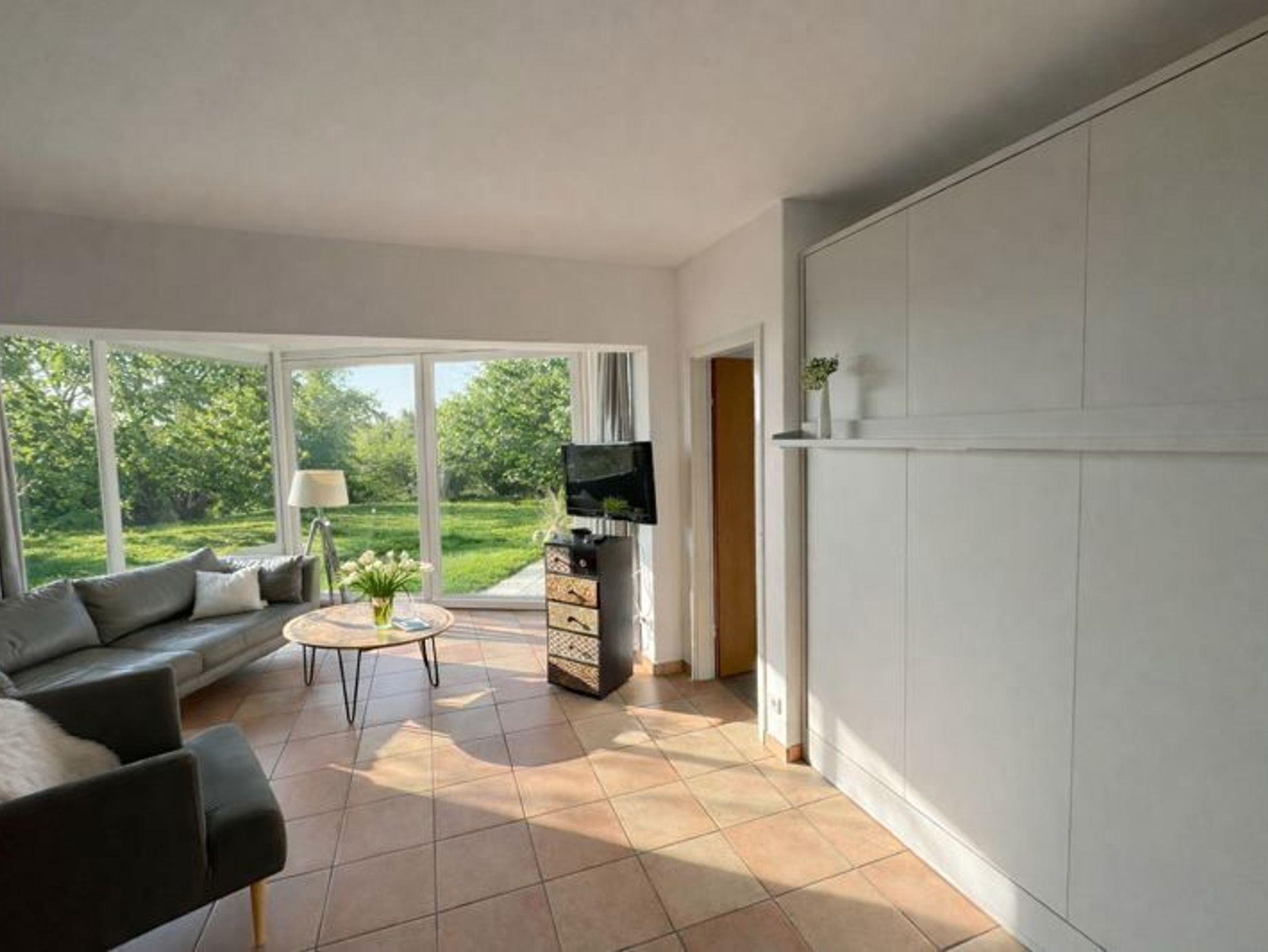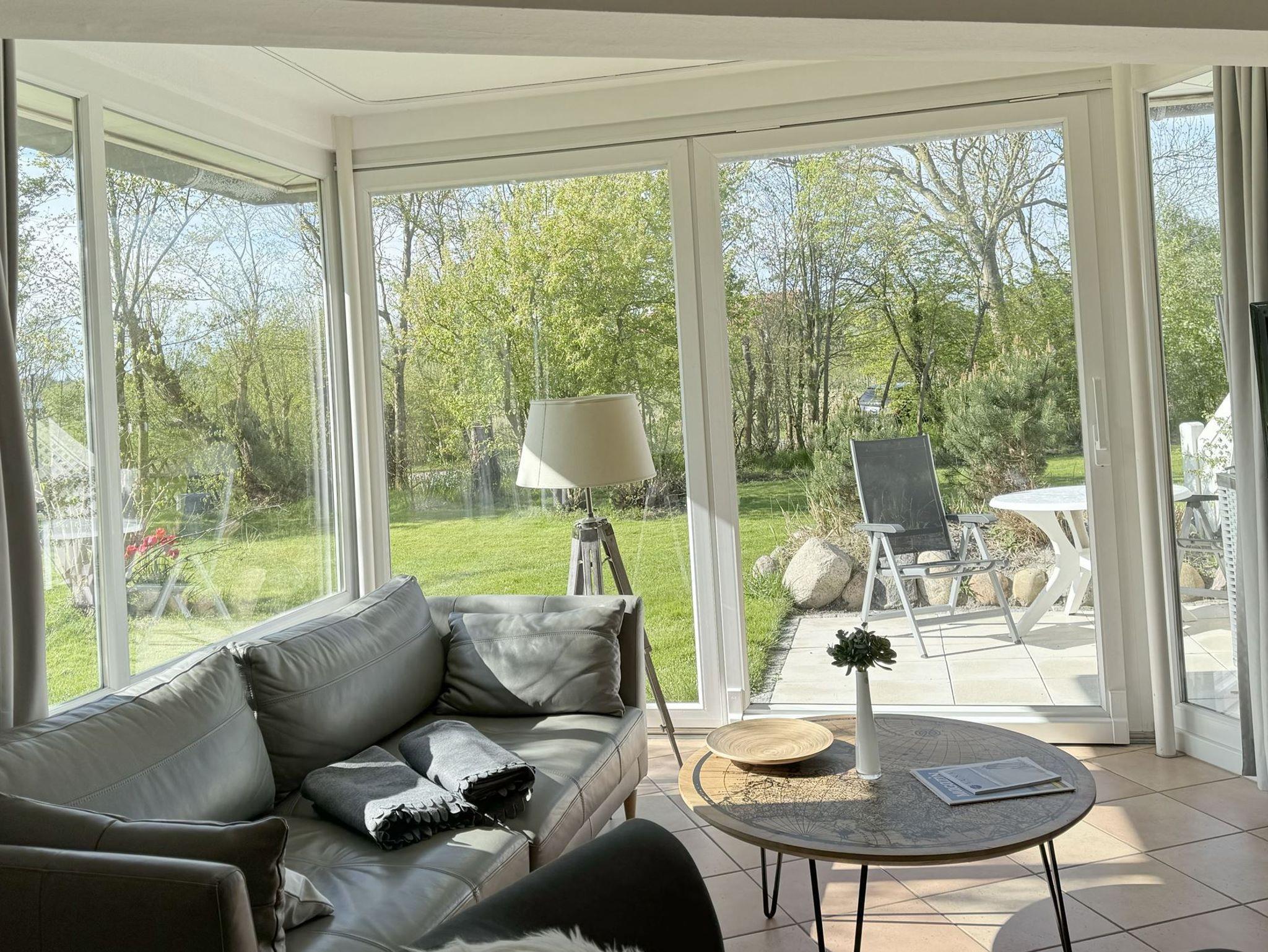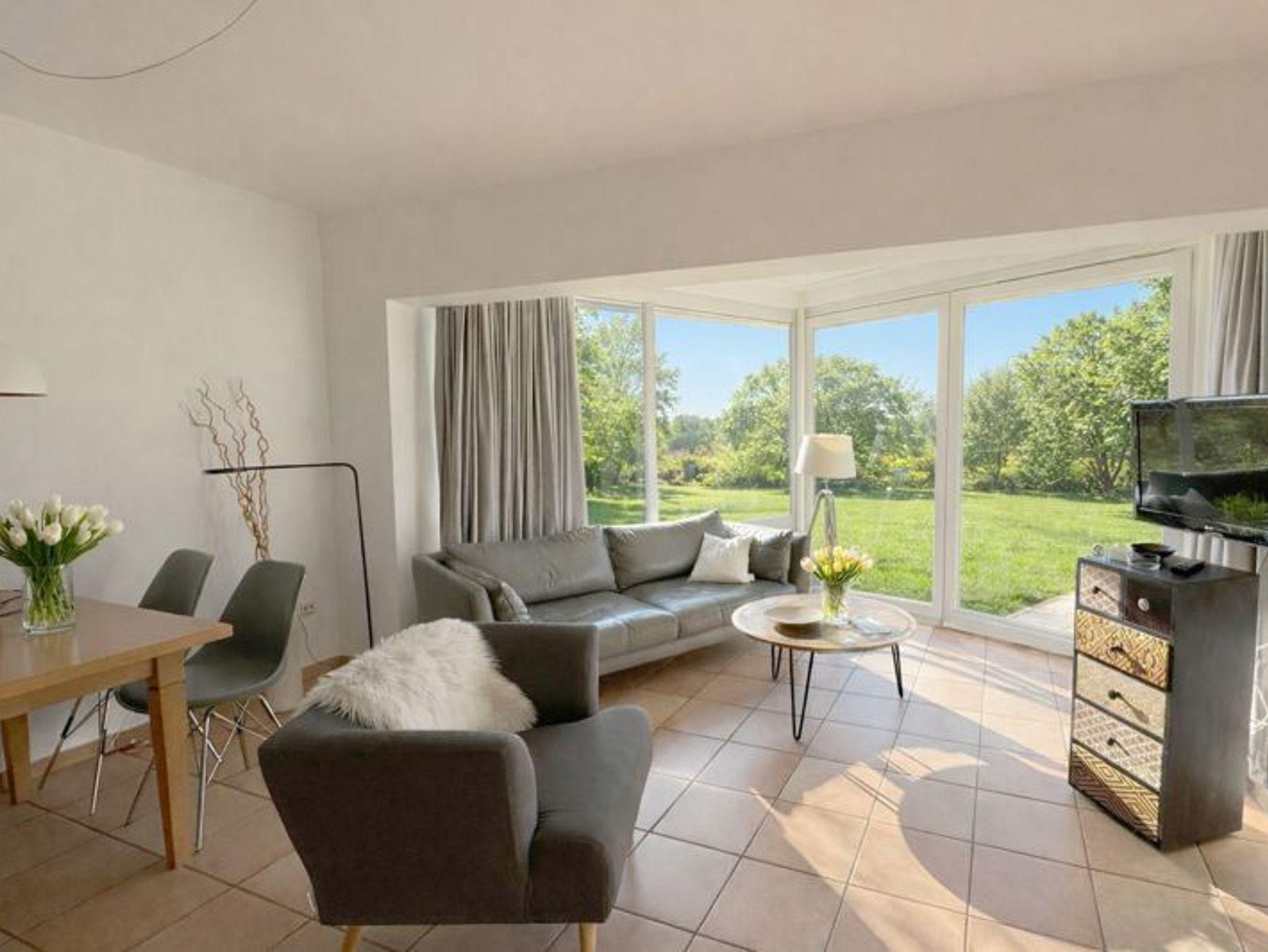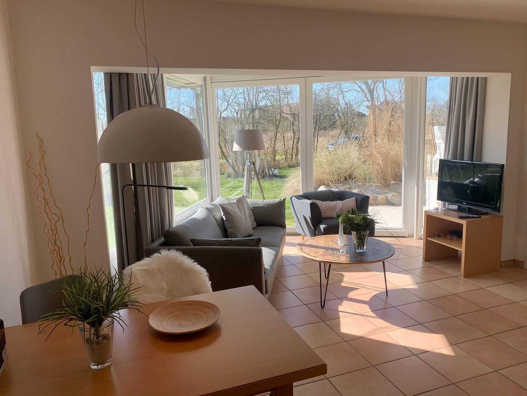 Die Wohnung 3 in der Anlage Luna I liegt im Erdgeschoss des Hauses. Sie ist 55qm groß und geeignet für bis zu 4 Personen. Der Eingangsbereich ist mit einer Garderobe ausgestattet. Das Schlafzimmer verfügt über ein Doppelbett (180x200cm, getrennte Matratzen). Weitere Personen können ein Schrankbett (180x200cm, Matratze nicht durchgehend) im Wohnbereich nutzen. Im Weiteren ist ein Duschbad mit Waschbecken und WC vorhanden. Der Wohn-Essbereich verfügt über eine offene, umfangreich ausgestattete Küche. Im Wohn-Esszimmer befinden sich ein Esstisch und ein Sitzbereich mit Fernseher. WLAN steht kostenlos zur Verfügung. Die Einrichtung ist modern und hochwertig. Der vorgelagerte Wintergarten sorgt für eine angenehme Helligkeit und ermöglicht einen Blick in die wunderschöne Grünanlage. Vom Wohnbereich aus gelangen Sie ebenerdig auf die Südterrasse, die mit Gartenmöbeln und einem Strandkorb ausgestattet ist.