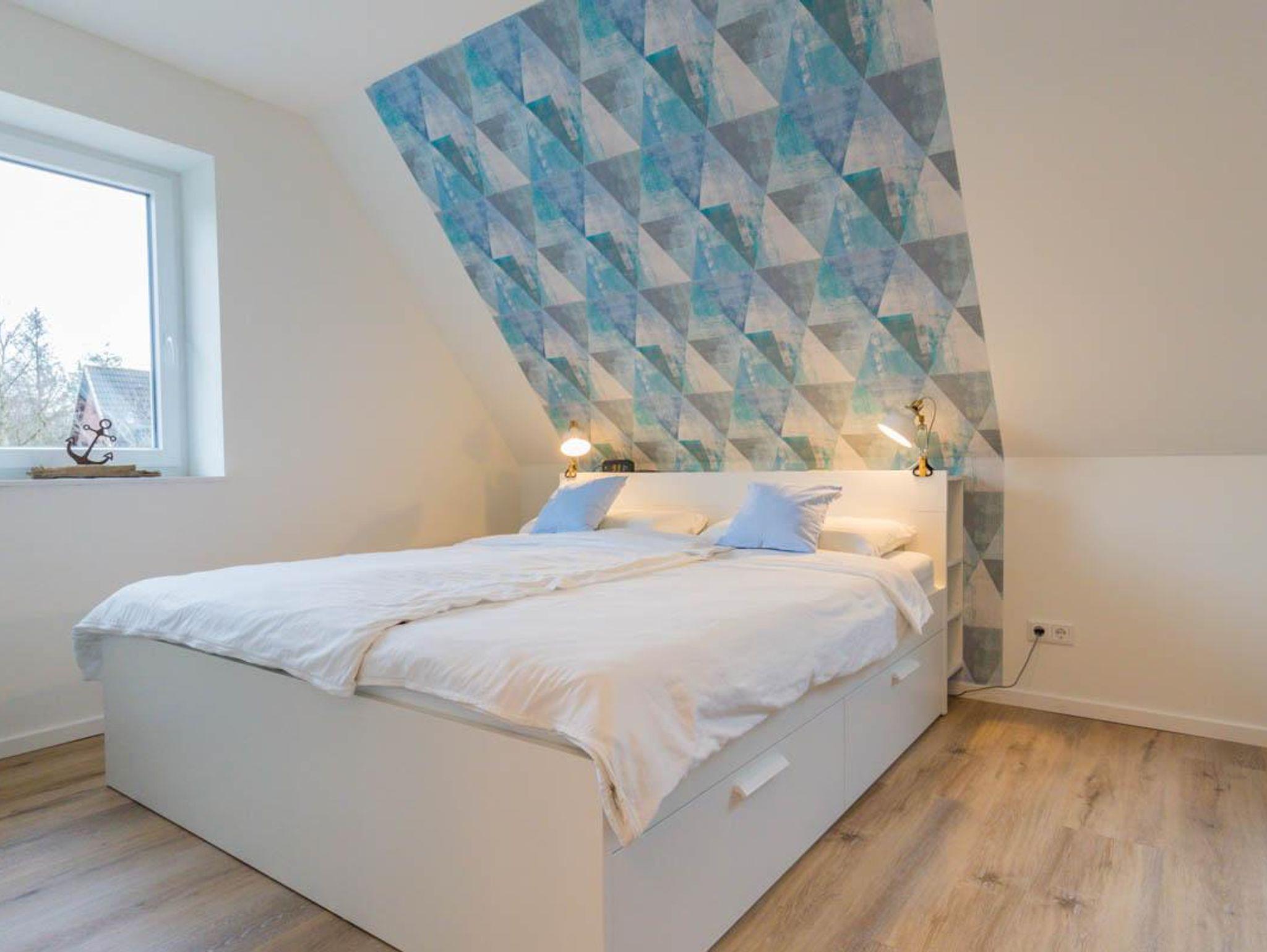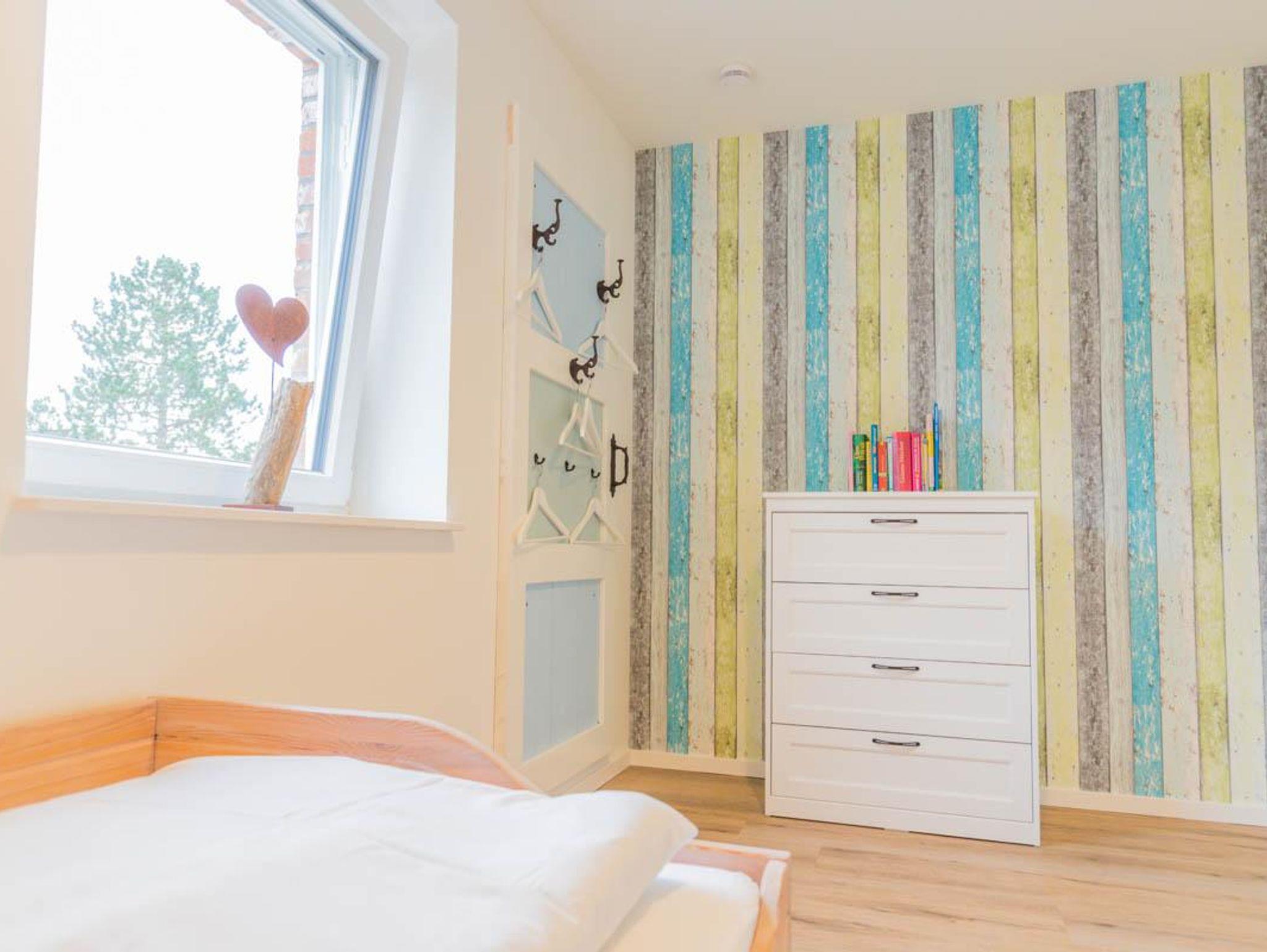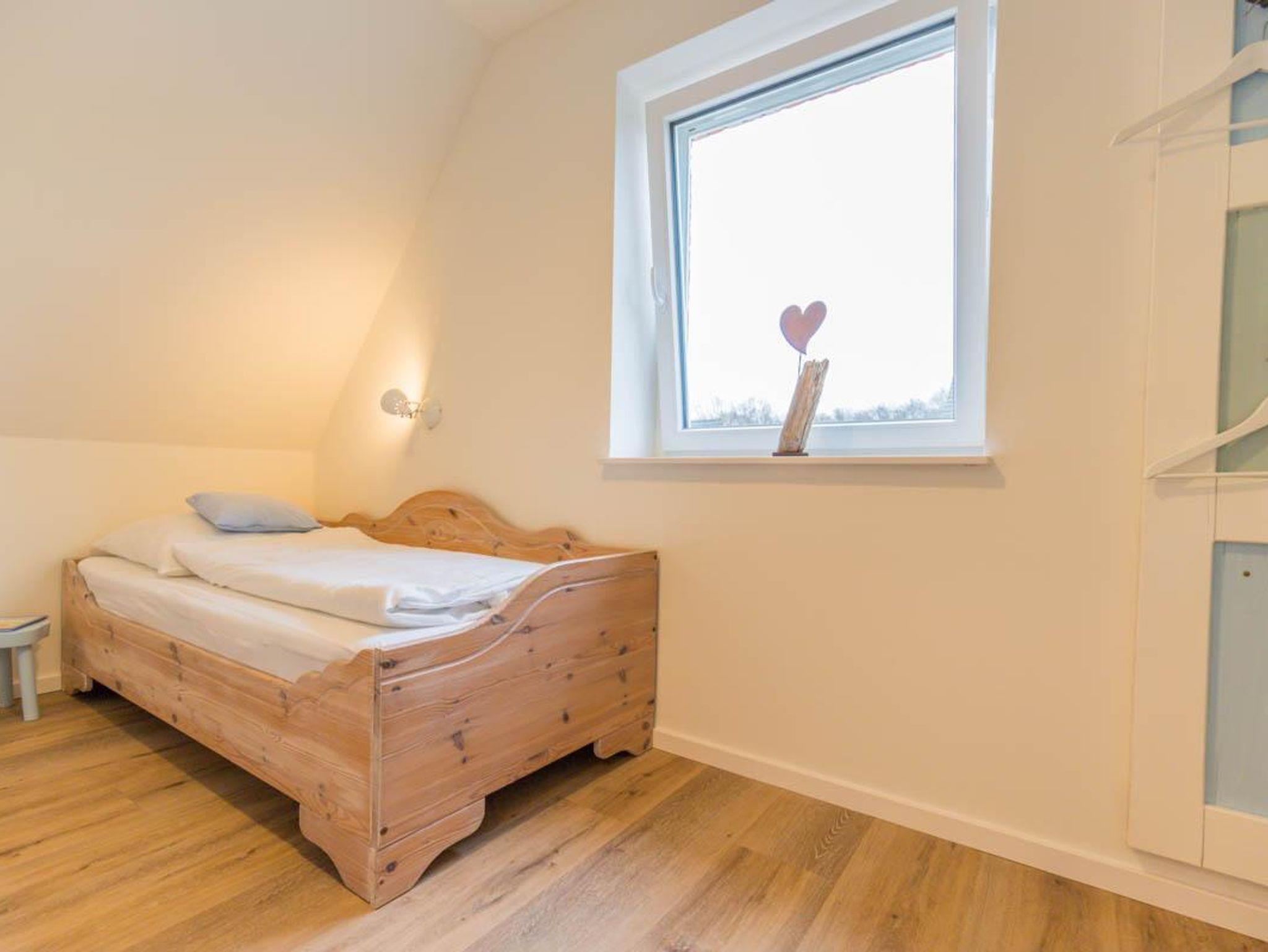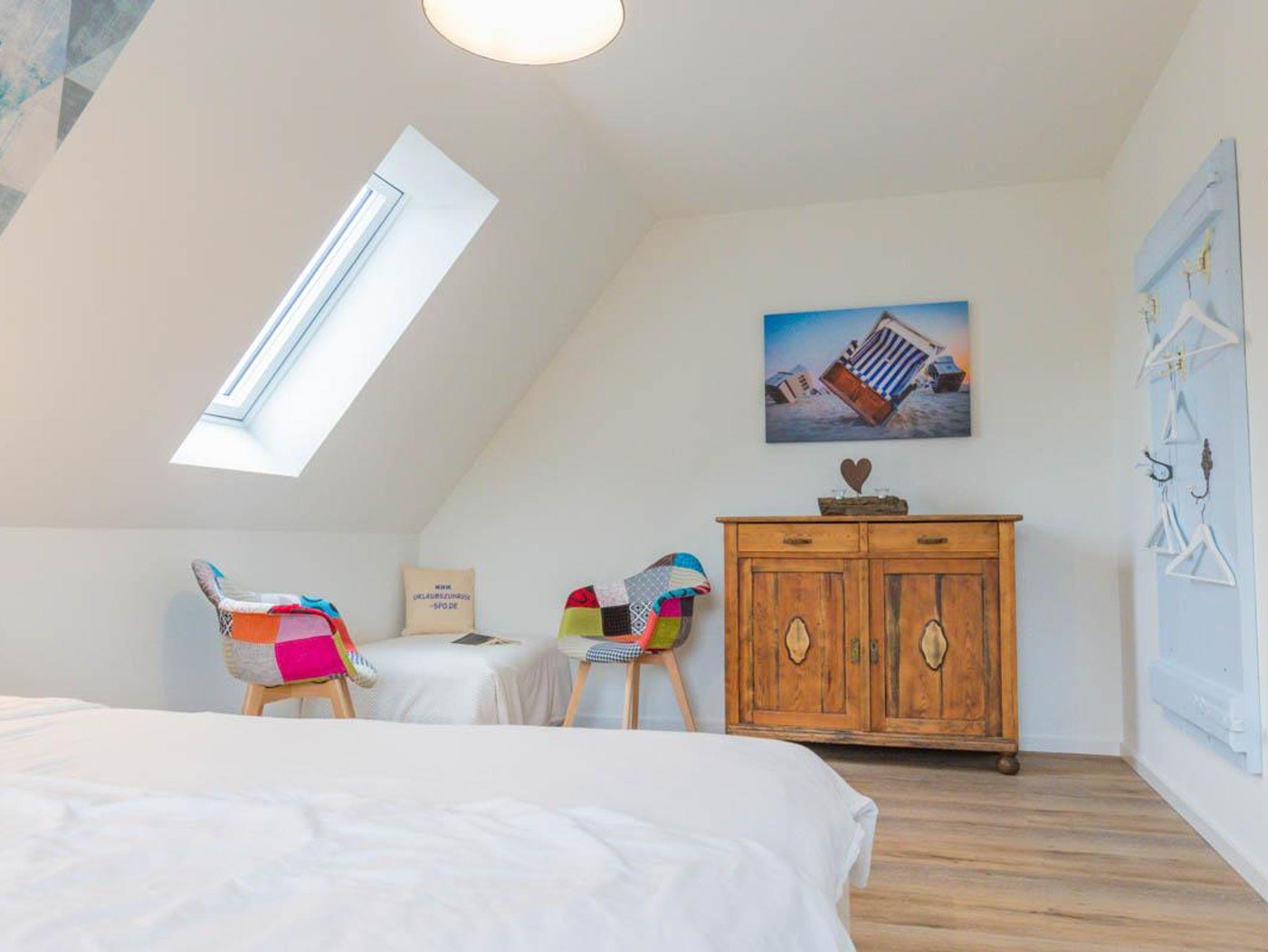 Die Schlafzimmer sind im Obergeschoss. Das eine Schlafzimmer ist eingerichtet mit einem Doppelbett (180x200cm) und Fernseher. Auf Anfrage kann für 25 Euro hier ein Schlafsofa für ein Kind oder ein Kinderbett hergerichtet werden. Das zweite Schlafzimmer hat zwei Einzelbetten (90x200cm).