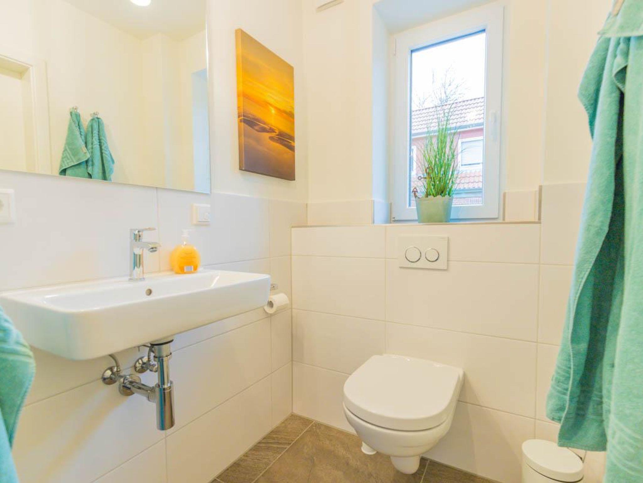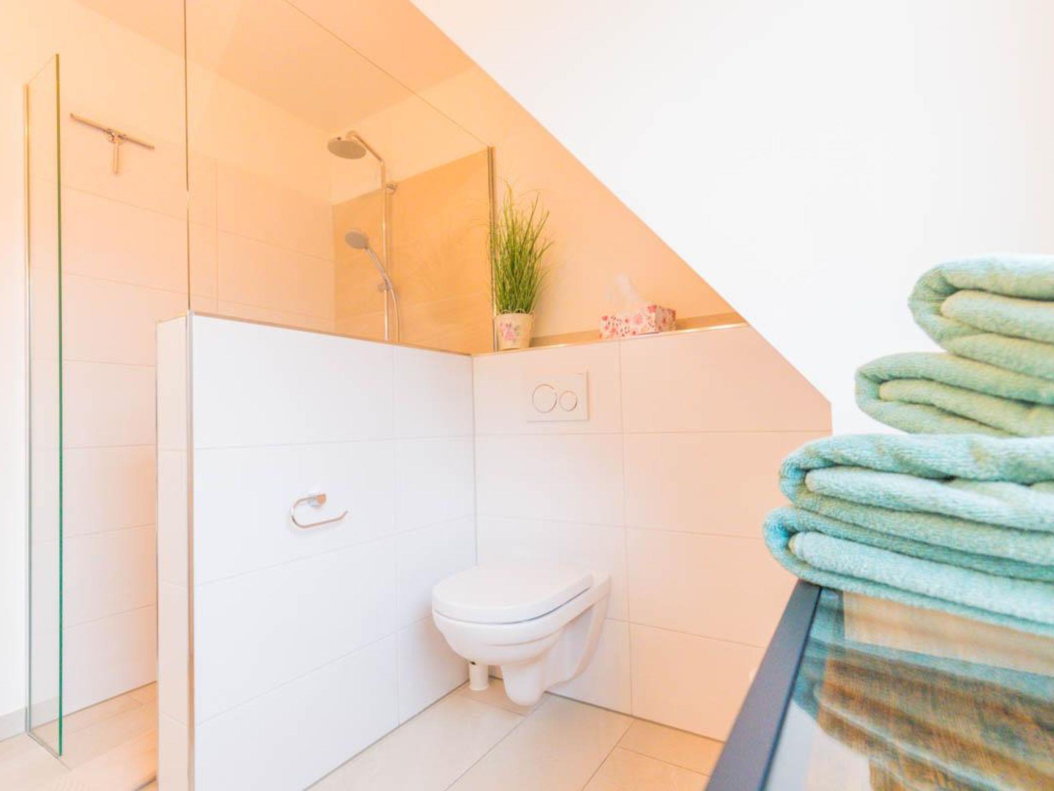 Ebenfalls im Erdgeschoss befindet sich ein Bad mit WC und bodengleicher Dusche und der Hauswirtschaftraum mit Waschmaschine.