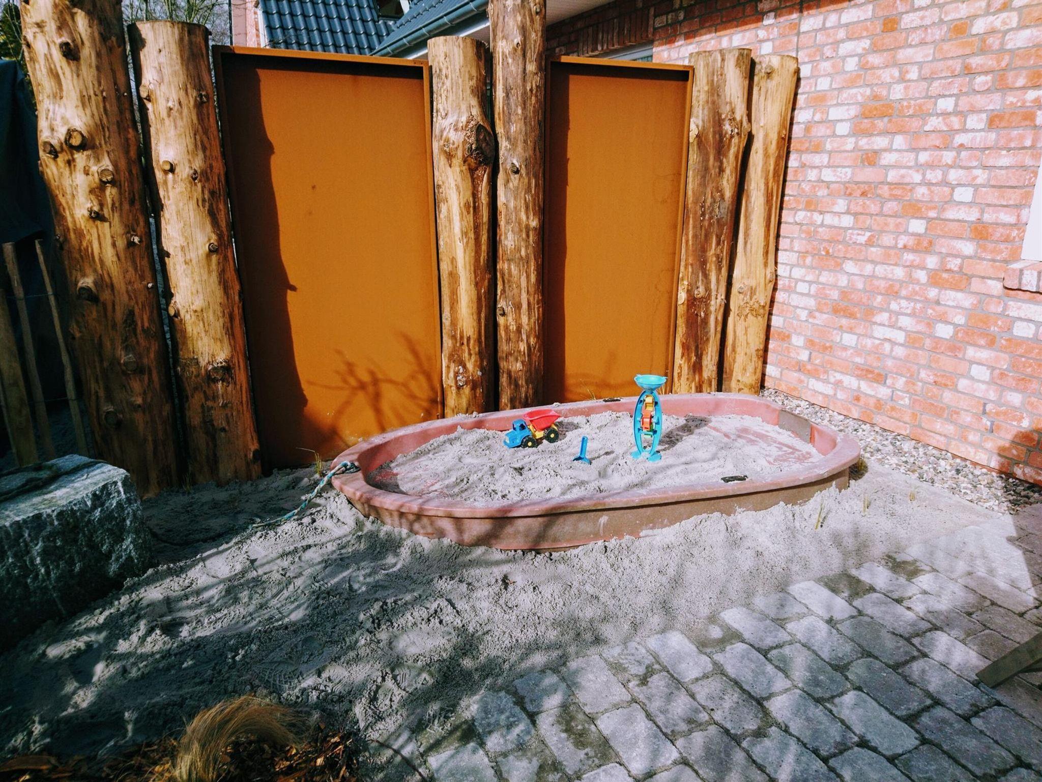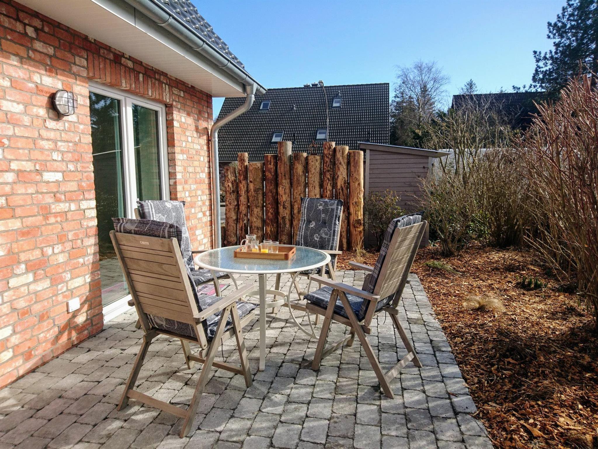 Die geschützte Terrasse lädt zu Sonnenbädern oder zu einem leckeren Grillabend (Holzkohlegrill vorhanden) ein, während die kleinen Kinder in der Bootssandkiste spielen.