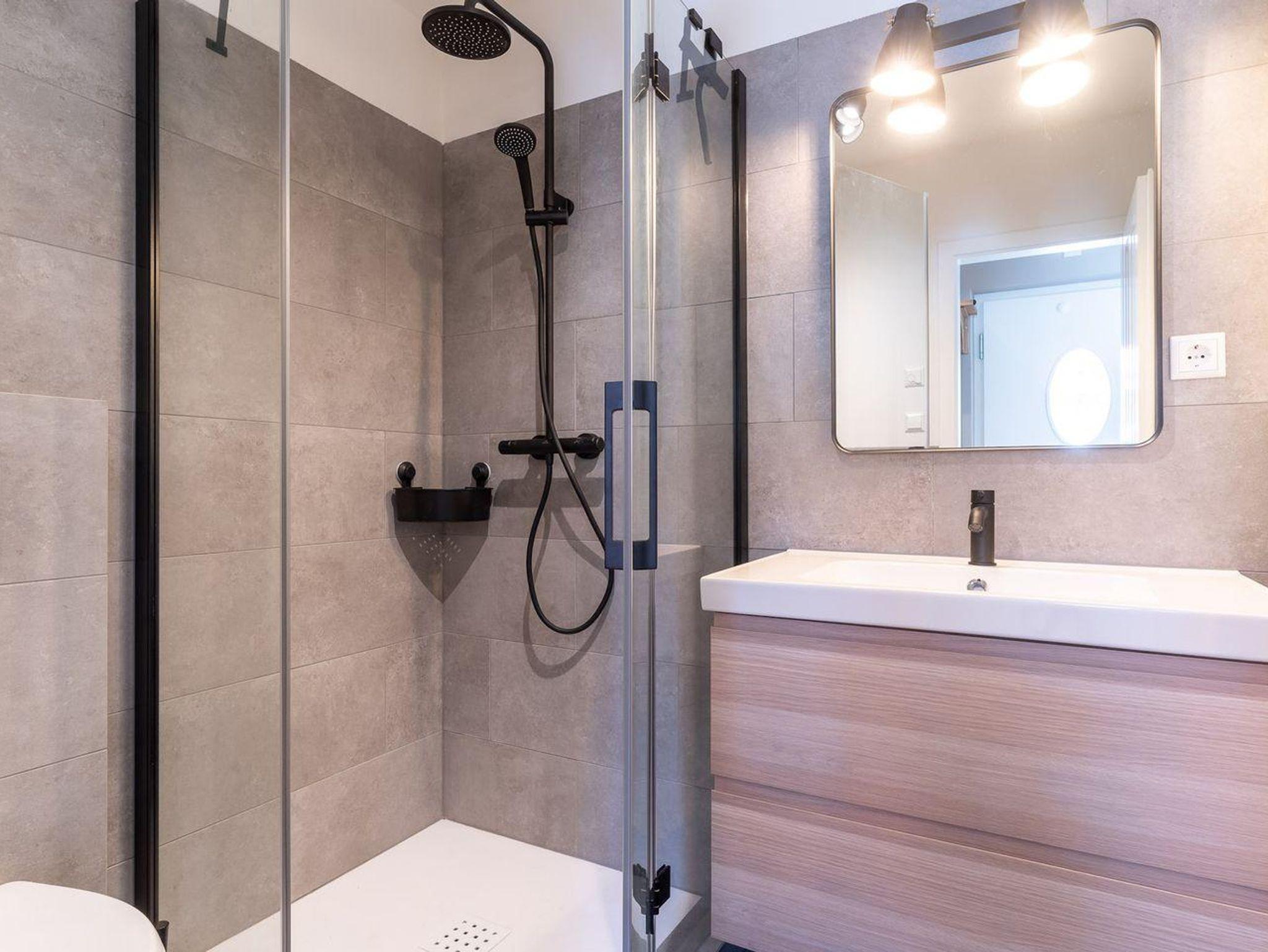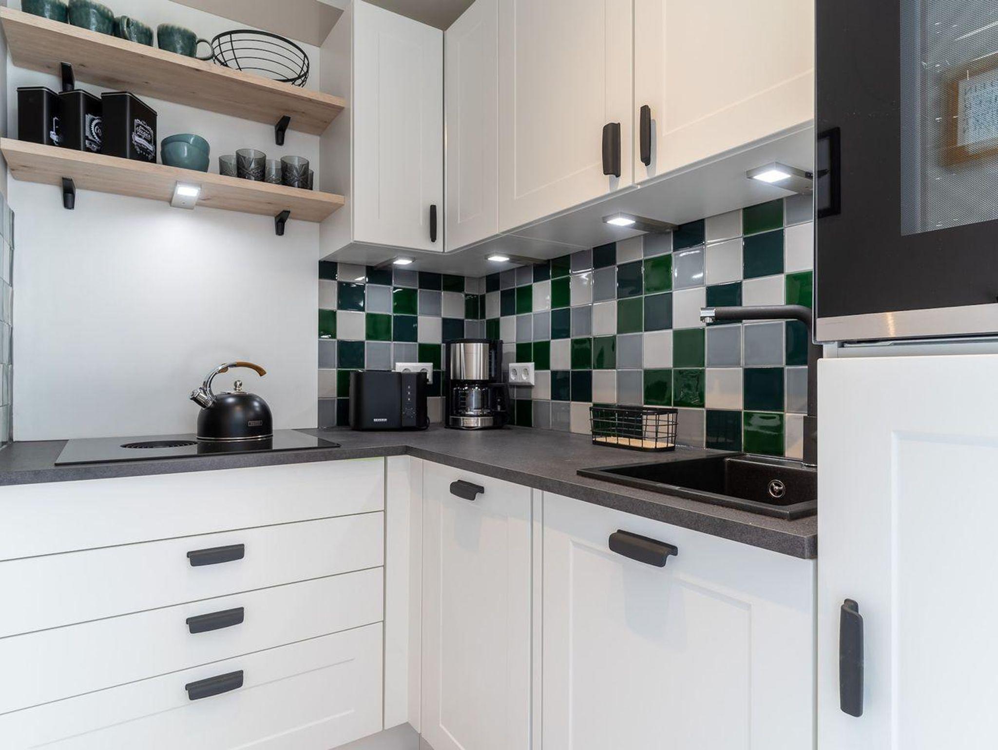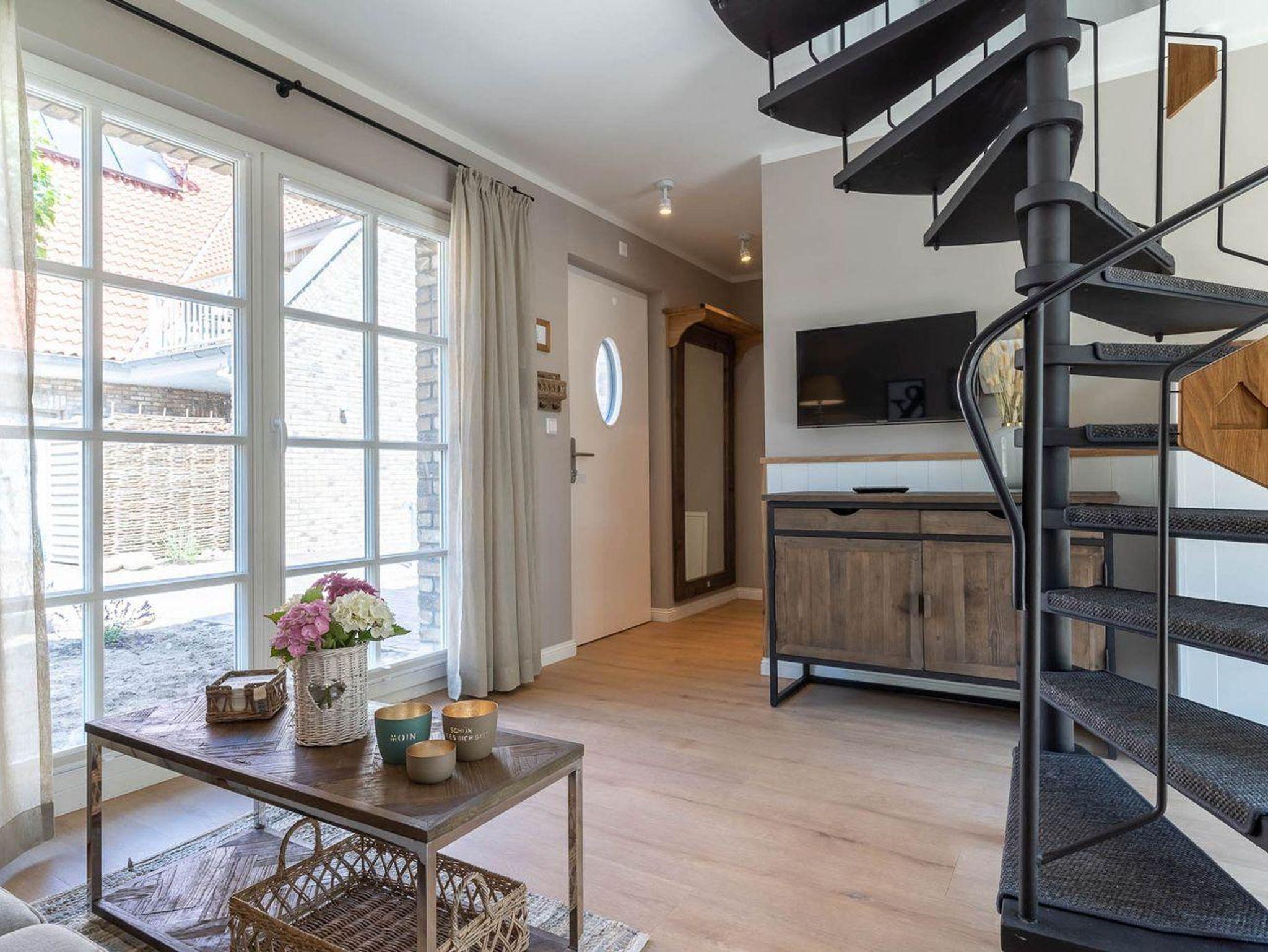 Im Erdgeschoss befindet sich ein großzügiger Wohnraum mit TV und einer modernen Wohnküche. Die Küche ist voll ausgestattet und verfügt über hochwertige Elektrogeräte.