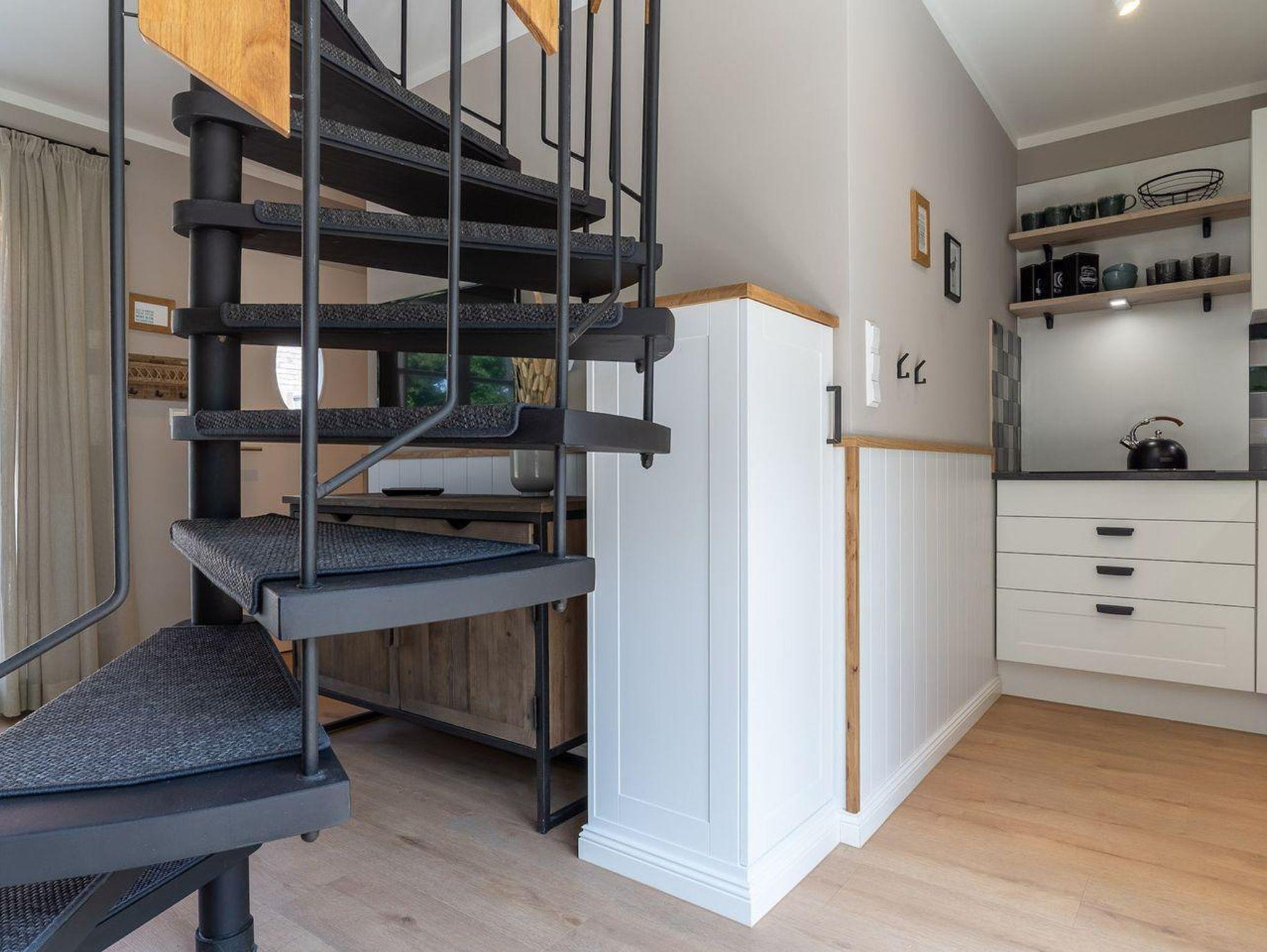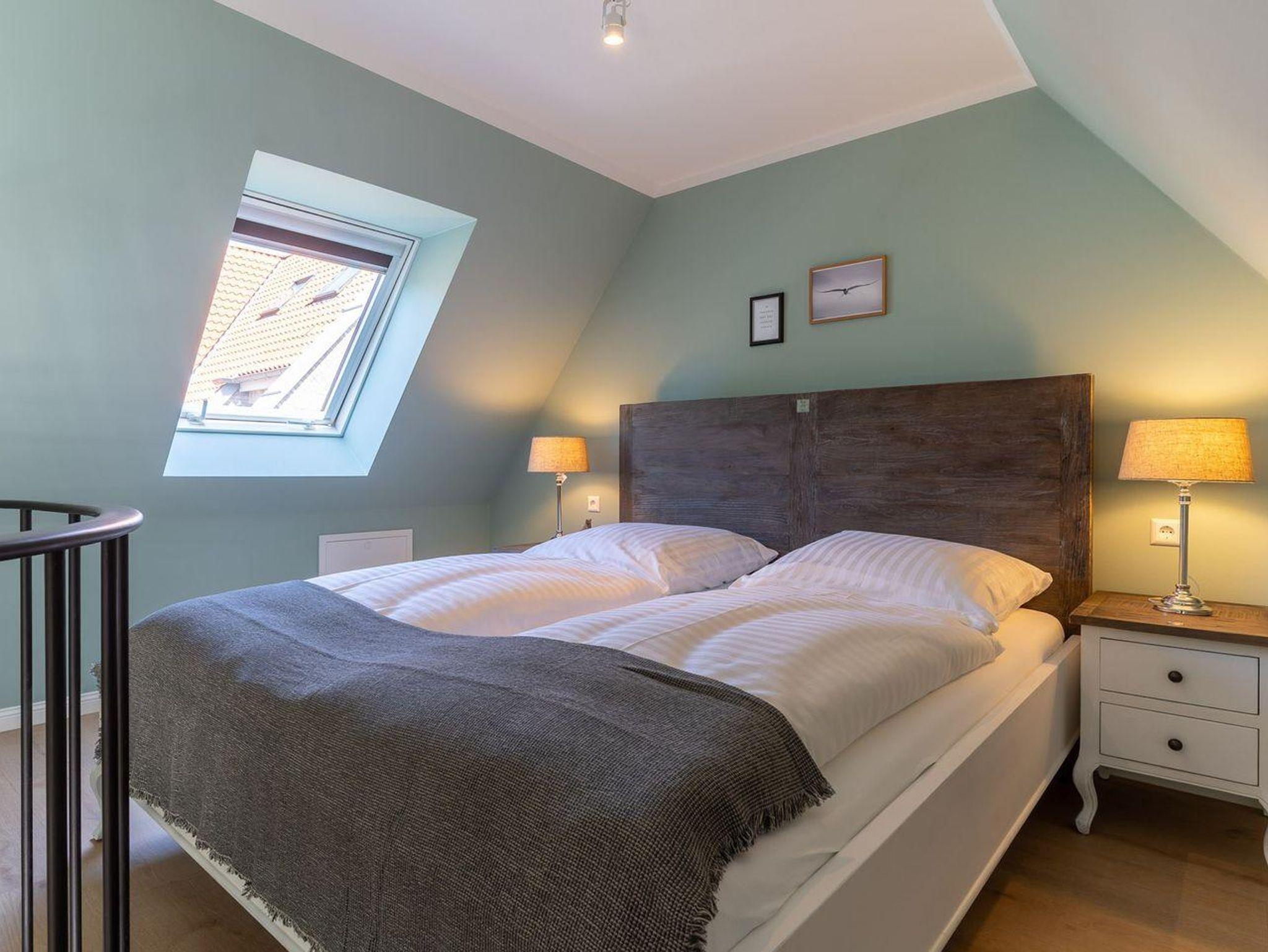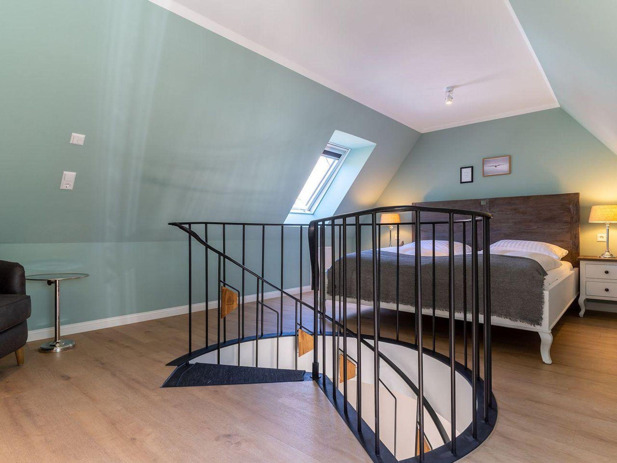 Über eine Wendeltreppe aus dem Wohnraum gelangt man in das Obergeschoss. Hier befindet sich das gemütliche Schlafzimmer mit einem Doppelbett.