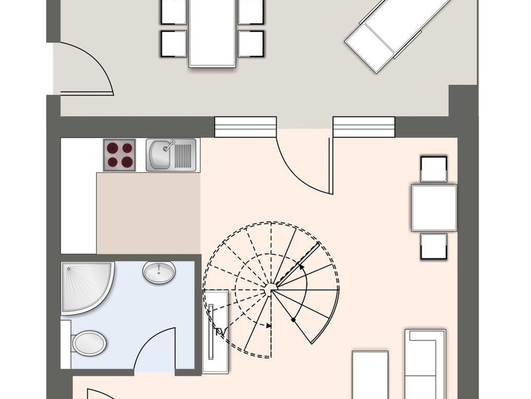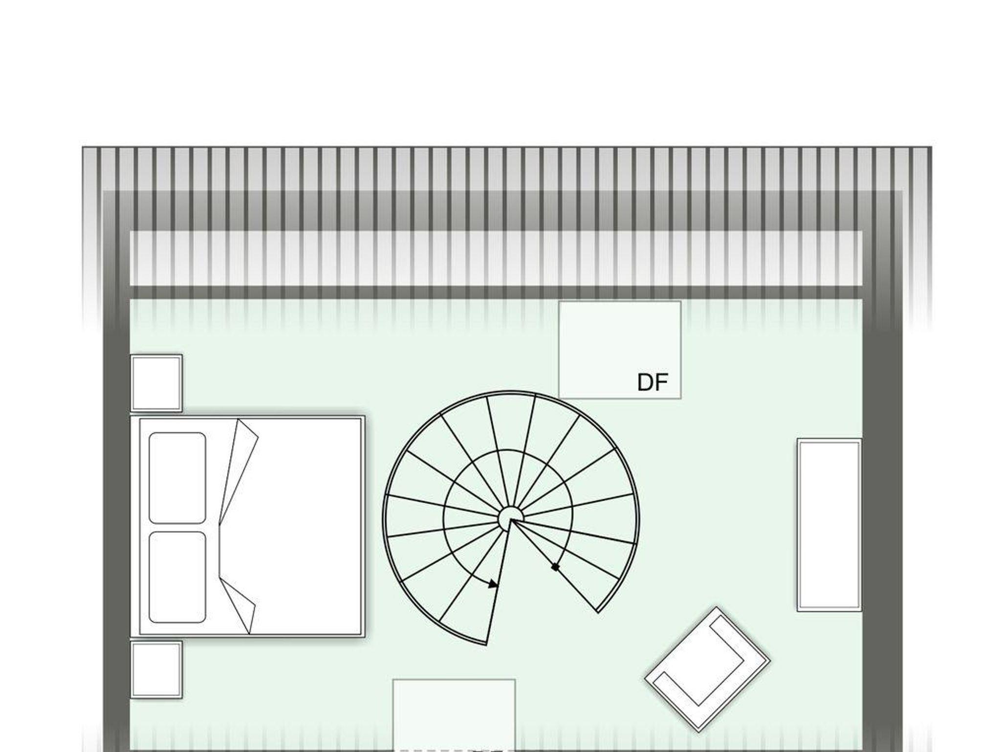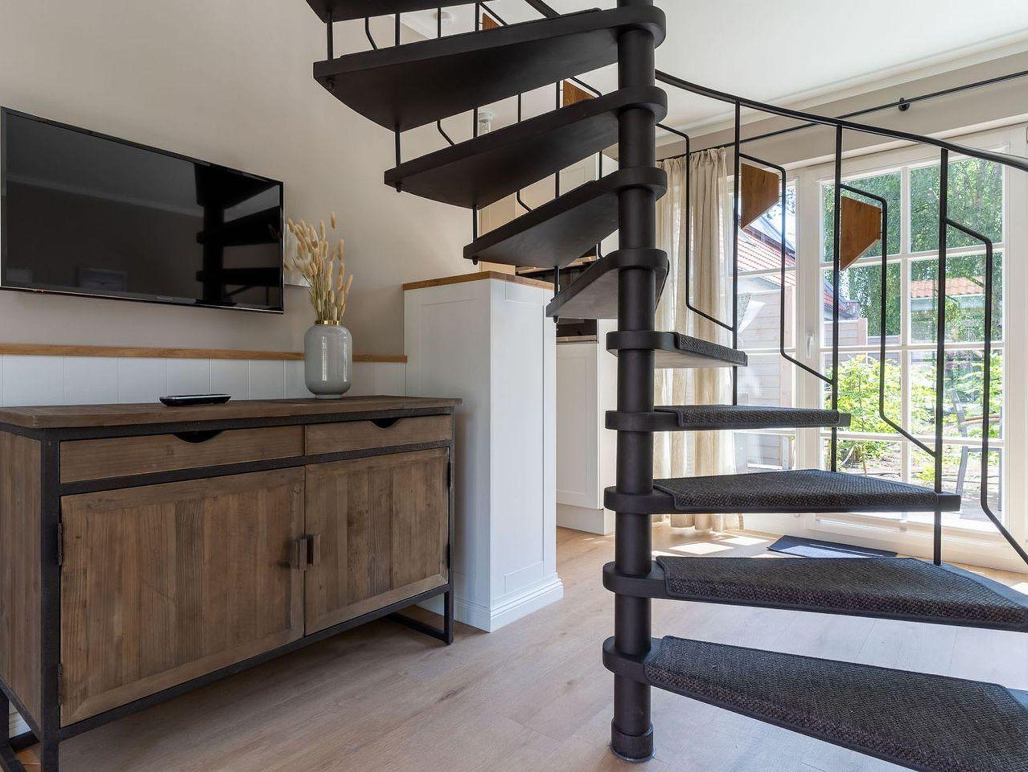 Über eine Wendeltreppe aus dem Wohnraum gelangt man in das Obergeschoss. Hier befindet sich das gemütliche Schlafzimmer mit einem Doppelbett.