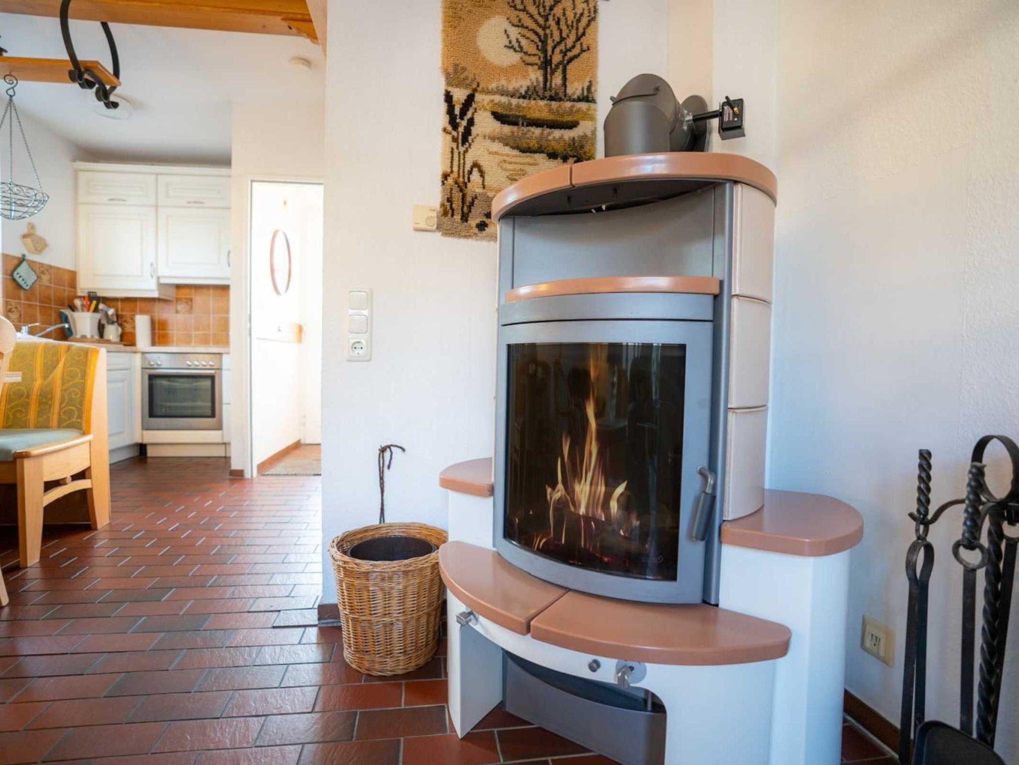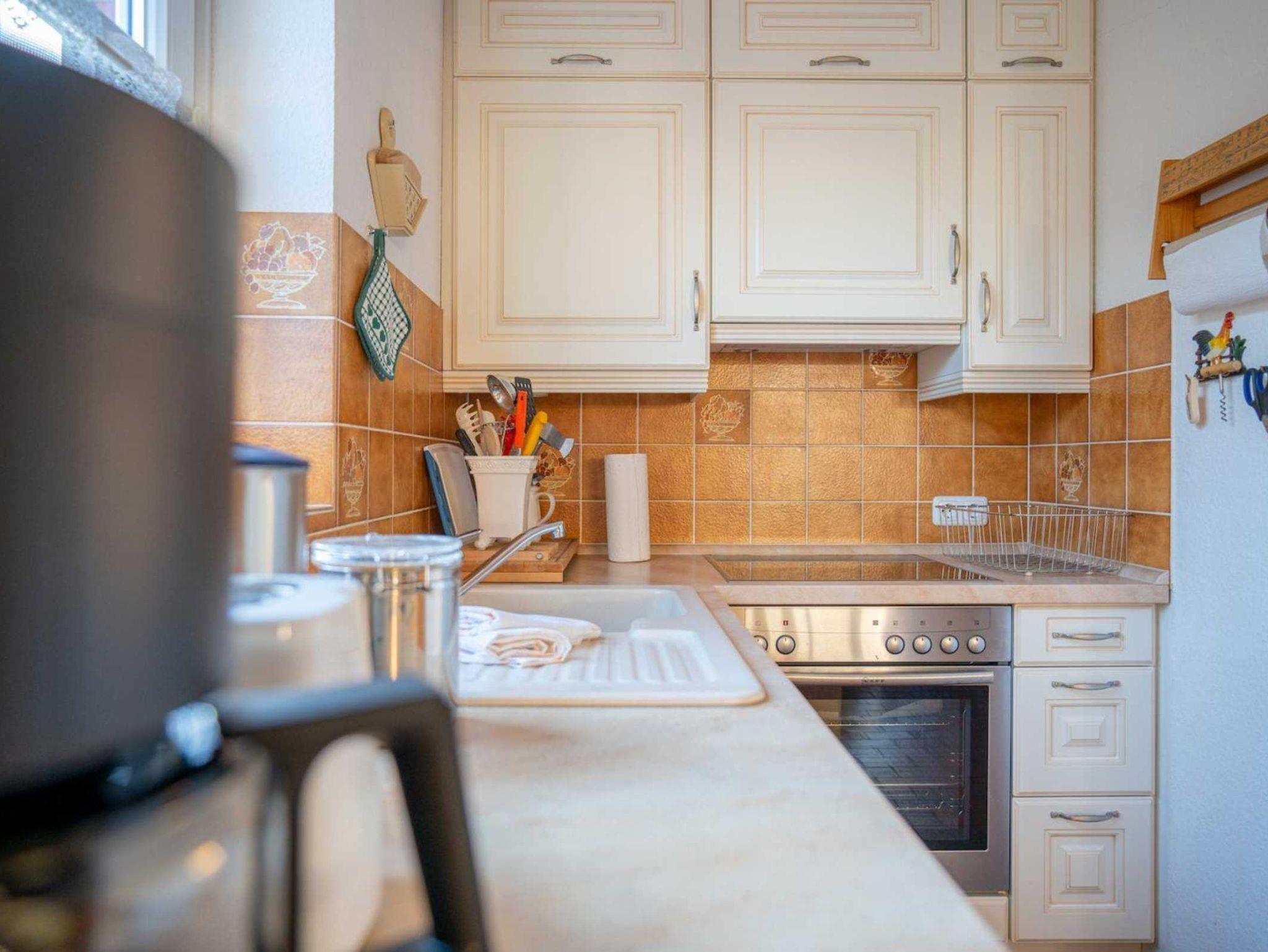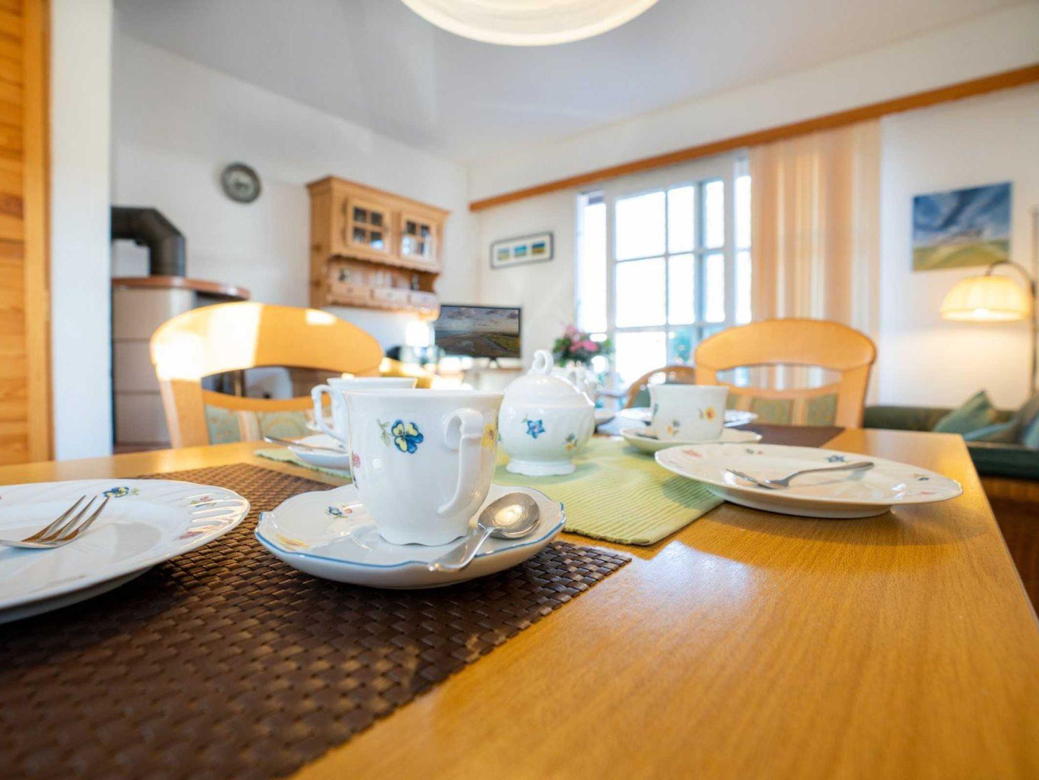 Wohnzimmer mit Sofa (2er), 2 Sesseln, TV (SAT), Stereo-Kompaktanlage, DVD-Player, Kaminofen und separatem Essbereich mit gemütlicher Eckbank und 2 Stühlen. Abstellkammer mit Staubsauger. Offene Küche mit Backofen, Kühlschrank mit Gefrierfach und Geschirrspüler. Direkter Zugang zur möblierten Terrasse nach Osten.