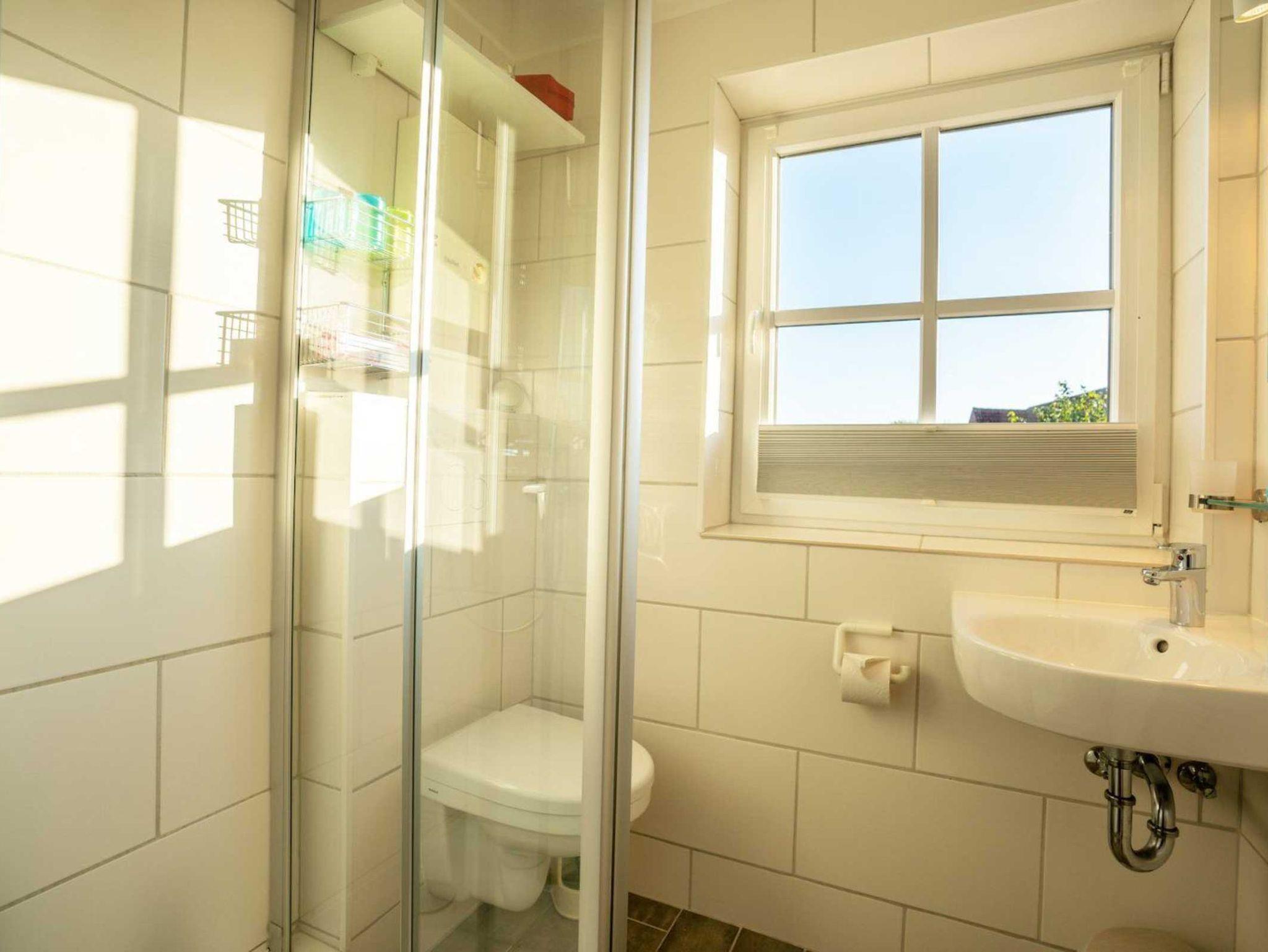 Badezimmer (Duschbad) mit Dusche, WC, Föhn und Tageslicht.