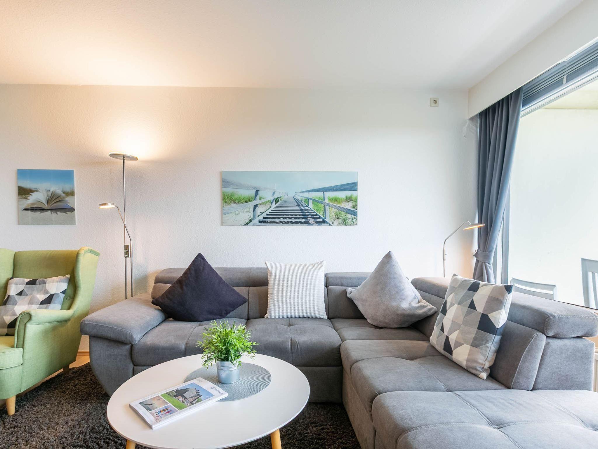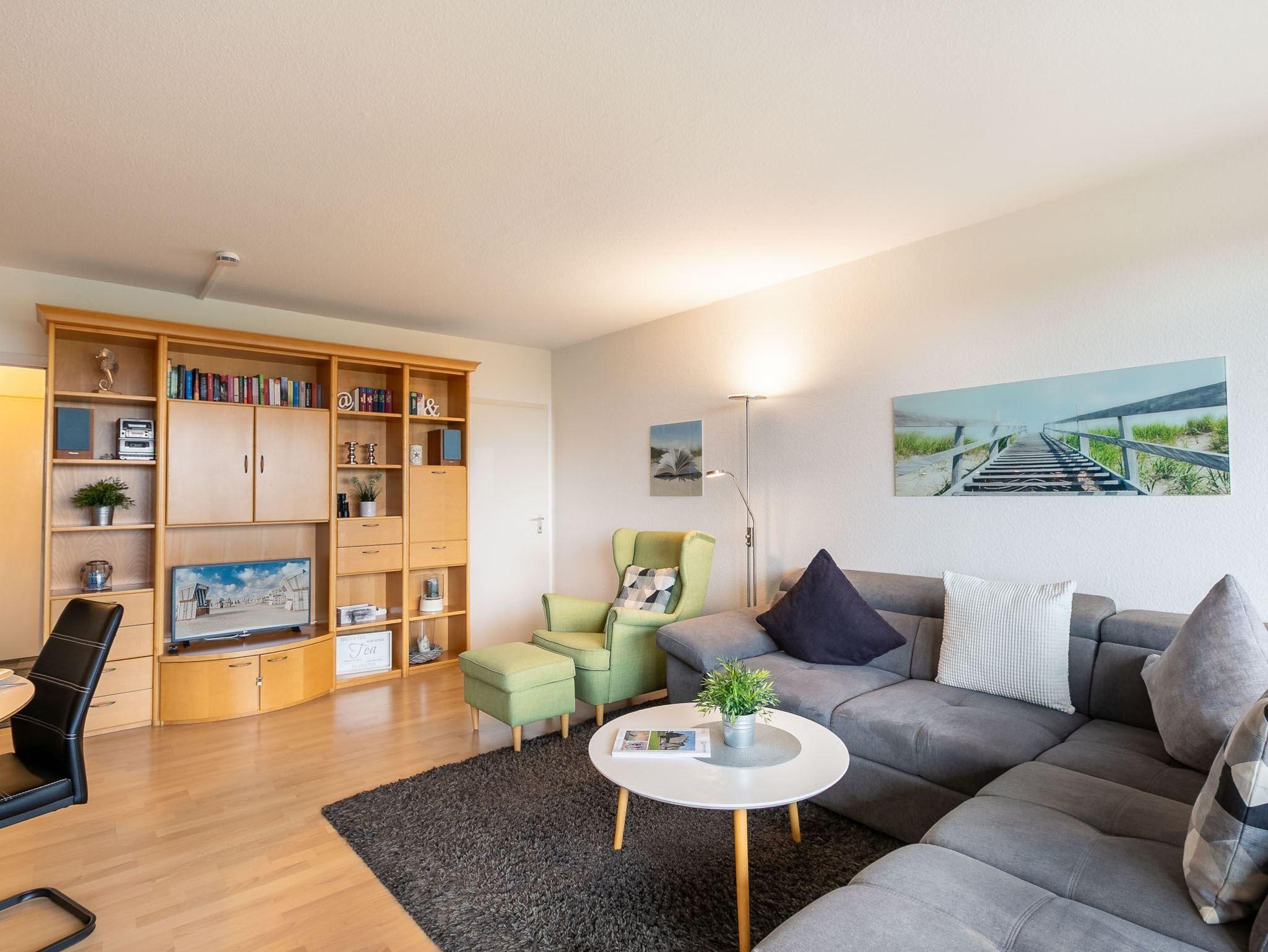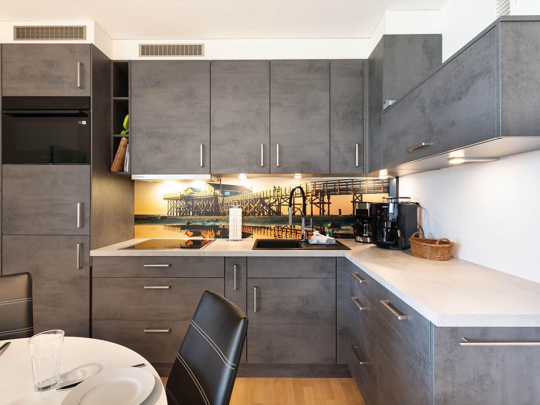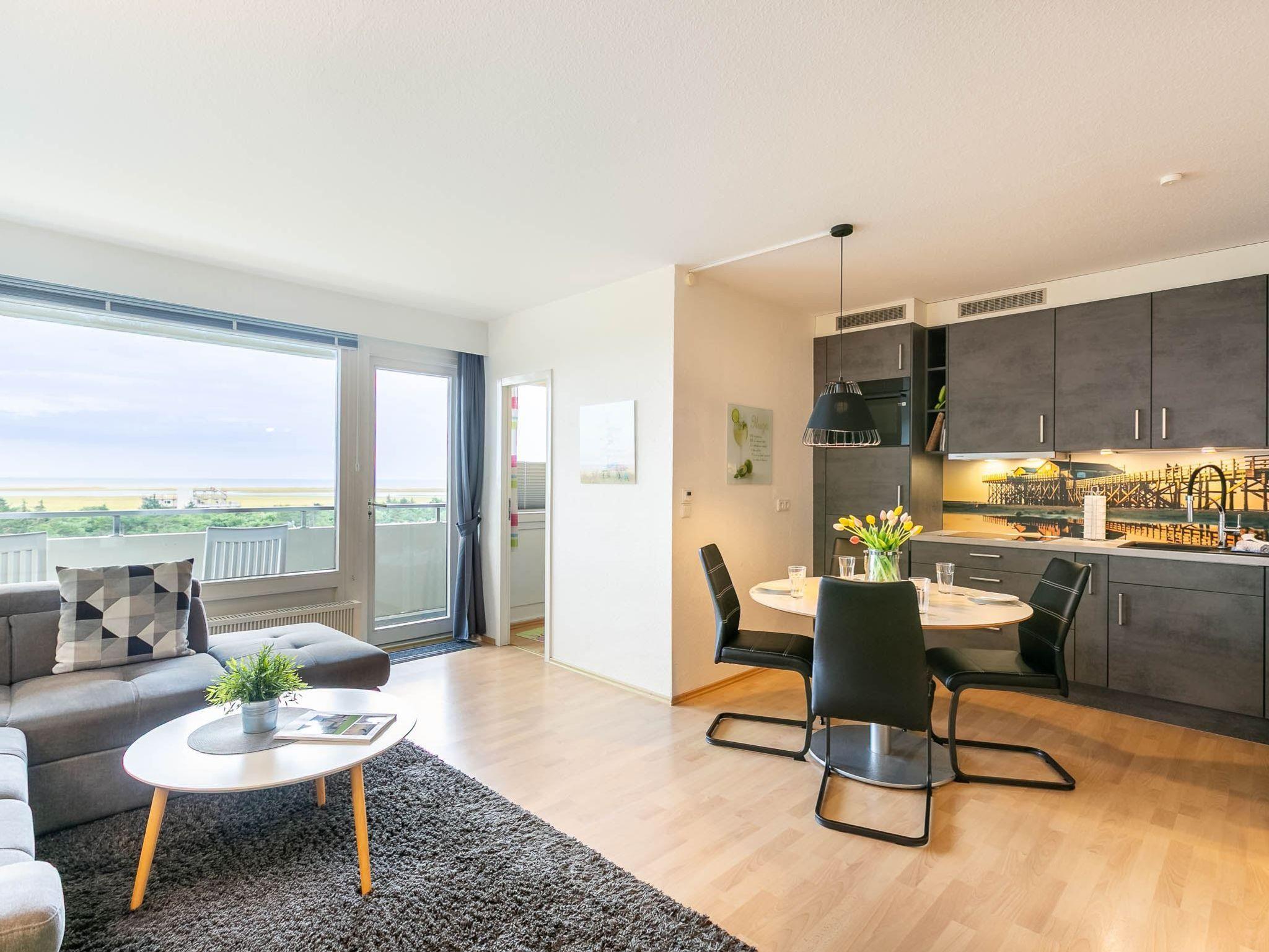 Wohnzimmer mit Ecksofa, sehr bequemem Ruhesessel, SMART-TV (Sat), Stereo-Kompaktanlage mit CD-Spieler und Esstisch mit 4 Stühlen. Direkter Zugang zum breiten, möblierten Balkon nach Südwesten. Einen Ort mit besserem Ausblick auf Nordsee, Strand und Sonnenuntergang werden Sie in St. Peter-Ording wahrscheinlich nicht finden. Offene Küche mit Backofen, Mikrowelle, Geschirrspüler und Kühl-Gefrier-Kombination.