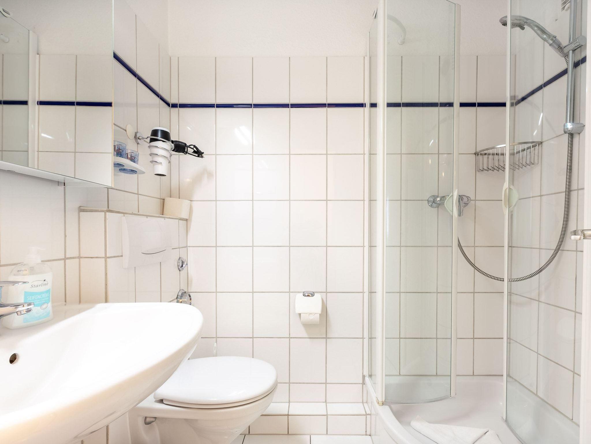 Badezimmer (Duschbad) mit Dusche, WC, Föhn und Handtuchwärmer.