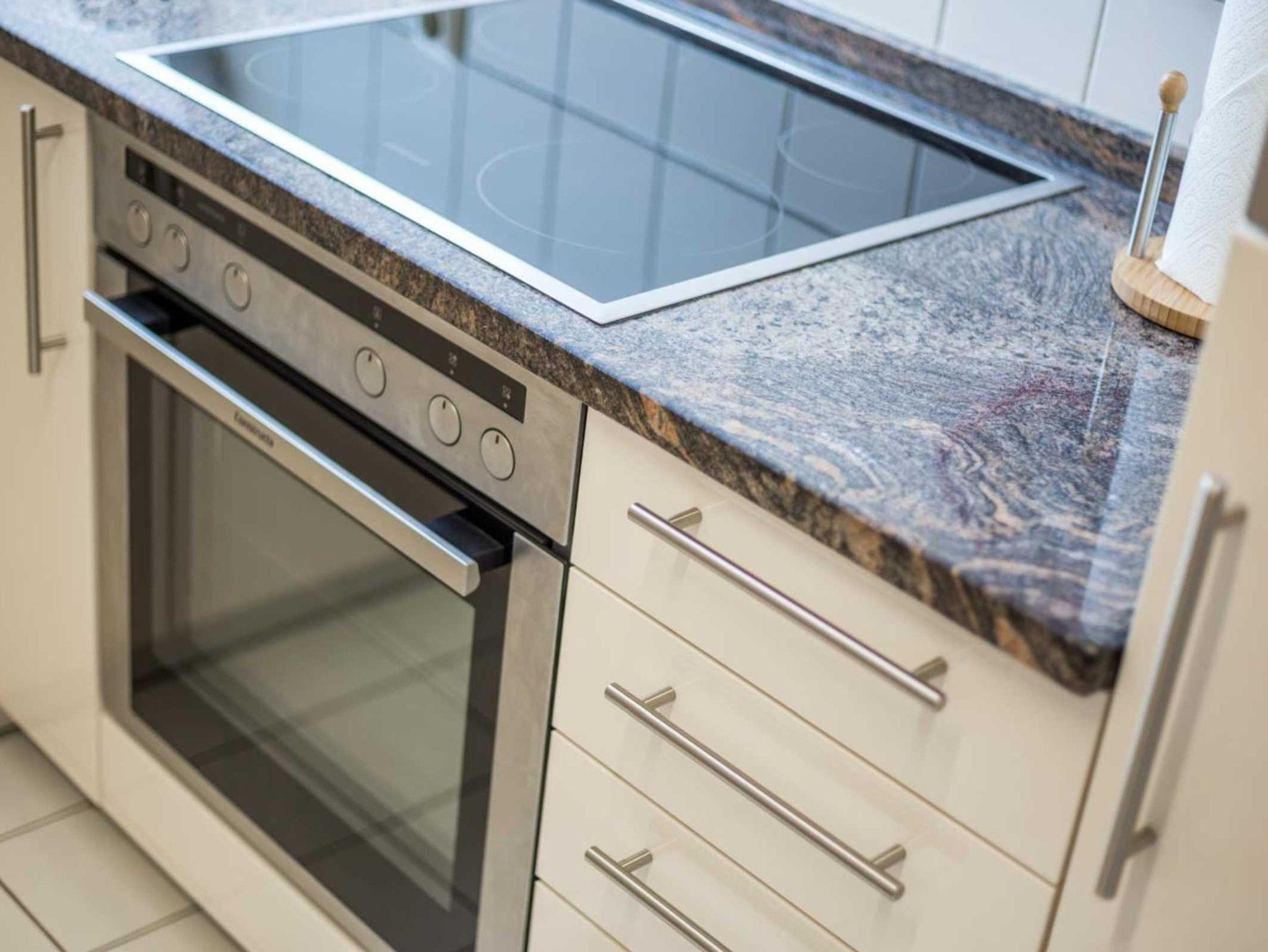 Separate Küche mit Backofen, Mikrowelle, Kühlschrank mit Gefrierfach, Geschirrspüler und Esstisch mit 4 Stühlen.