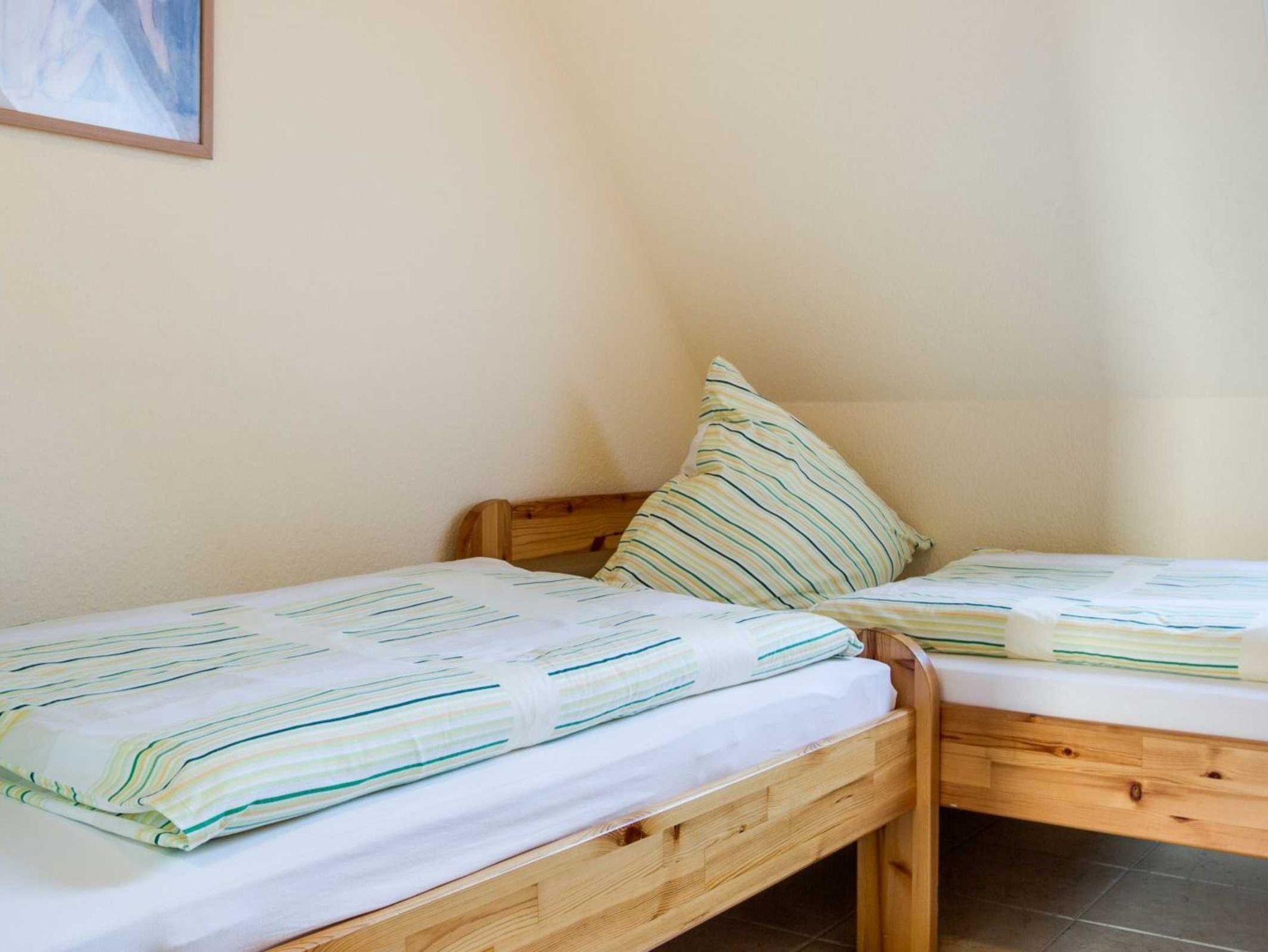 Schlafzimmer mit 2 Einzelbetten (90x190cm, 90x200cm), Kleiderschrank und 2 Stühlen.