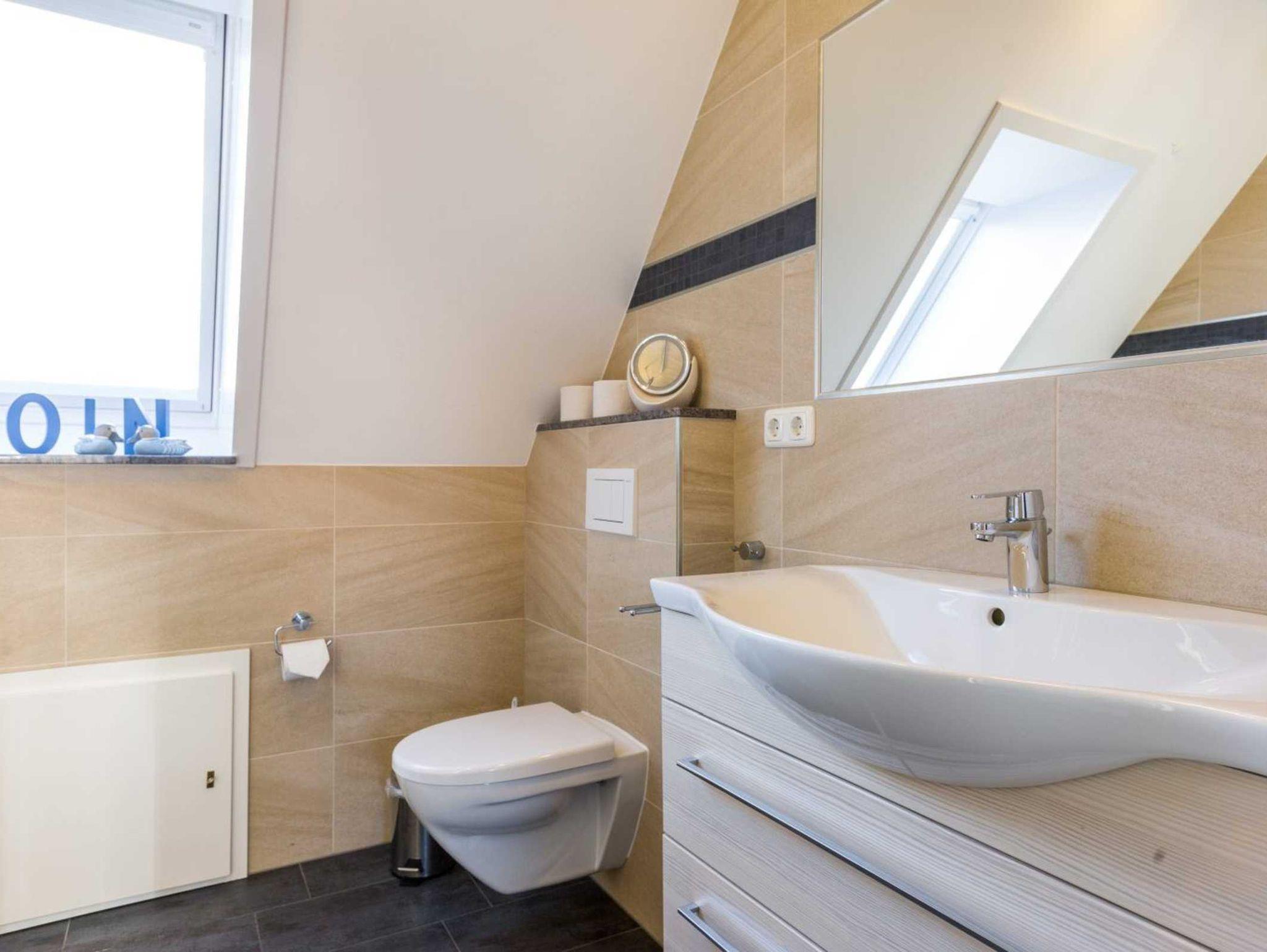 Badezimmer (Duschbad) mit Dusche, WC, Tageslicht und Föhn.