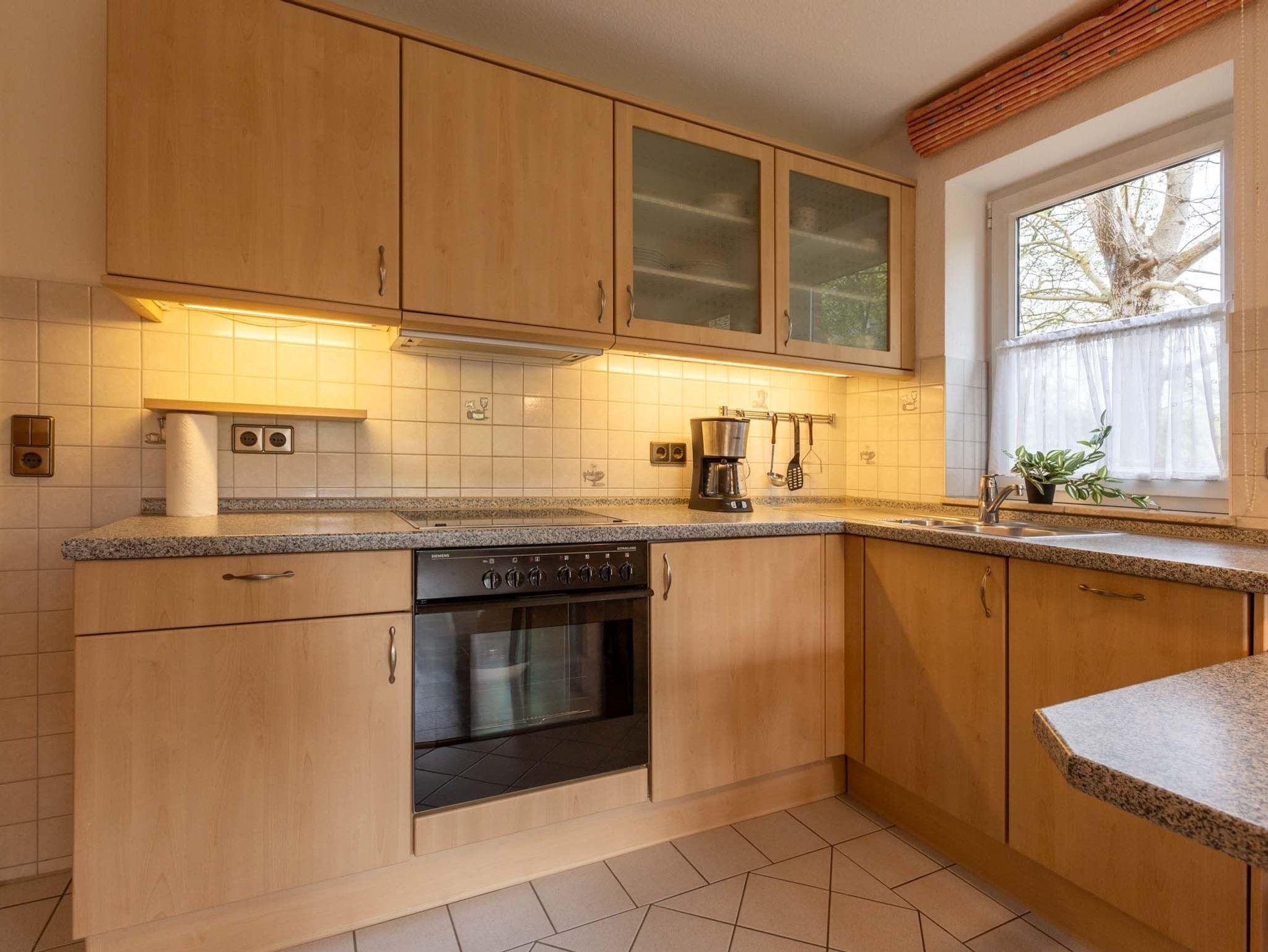 Wohnzimmer mit ausziehbarem (Schlaf-) Sofa (160x200cm), Sessel, SMART-TV (Sat) und Esstisch für 2 Personen. Direkter Zugang zur möblierten Südterrasse. Offene Küche mit Backofen, Geschirrspüler und Kühlschrank mit Gefrierfach.
